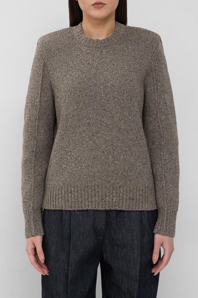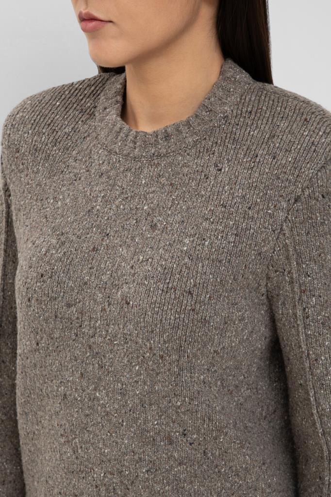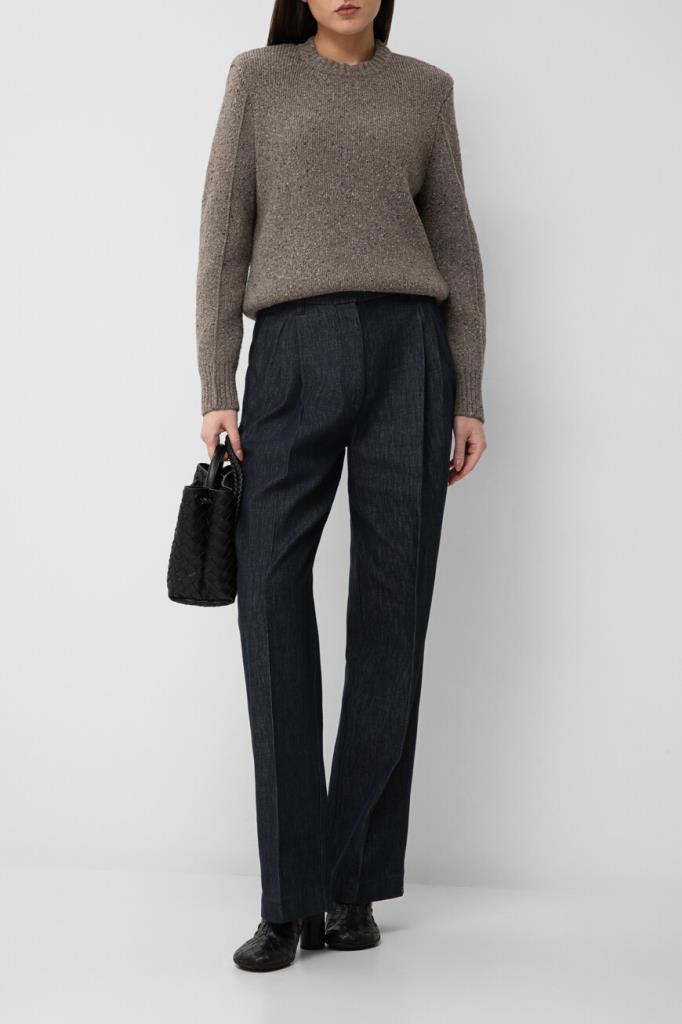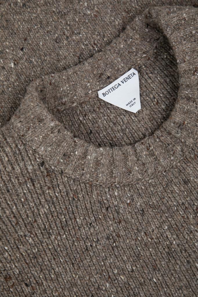 Вязаный свитер BOTTEGA VENETA с невысоким воротником-стойкой. Модель изготовлена из мягкой эластичной пряжи на основе шерсти, прочного нейлона и вискозного волокна лицевой гладью. Горловина, манжеты рукавов и широкий пояс оформлены резинкой. Для создания органичного комплекта носите изделие с брюками с классическими стрелками и защипами сверху из той же коллекции.