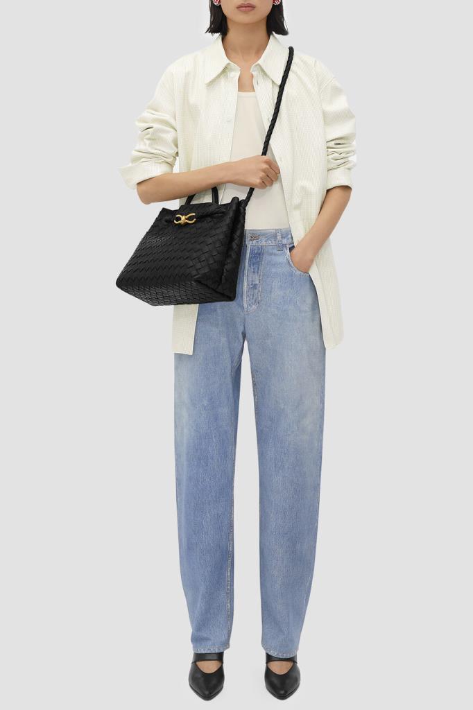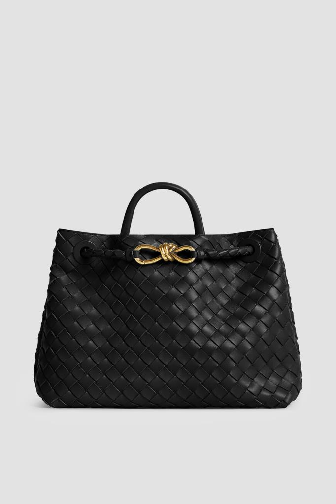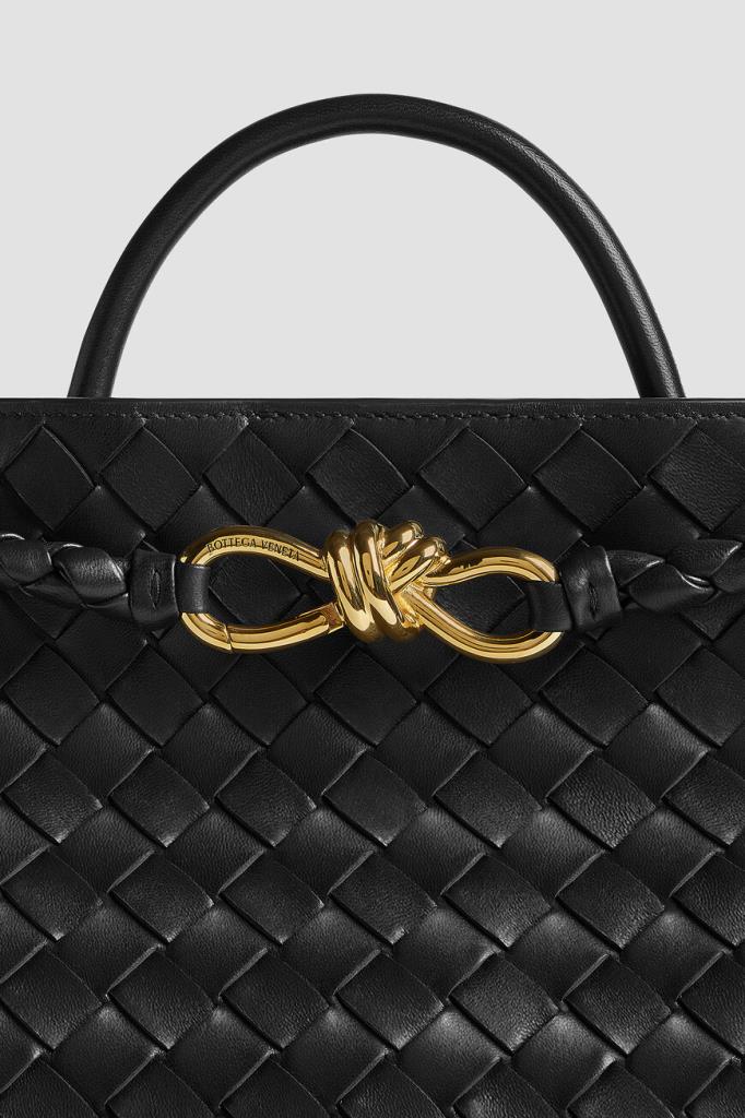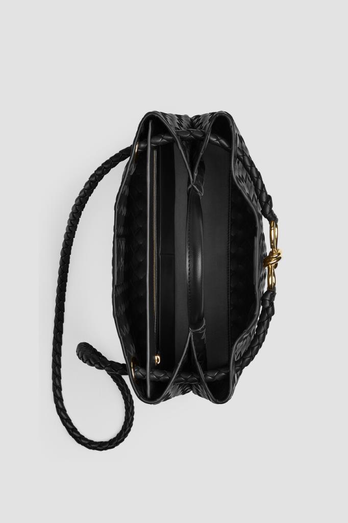 Кожаная сумка Andiamo от BOTTEGA VENETA. Поверхность изделия чёрного цвета покрыта плетёным геометрическим мотивом в старинной технике «Intrecciato». Внутренняя часть аксессуара представляет собой два отделения разной ширины, разделённые гладкой кожаной перегородкой. О принадлежности модели среднего размера Дому напоминает крупная декоративная деталь в виде узла из латуни золотого оттенка, размещённая спереди на длинном плетёном ремешке для переноски, продетом сквозь боковины.