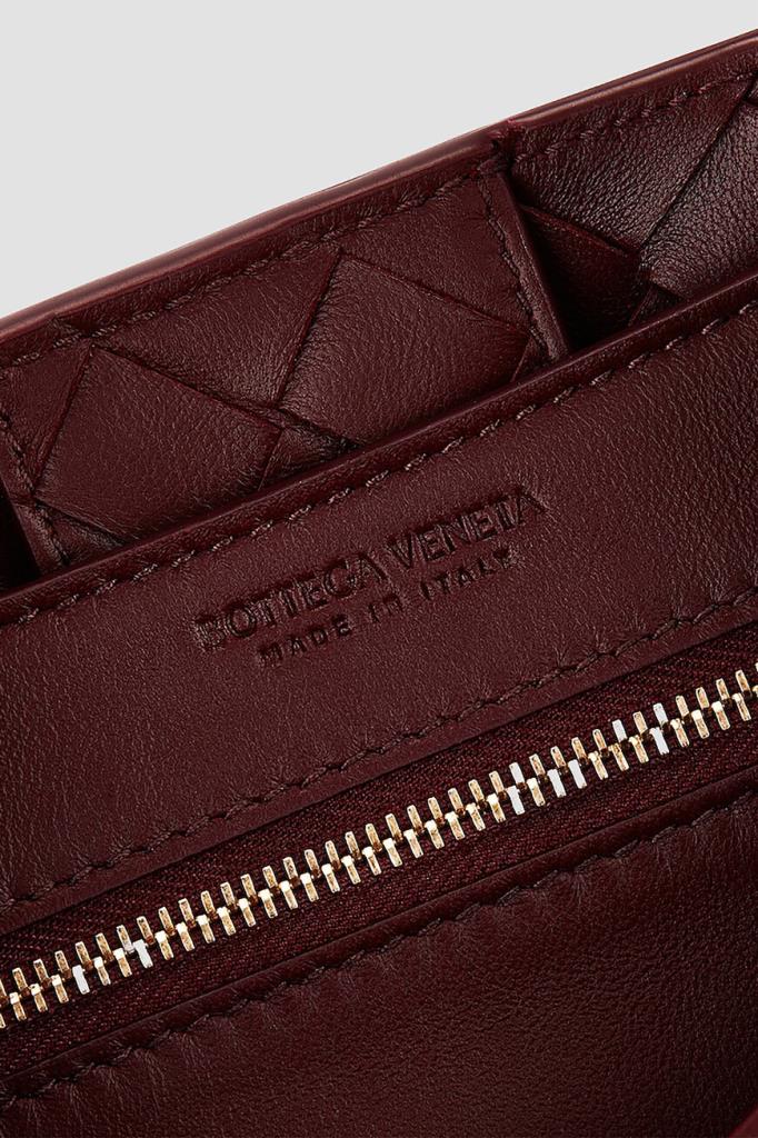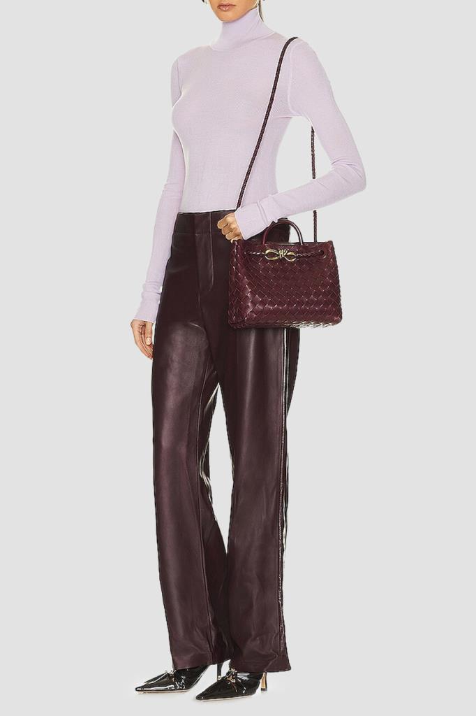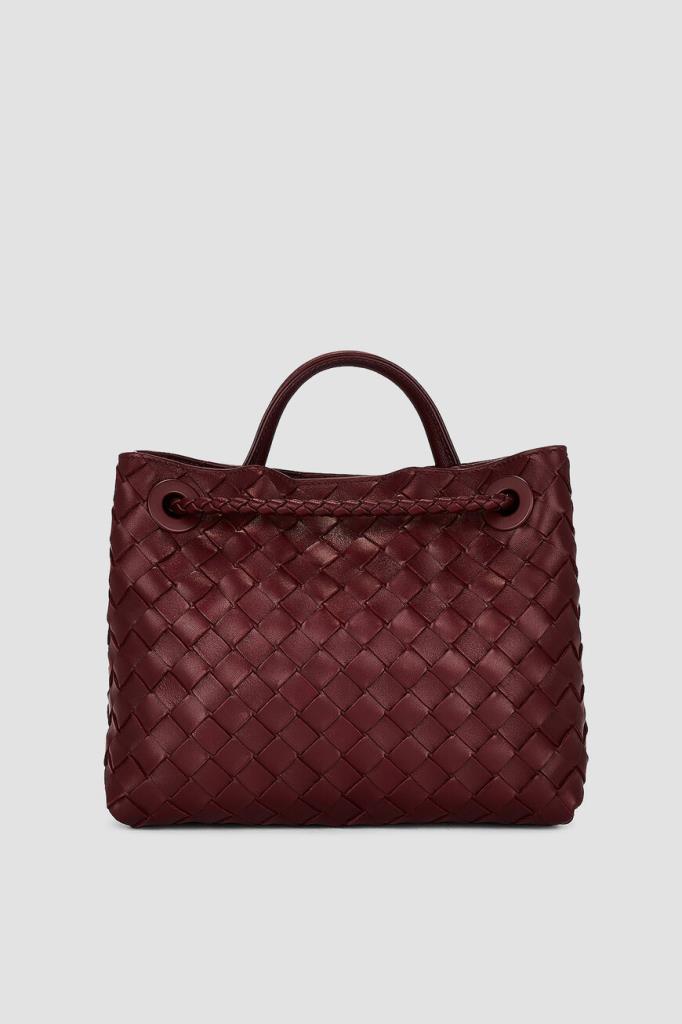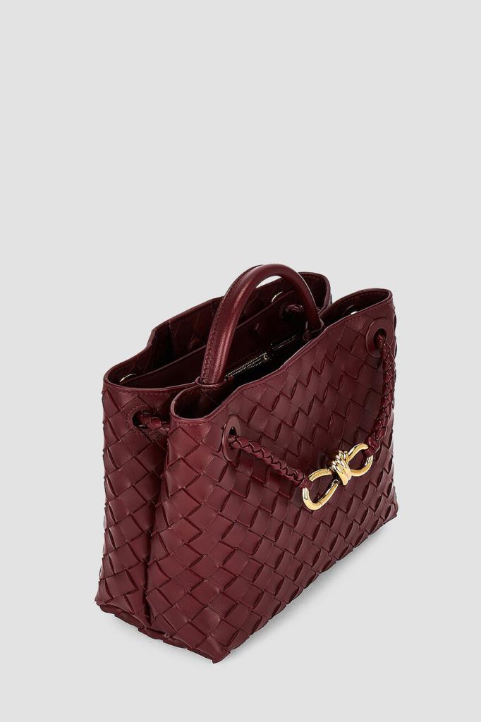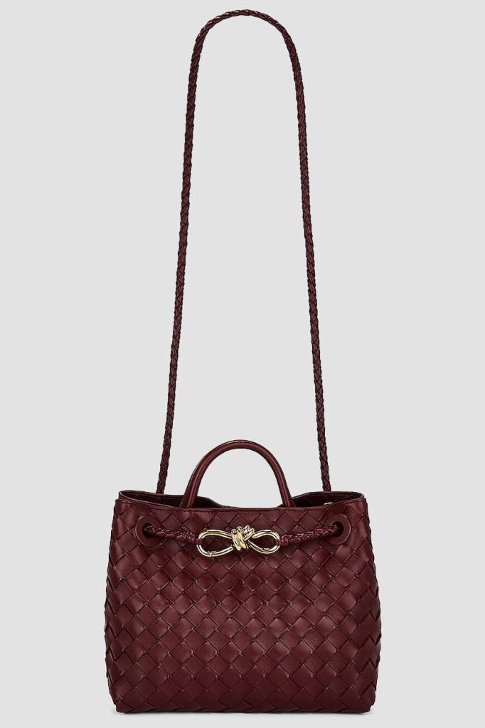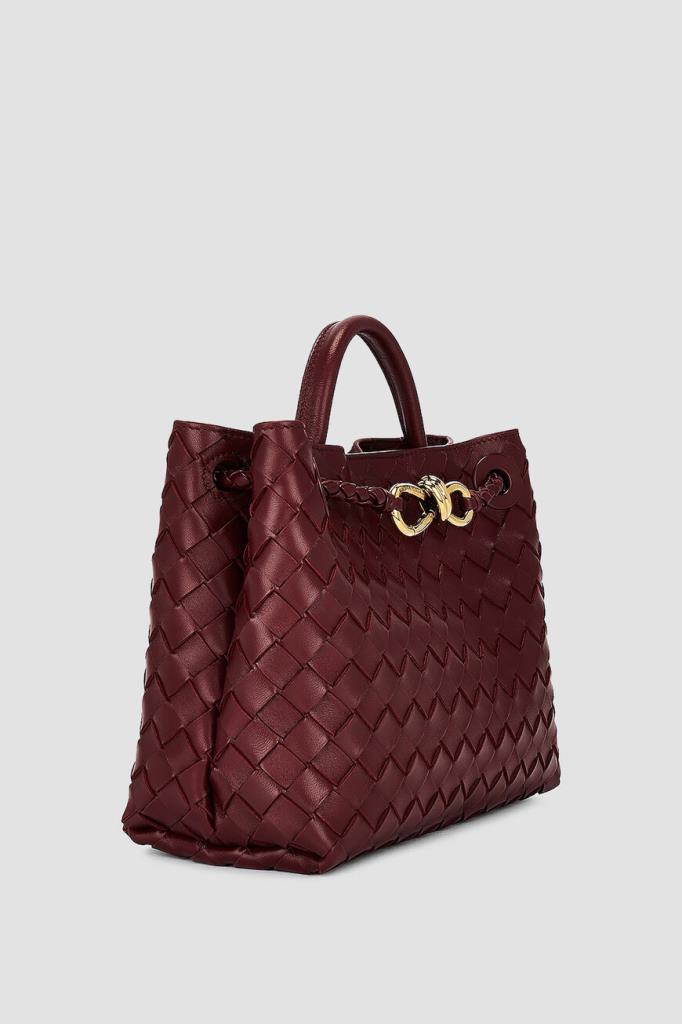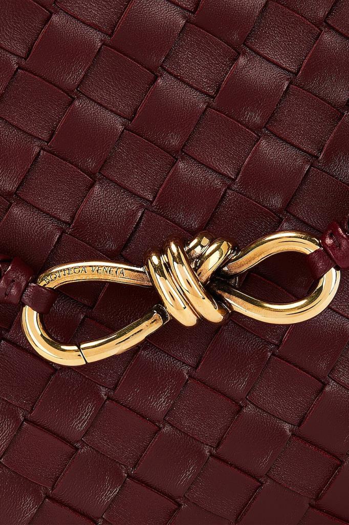 Бордовая сумка Andiamo маленького формата от BOTTEGA VENETA. Аксессуар изготовлен из мягкой кожи наппа с фирменным плетением «Intrecciato». Изделие интересно наличием длинного плетёного ремешка для переноски, продетого сквозь боковины. Лицевую стенку украшает крупная декоративная деталь в виде узла из латуни светло-золотого оттенка, размещённая на ремешке.