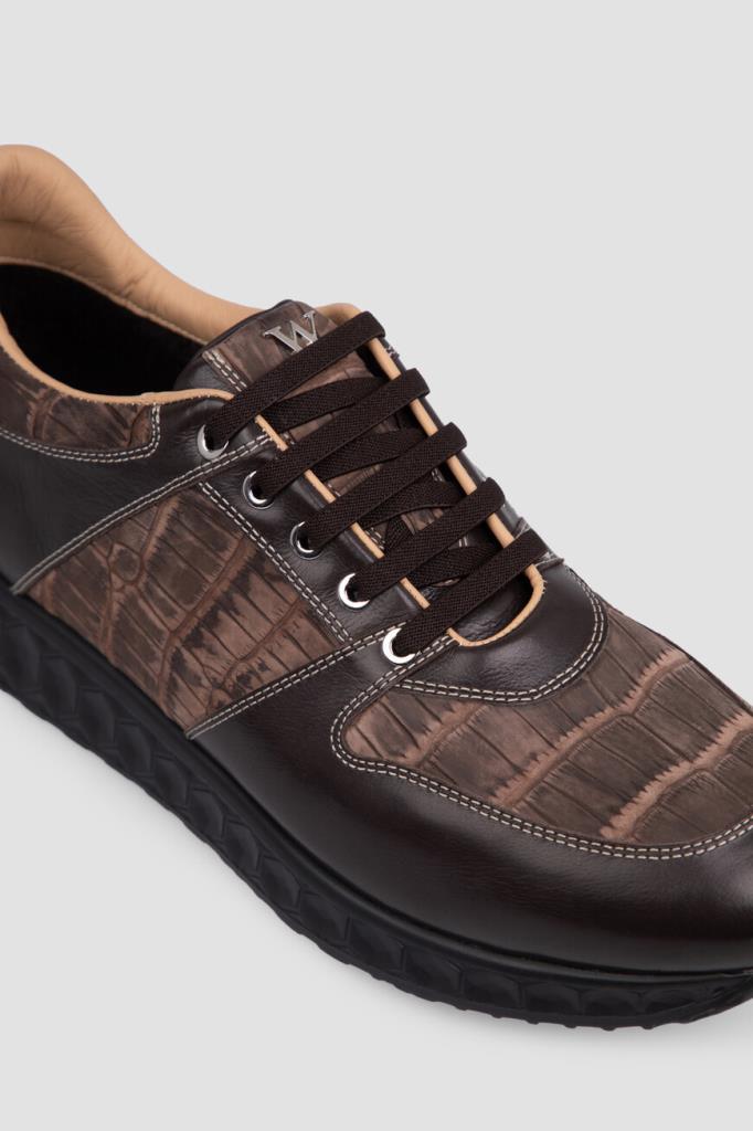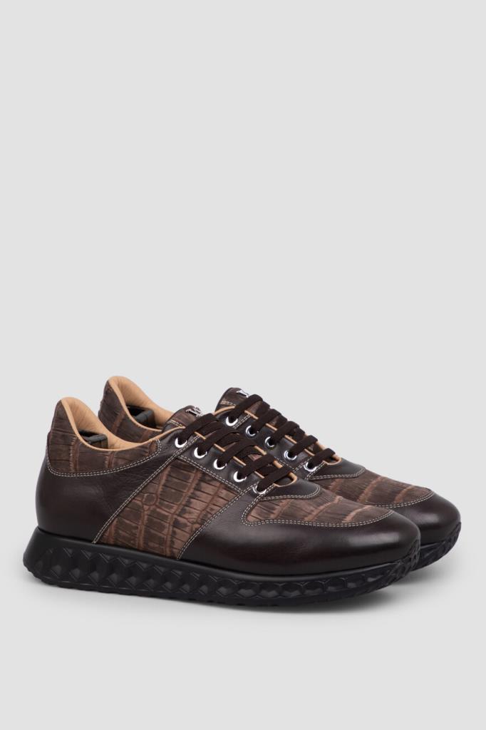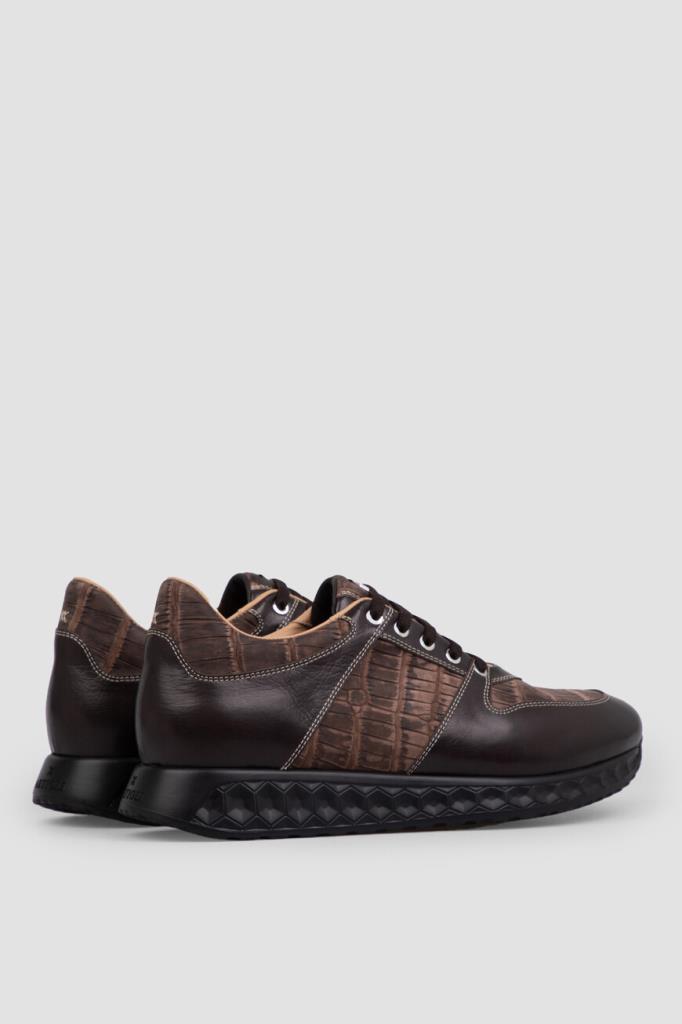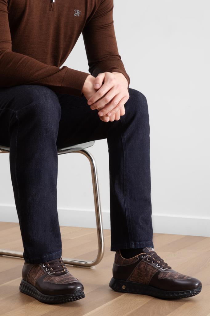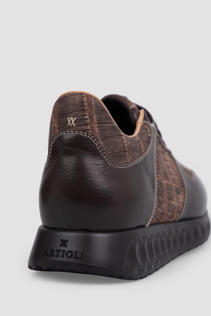 Кроссовки ARTIOLI выполнены в тёмно-коричневых тонах. Конструкция удобной пары из гладкой телячьей кожи и фактурной матовой кожи крокодила предполагает закрытый тип шнуровки и объёмную чёрную подошву с фактурным узором и тиснёными логотипом и монограммой Дома сзади. Комбинированная модель отличается двойной прострочкой на швах и бежевыми кантом на шнуровке и внутренней отделкой.