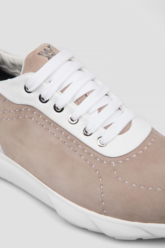 Замшевые сникеры ARTIOLI с белыми кожаными вставками. Удобная пара выполнена в нейтральном бежевом оттенке с бархатистой поверхностью и установлена на формованную подошву со спойлером и тиснёным логотипом сзади и рифлением снизу. Декором выступают прошитая строчка-узор на носке и боковинах и крупная монограмма бренда из серебристого металла, размещённая на язычке.