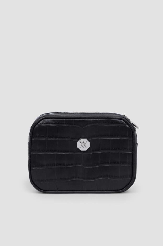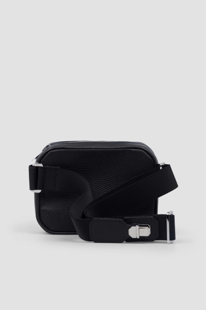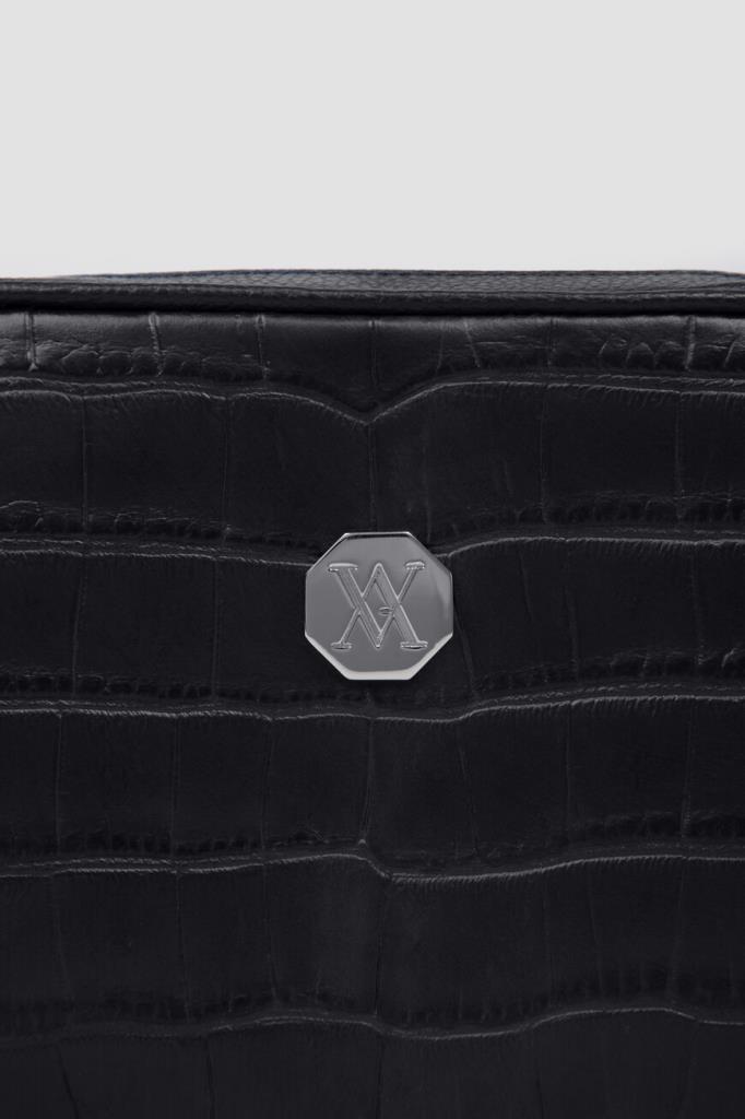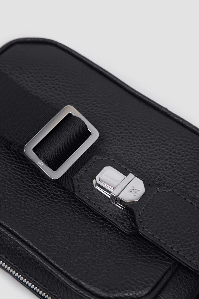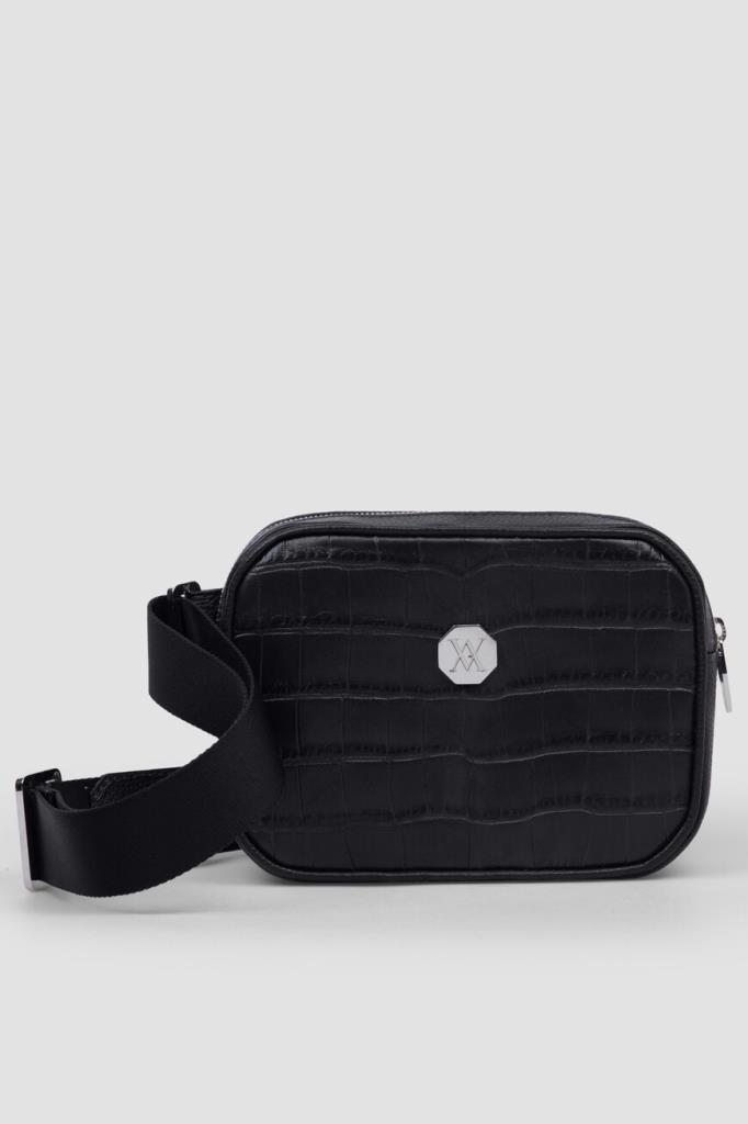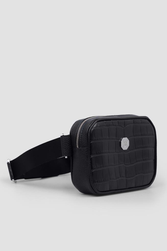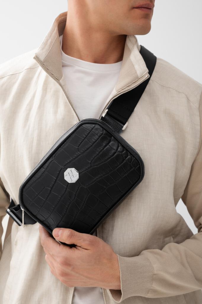 Чёрная поясная сумка Sergio от бренда Artioli. Для изготовления практичного аксессуара выбрана зернистая телячья кожа. Поверхность передней части модели декорирована тиснением под кожу крокодила в тон. Принадлежность изделия Дому подчёркивается вставкой-восьмигранником с крупным выгравированным логотипом и палладиевой отделкой спереди.