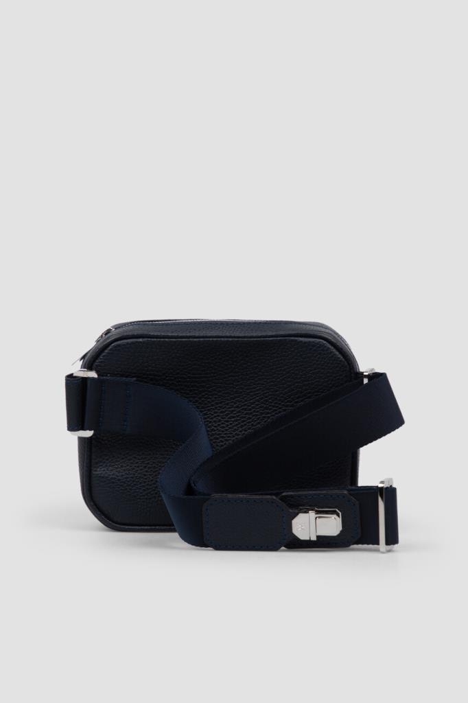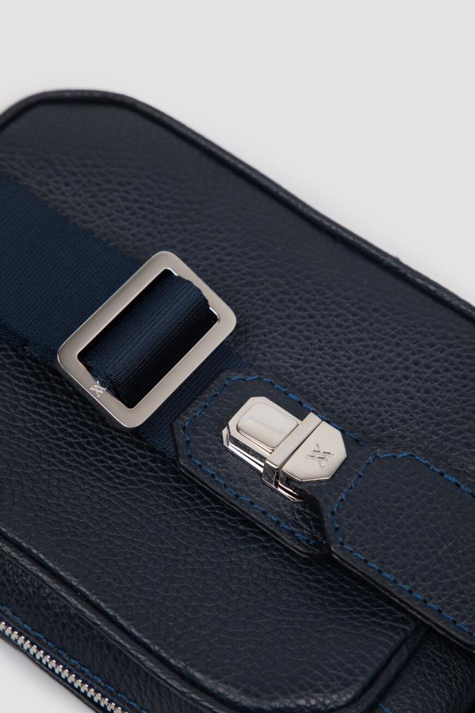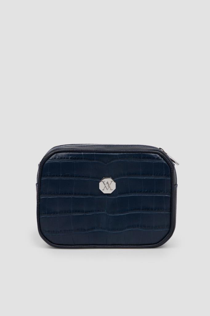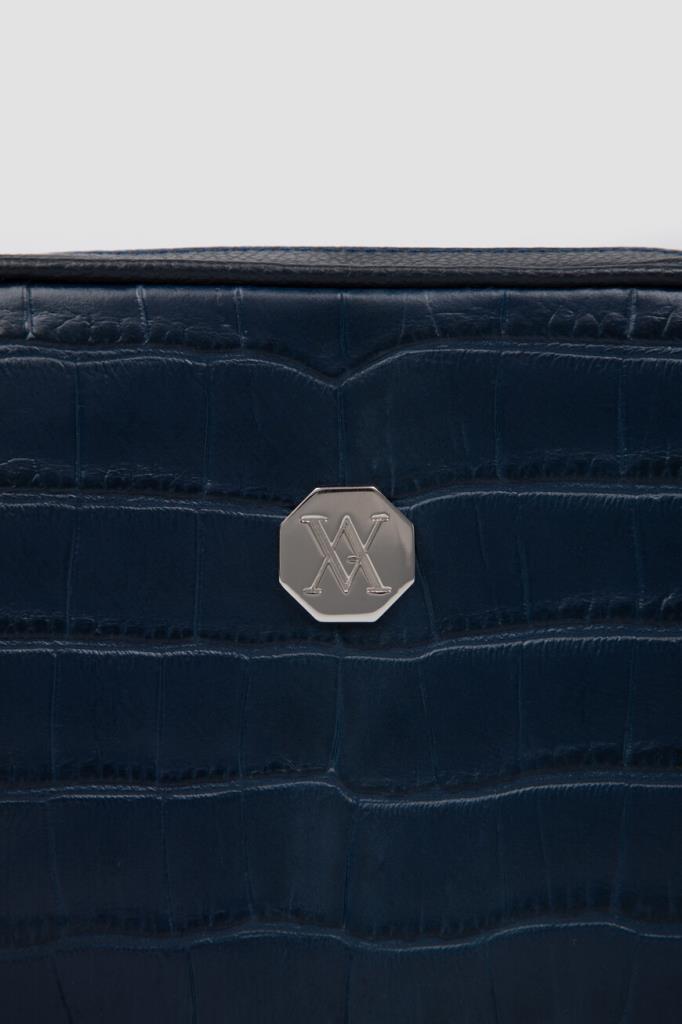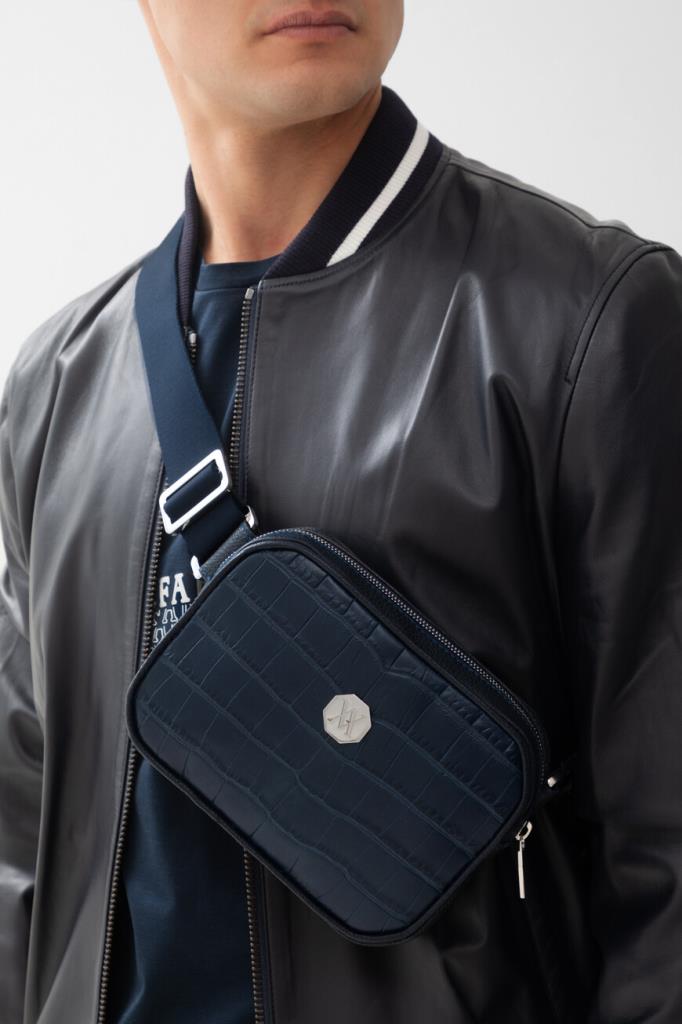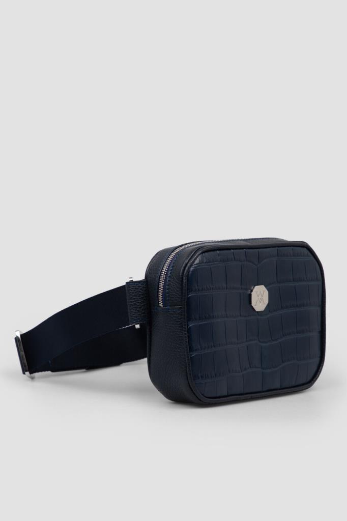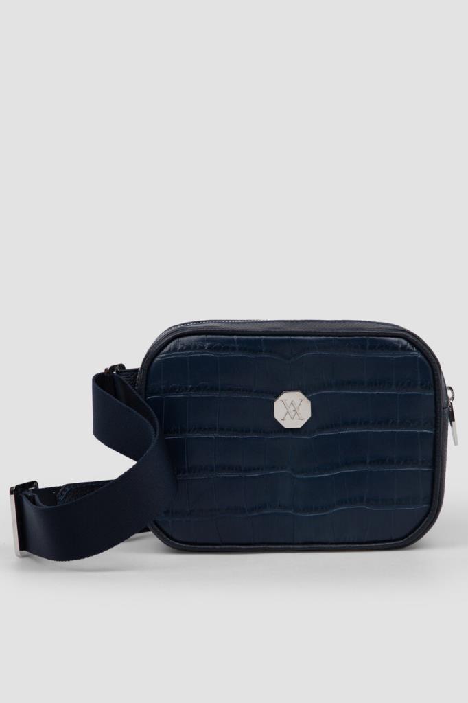 Поясная сумка Sergio от бренда Artioli с просторным внутренним отделением. Модель изготовлена из мягкой зернистой кожи телёнка тёмно-синего цвета. Декором выступают тиснёный узор-имитация кожи крокодила и вставка-восьмигранник с крупным выгравированным логотипом и палладиевой отделкой на лицевой стенке. Внутри - боковой карман на застёжке-молнии и подкладка из гладкой кожи.