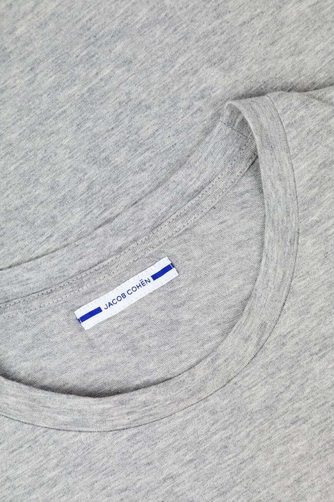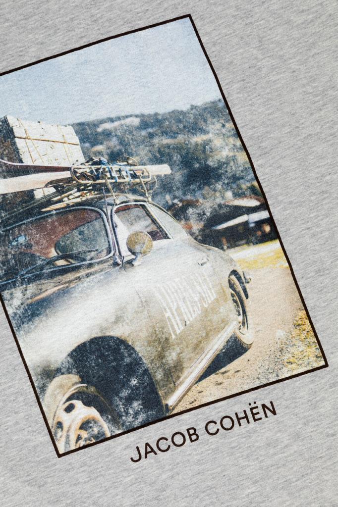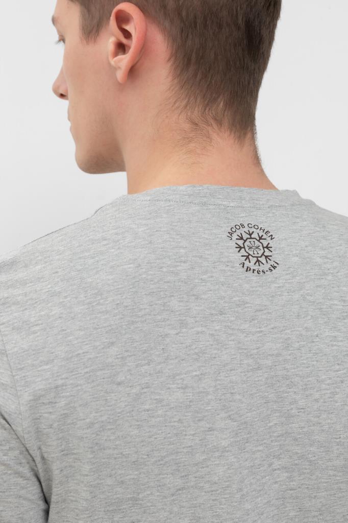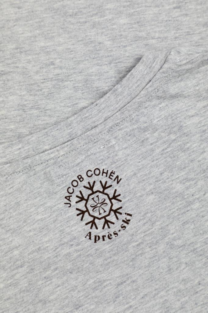 Серая меланжевая футболка JACOB COHЁN с прямоугольной вставкой спереди. Изделие полуприлегающего силуэта сшито из мягкого хлопкового трикотажа и дополнено круглым вырезом горловины. Спереди модель украшает состаренный принт с изображением автомобиля, белой надписью-названием капсульной коллекции Après-Ski и чёрными окантовкой и логотипом Дома. На спинке под воротником также присутствует знаковый декор.