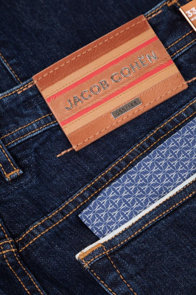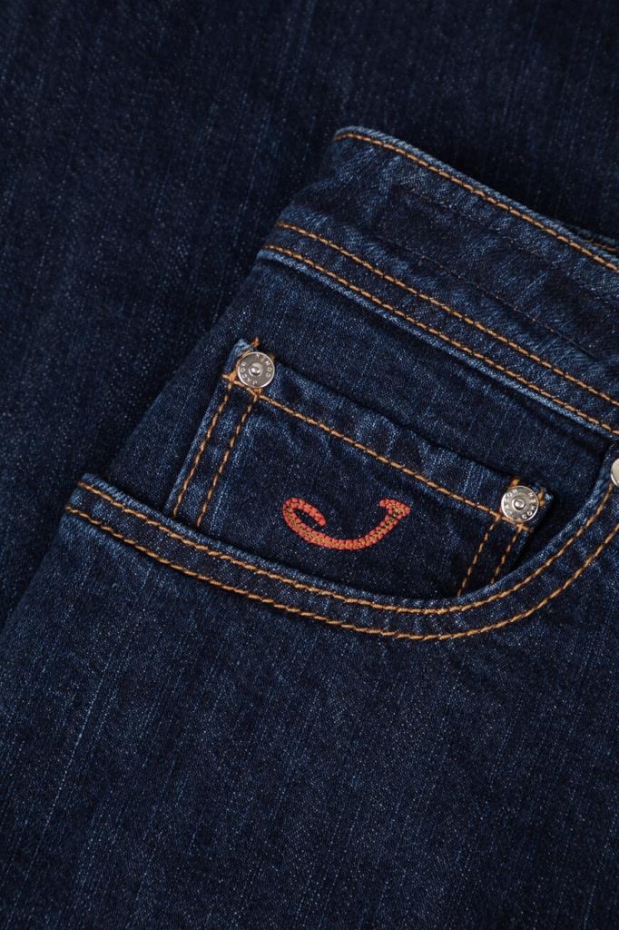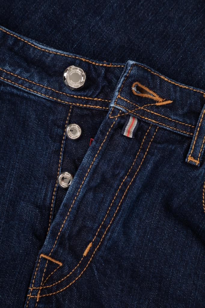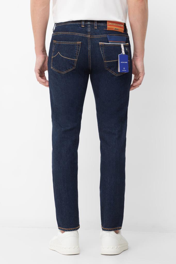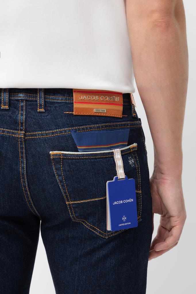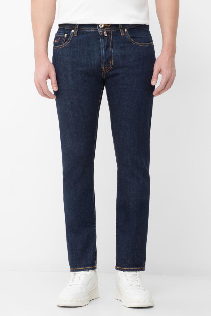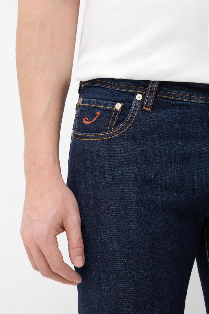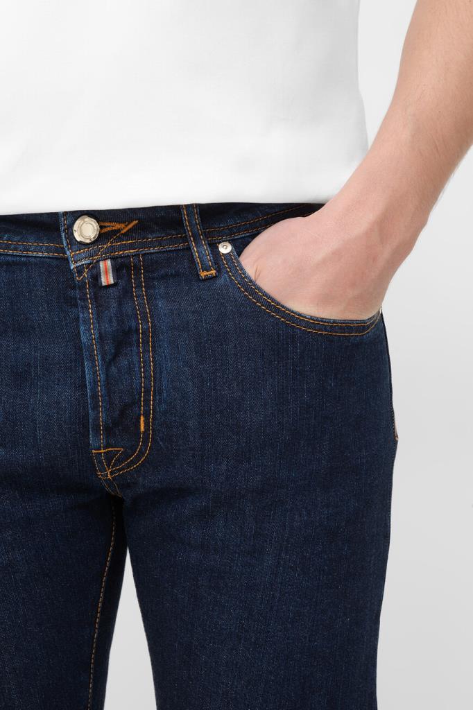 Прямые джинсы JACOB COHЁN на потайных пуговицах с планкой. Для пошива повседневной модели выбран эластичный хлопковый деним. Ткань пропитана эксклюзивной парфюмерной композицией, аромат которой не теряет своих свойств в течение более чем 20 стирок. Изделие тёмно-синего цвета отличается дизайнерскими потёртостями, оранжевой прострочкой на швах и наличием пяти карманов. Декором выступают накладка с рельефным логотипом бренда на поясе сзади и вышитая двухцветная монограмма на маленьком кармане спереди.