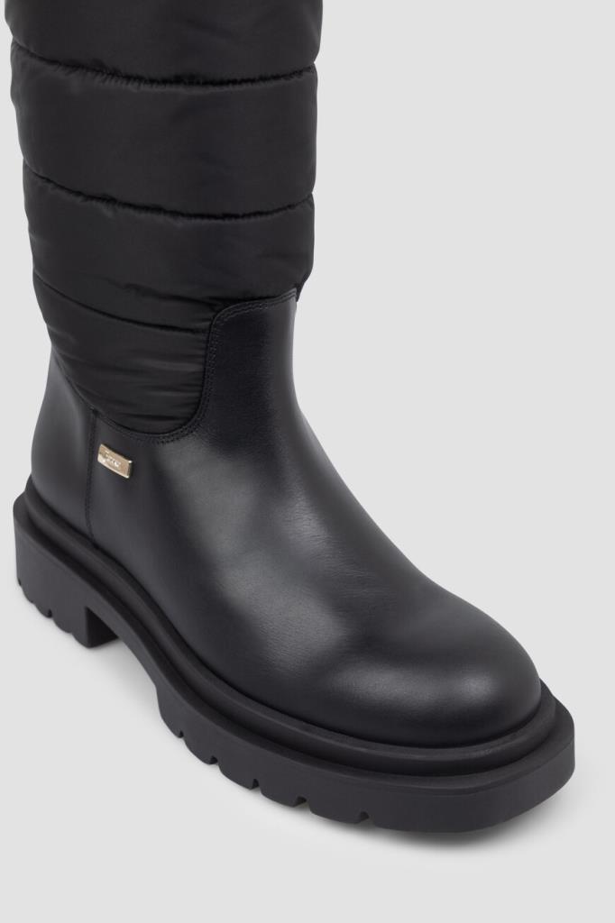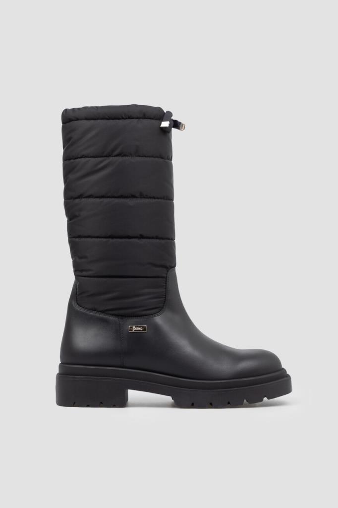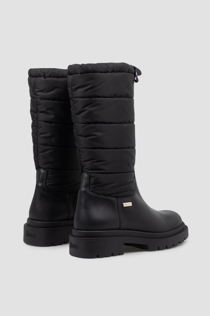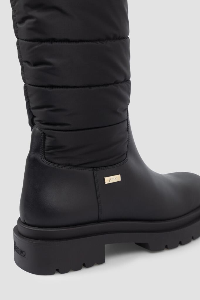 Чёрные комбинированные ботинки от HERNO. Основа изделия выполнена из гладкой телячьей кожи со вставками из инновационного водоотталкивающего материала Nylon Ultralight на голенище. Вставки украшают горизонтальная стёжка и завязки-кулиска по верхнему краю. Высокая пара с набивкой из прочного полиэстера сочетает в себе изысканный стиль и практичность. Массивная выступающая подошва из термопластичной резины дополнена глубоким протектором для надёжного сцепления с дорогой.