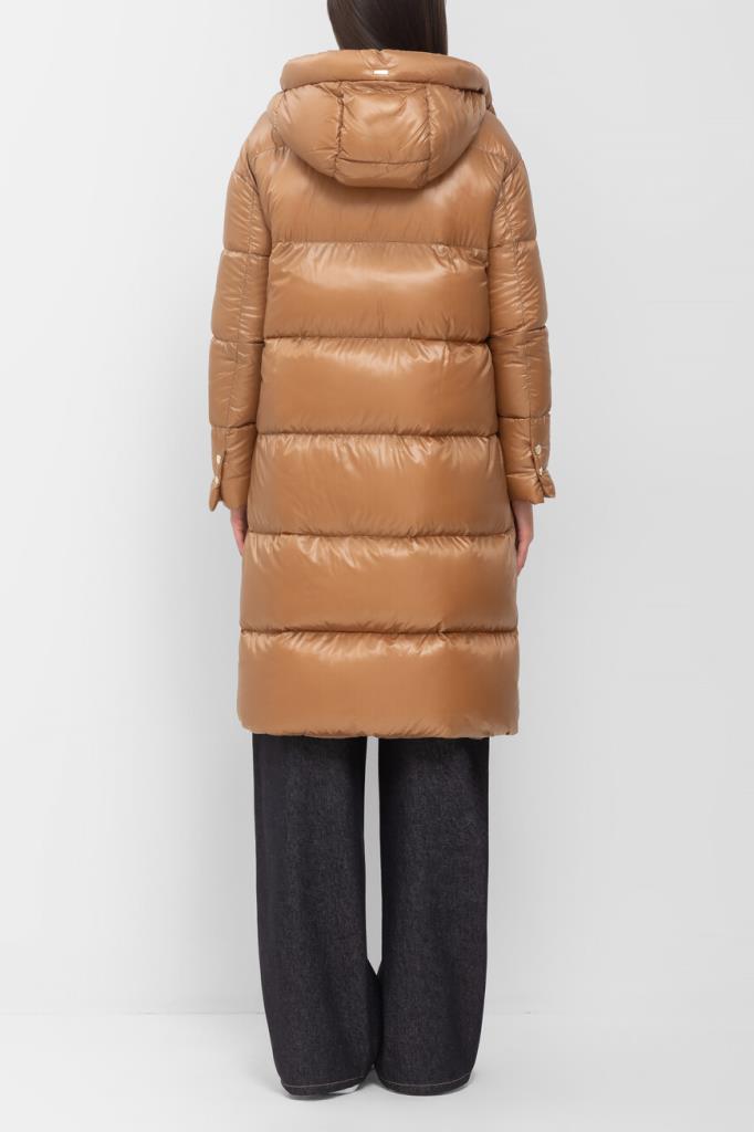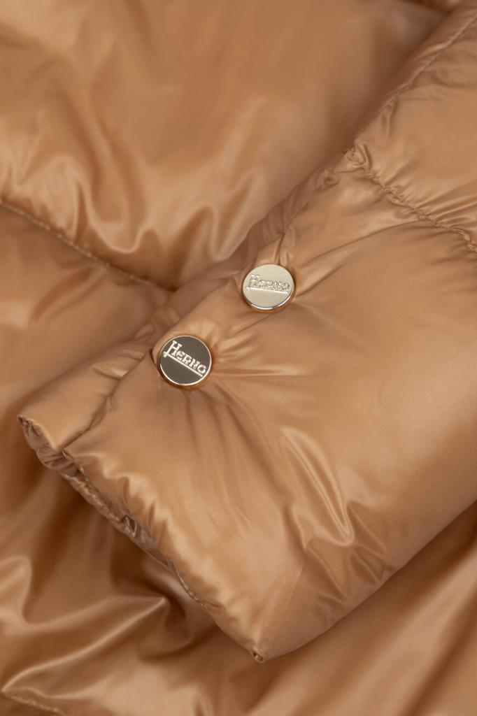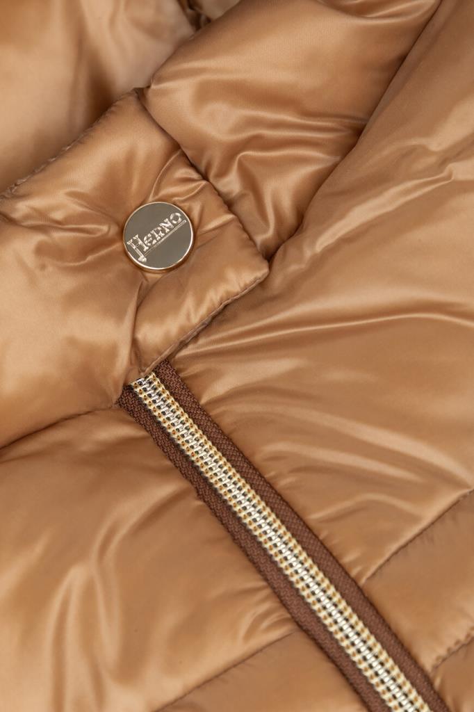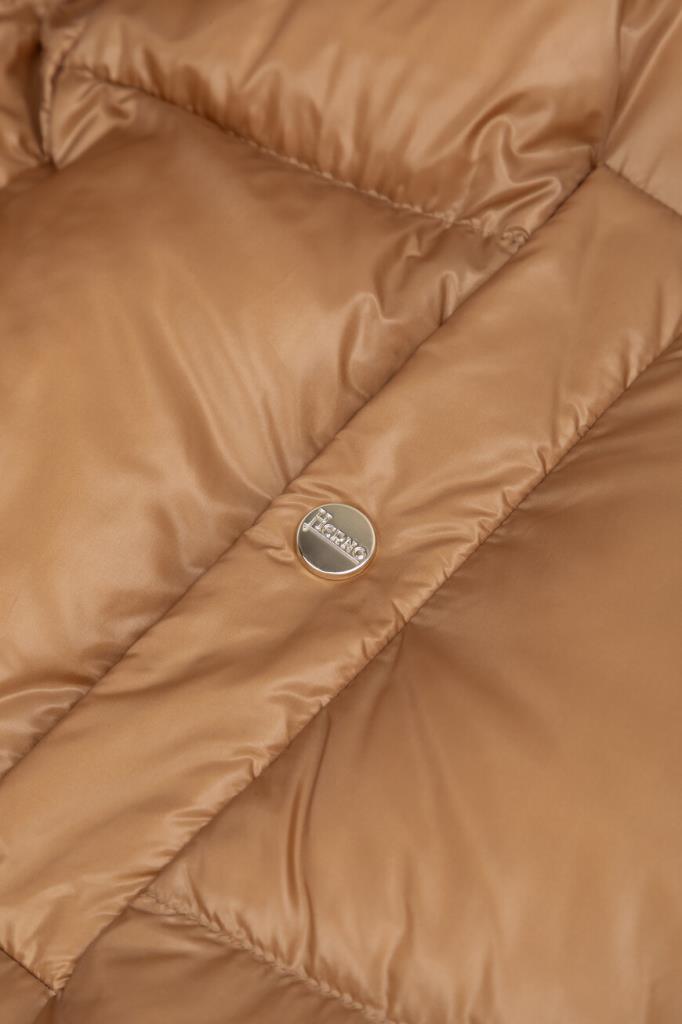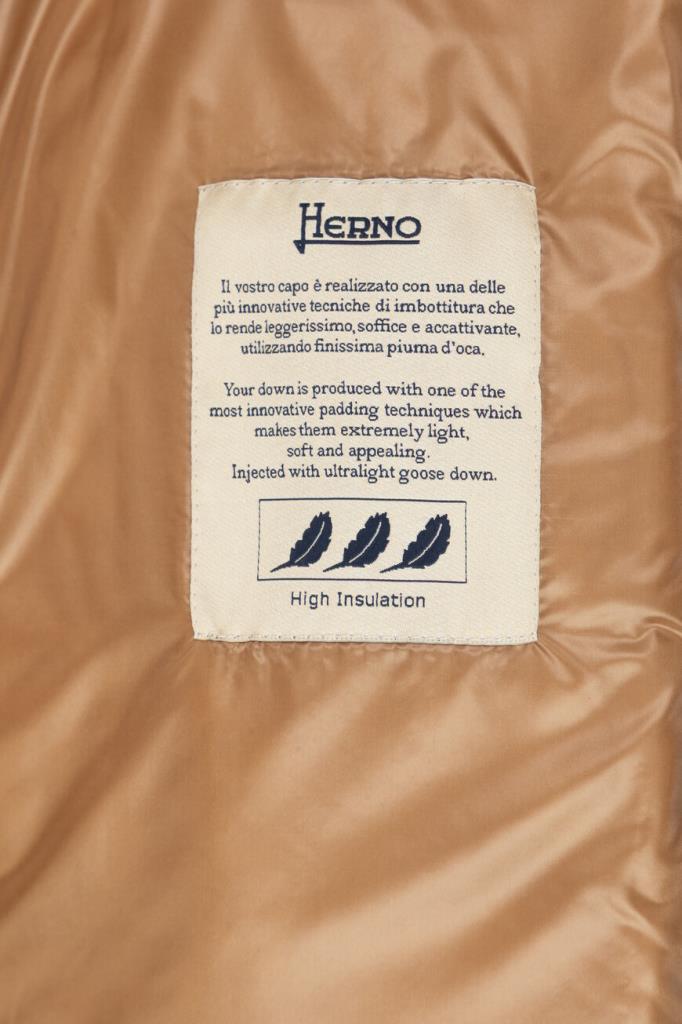 Водоотталкивающая парка в оттенке кэмел от Herno. Модель изготовлена из культового сверхлёгкого нейлона японского происхождения и дополнена глубоким капюшоном на клёпке спереди для дополнительной защиты от холода и ветра. Изделие отличается горизонтальной стёжкой, расклешенным книзу А-силуэтом и застёжкой на встречную молнию с двумя пуллерами. Атрибутом Дома является прямоугольный лейбл с гравировкой сзади на капюшоне.