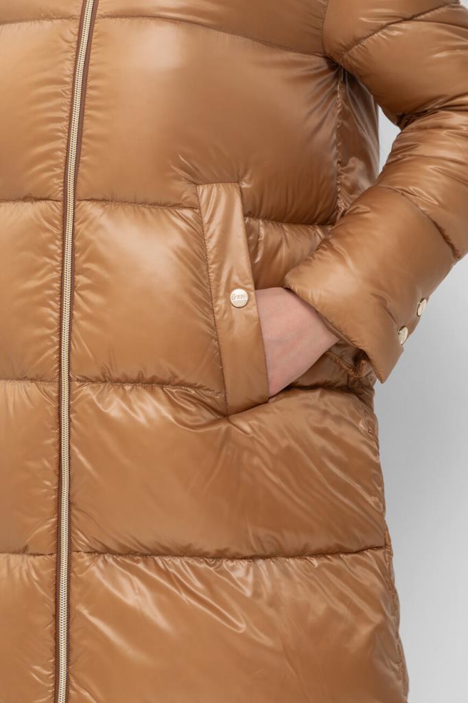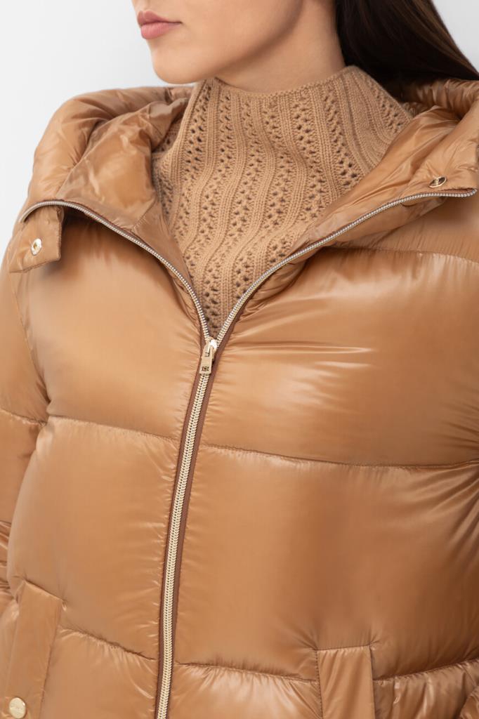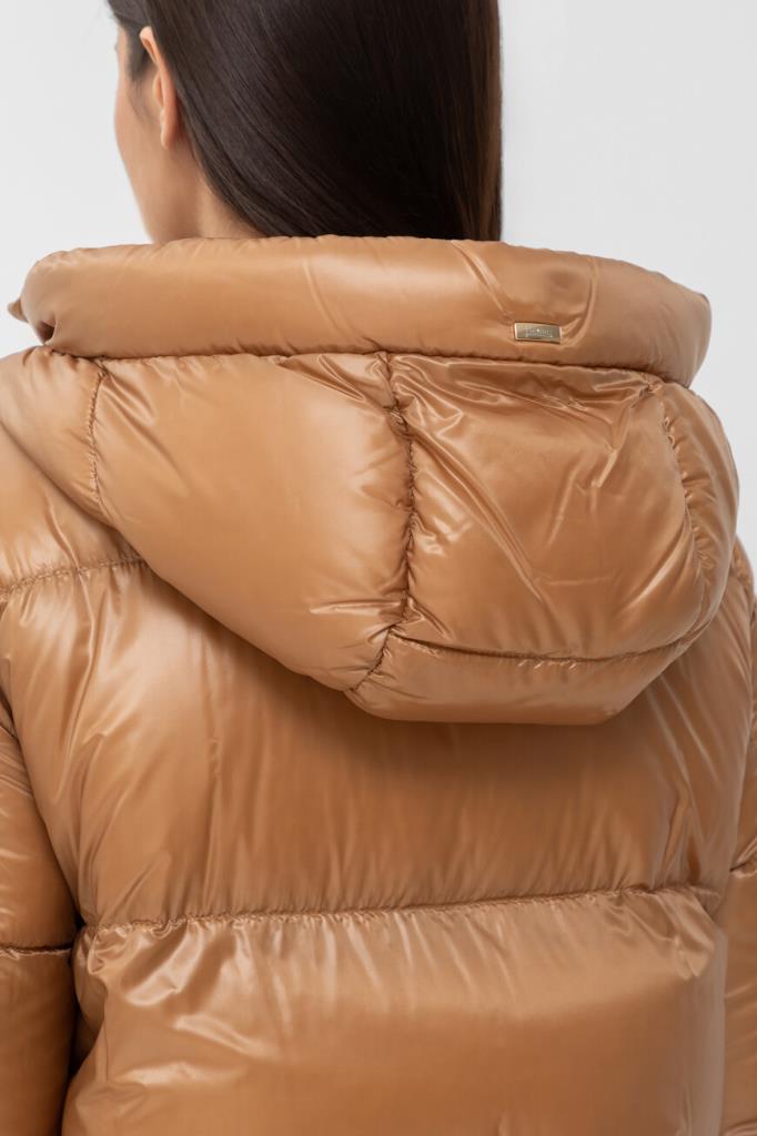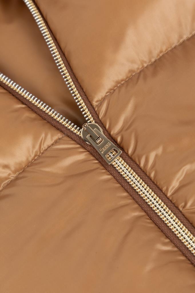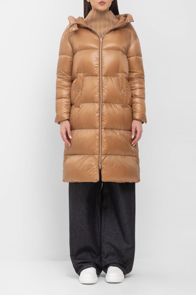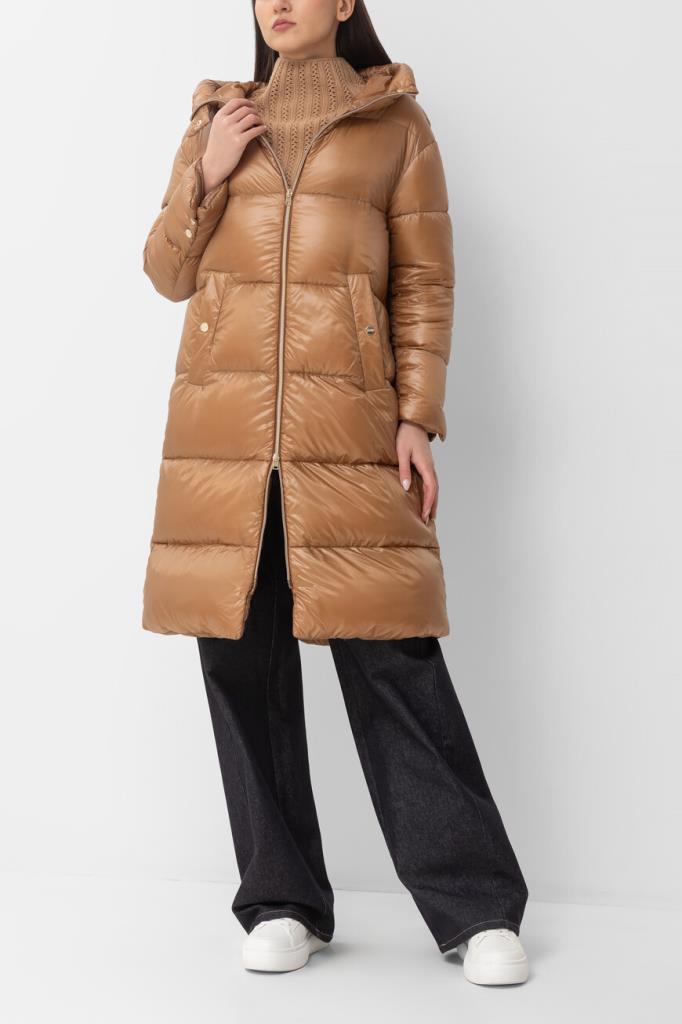Водоотталкивающая парка в оттенке кэмел от Herno. Модель изготовлена из культового сверхлёгкого нейлона японского происхождения и дополнена глубоким капюшоном на клёпке спереди для дополнительной защиты от холода и ветра. Изделие отличается горизонтальной стёжкой, расклешенным книзу А-силуэтом и застёжкой на встречную молнию с двумя пуллерами. Атрибутом Дома является прямоугольный лейбл с гравировкой сзади на капюшоне.