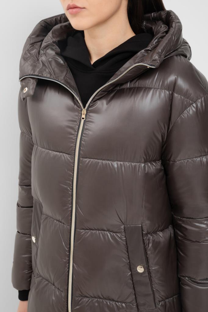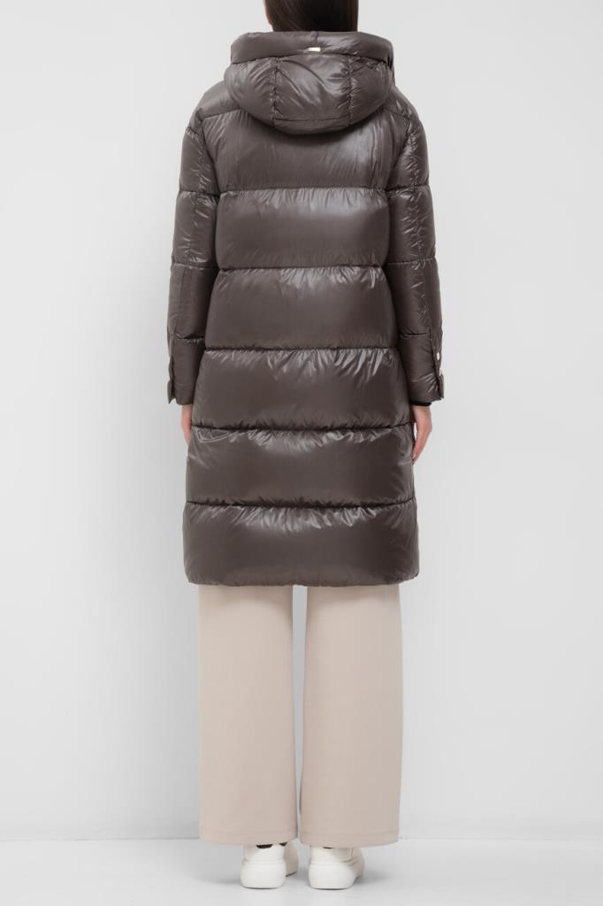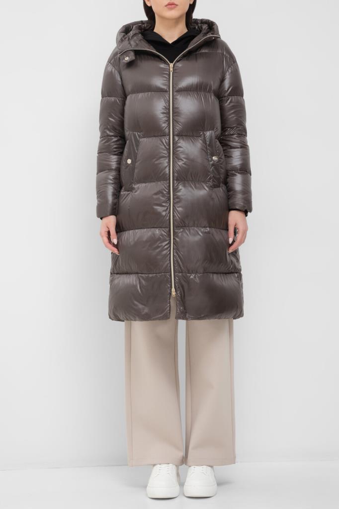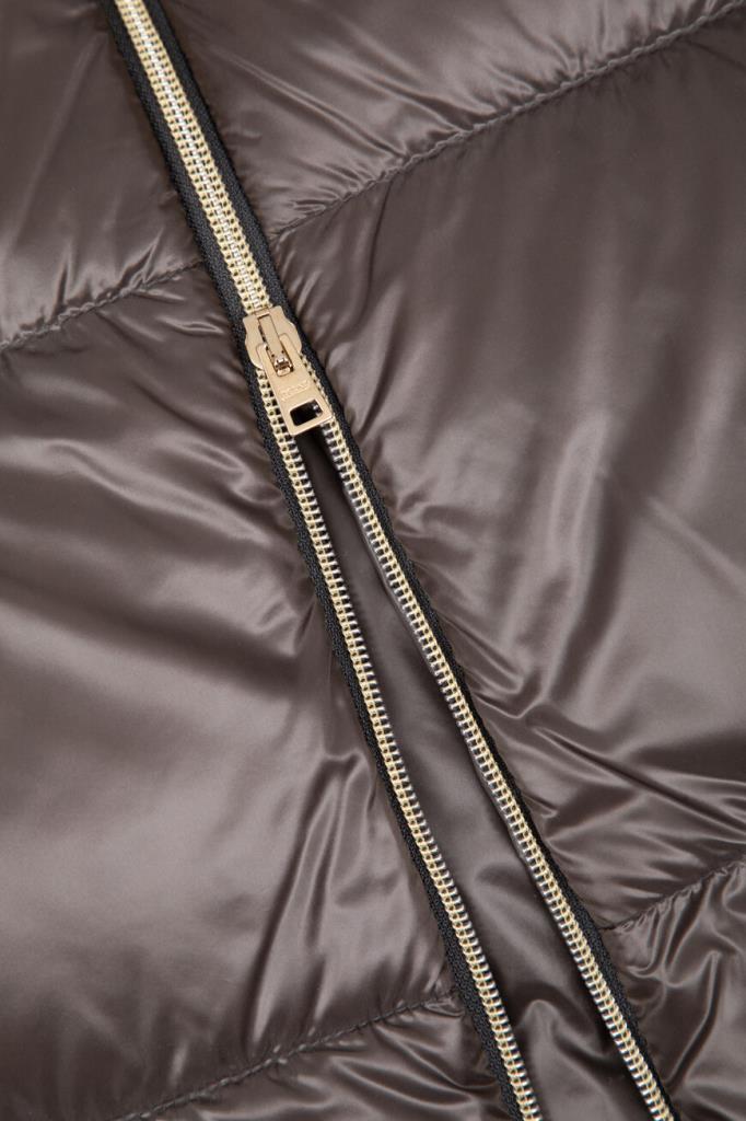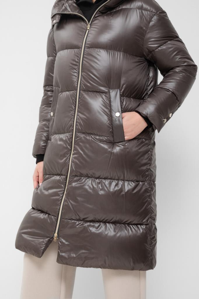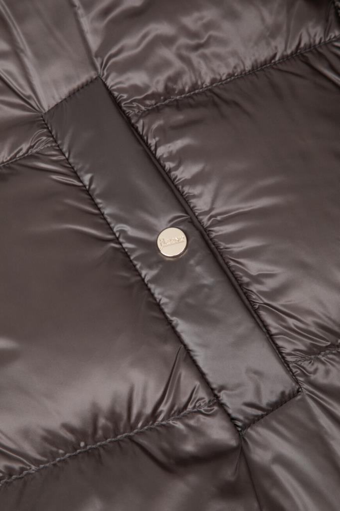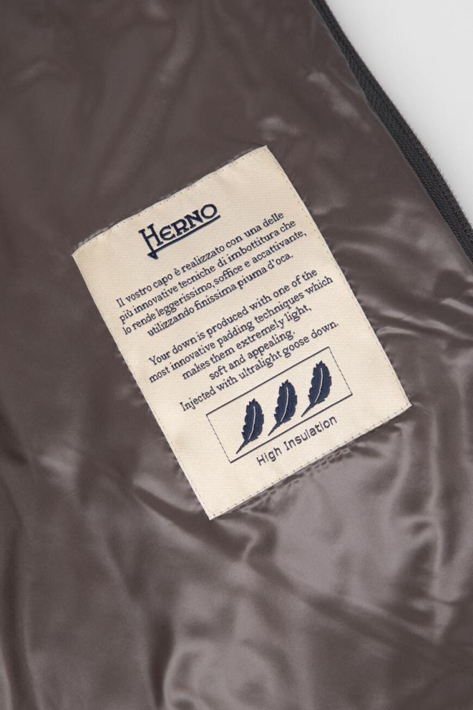 Тёмно-серая парка на встречной молнии с брендированными пуллерами от Herno. Для изготовления модели расклешенного книзу А-силуэта используется сверхлёгкий водоотталкивающий нейлон японского происхождения. Особенностями изделия стали горизонтальная стёжка, глубокий капюшон на клёпке спереди для дополнительной защиты от холода и ветра и наполнитель на основе натурального гусиного пуха и пера. Роль минималистичного знакового декора отведена прямоугольному лейблу с гравировкой Дома сзади на капюшоне.