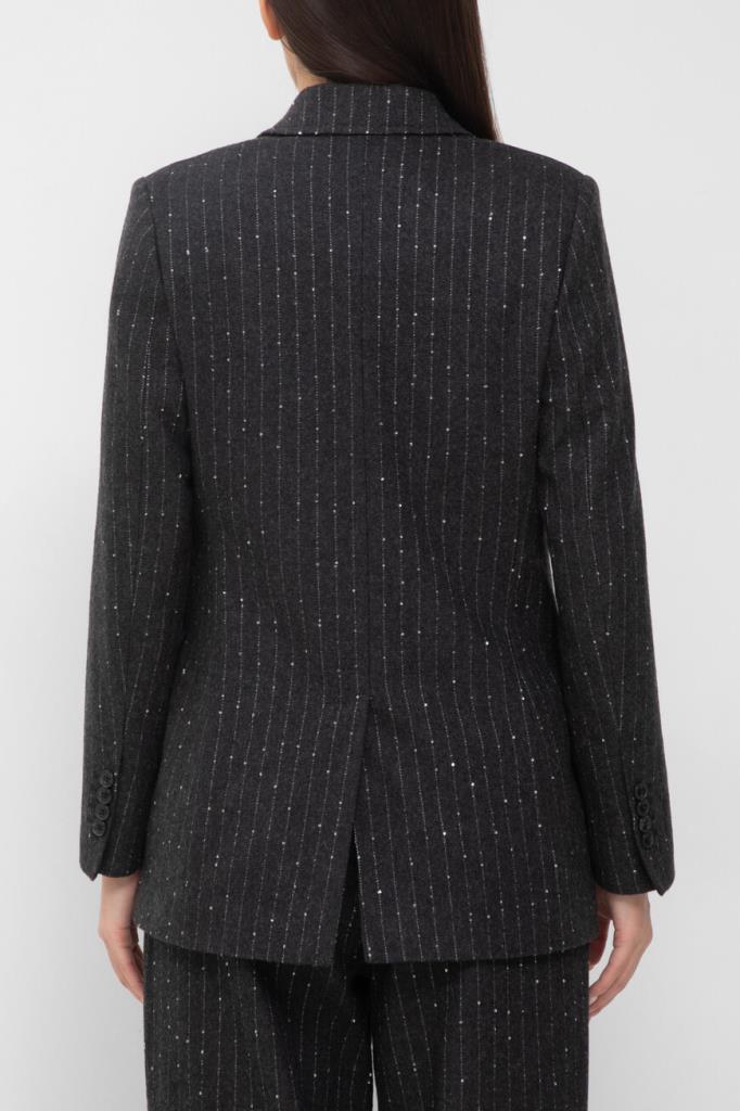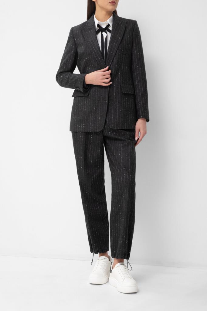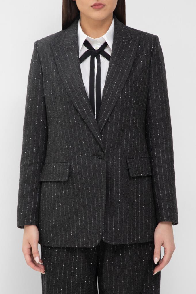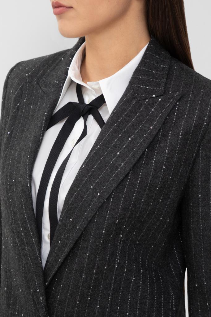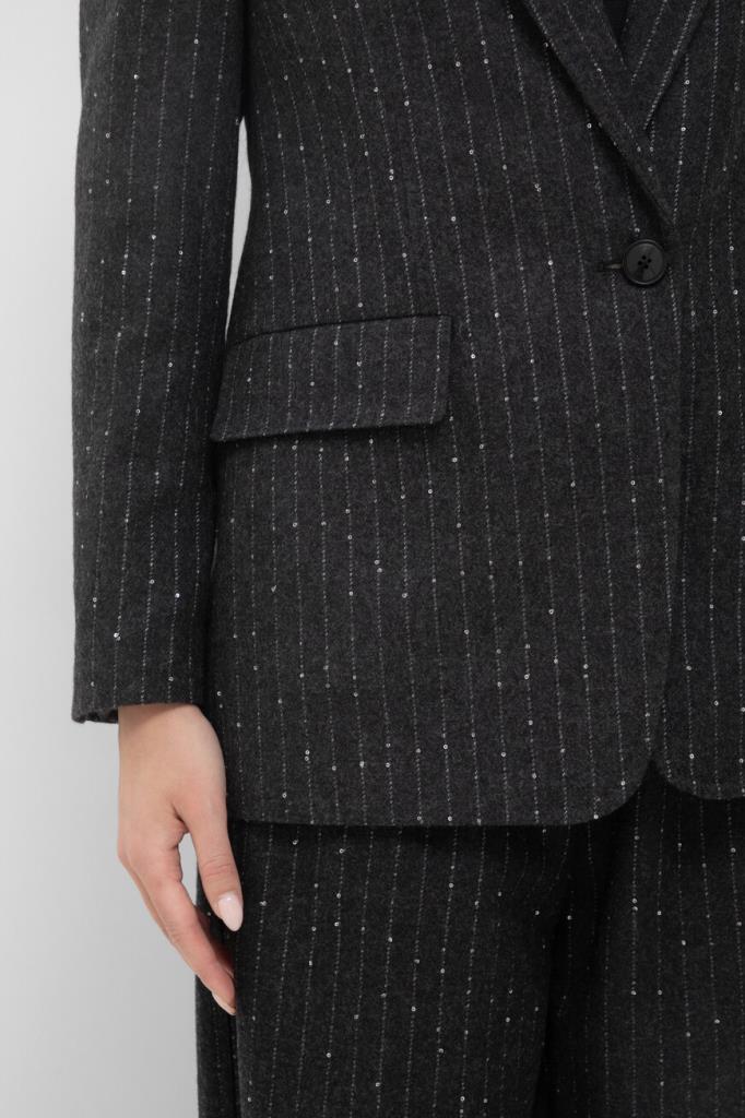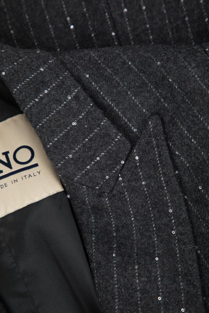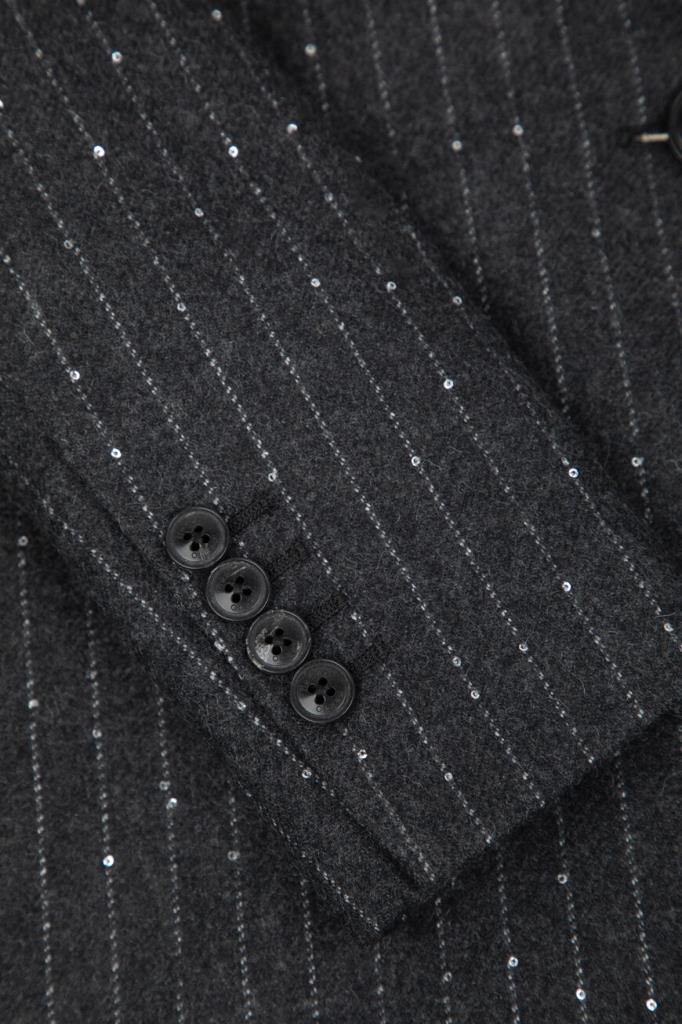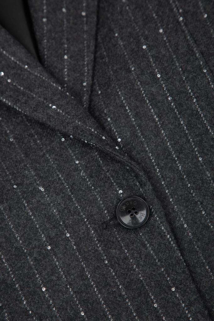 Прилегающий блейзер на крупной роговой пуговице от Herno. Модель изготовлена из фланели на основе мягкой шерсти, нейлона, прочного полиэфира и ацетата тёмно-серого цвета с полосатым геометрическим мотивом и декором из переливающихся на солнце пайеток. Изделие с заострёнными лацканами составит превосходный комплект с парными брюками с защипами сверху из той же коллекции.