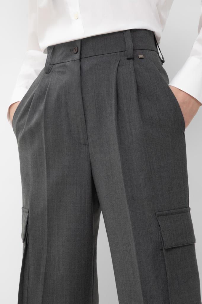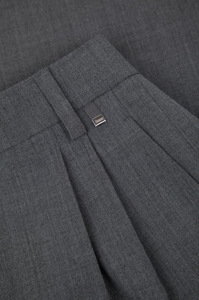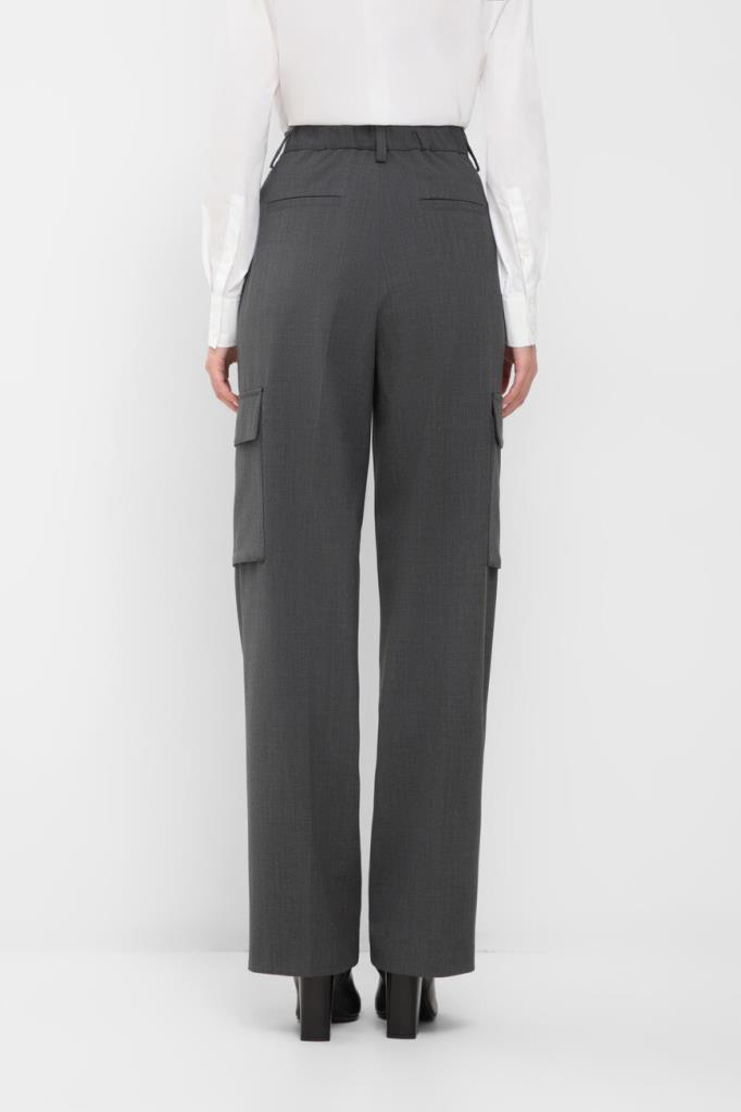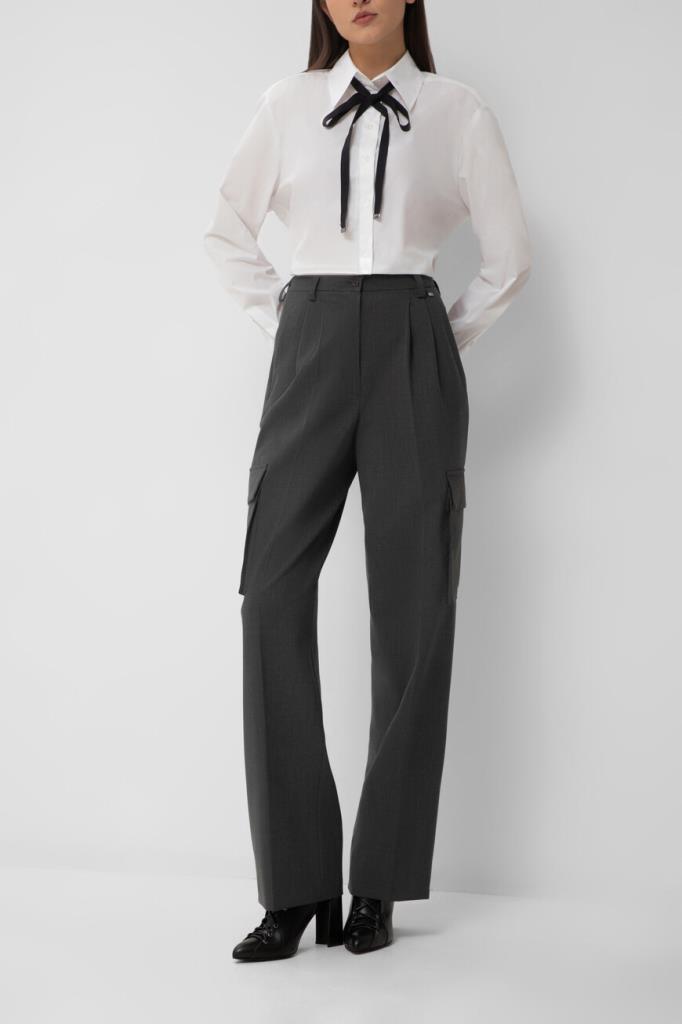 Брюки-карго от HERNO с двойными защипами сверху и отутюженными складками. Для изготовления модели тёмно-серого цвета используется лёгкий трикотаж на основе вирджинской шерсти и прочного эластичного полиэстера. Декором выступает серебристый металлический лейбл с гравировкой на детали сбоку. Функционал изделия расширен наличием трёх пар карманов, предназначенных для хранения мелких предметов.