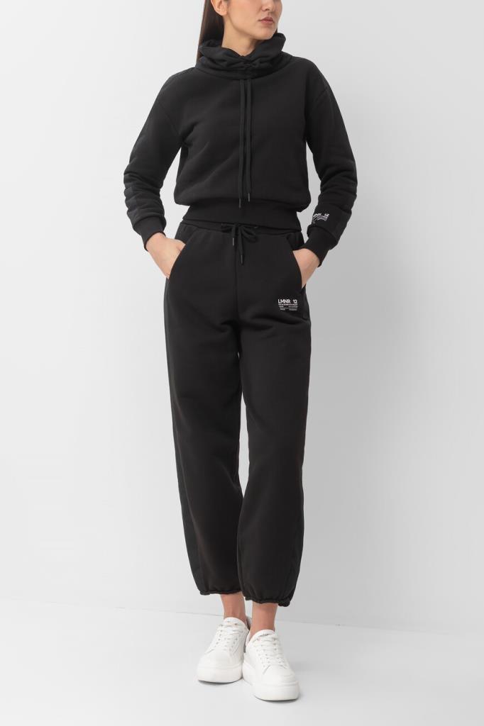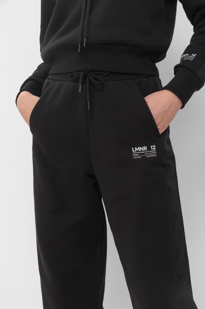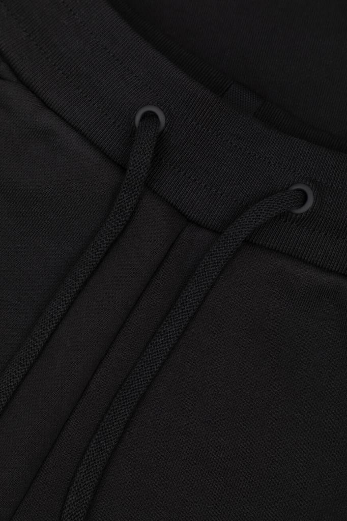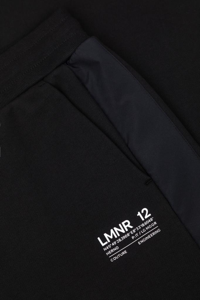 Спортивные брюки из ограниченной серии Laminar «Sartorial Engineering» от HERNO. Укороченная модель изготовлена из мягкого хлопкового трикотажа чёрного цвета с технологической мембраной, отвечающей за надёжную защиту от влаги и ветра. Отличительными деталями являются полосы-лампасы из прочного полиэстера и контрастные надписи спереди. Комфорт и удобство в носке обеспечивают широкий эластичный пояс на кулиске и манжеты-резинки.