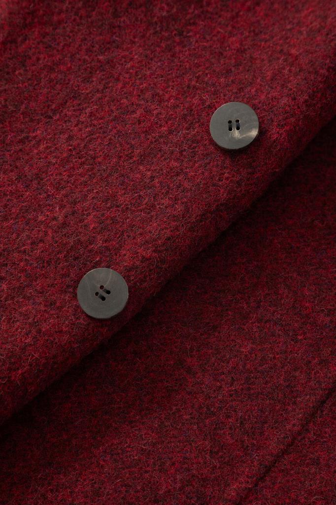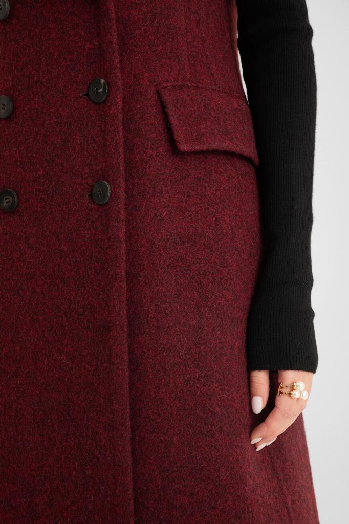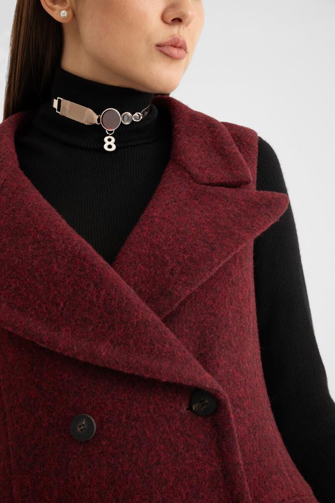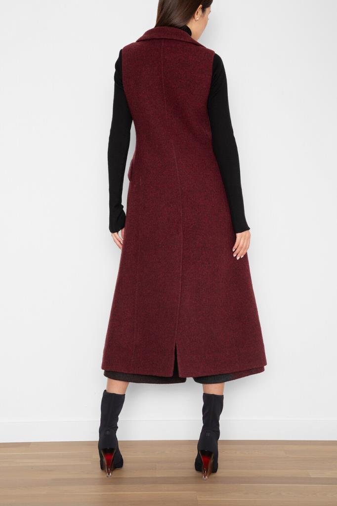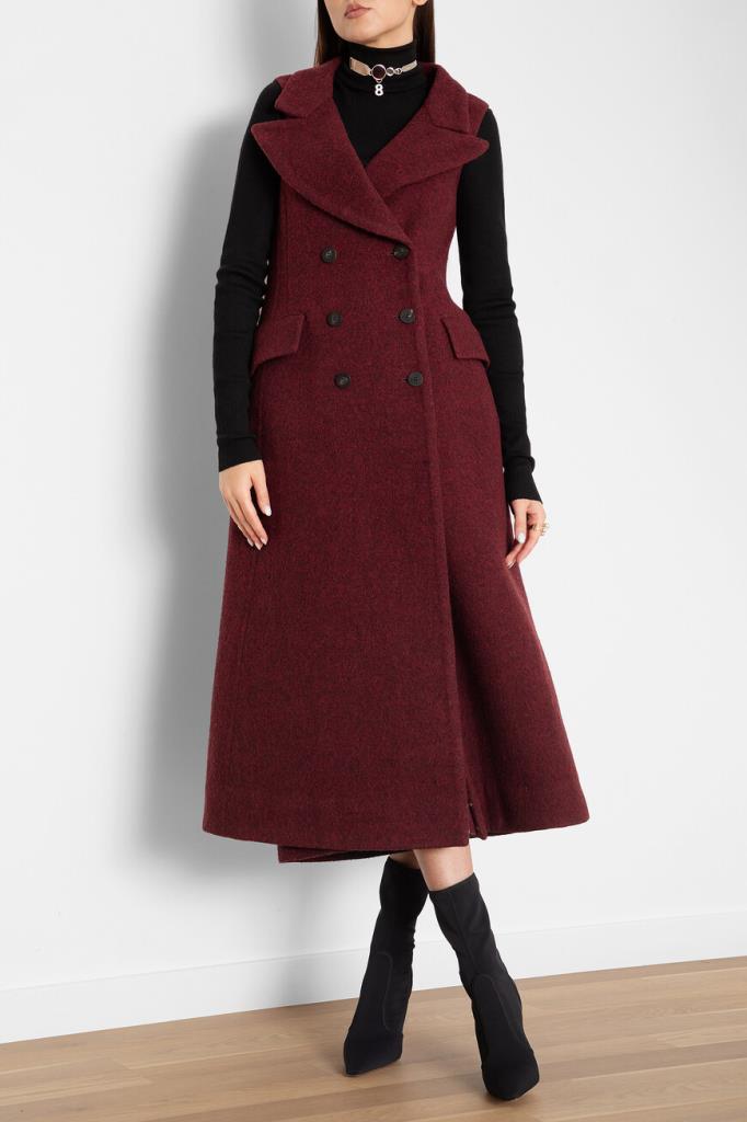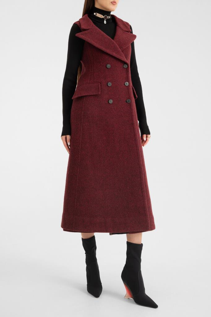 Удлинённый жилет Dior винного оттенка выполнен из натуральной шерсти. Двубортная модель расклешенного книзу кроя застёгивается на крупные роговые пуговицы. Образ дополнят базовая чёрная водолазка и ботильоны Dior.