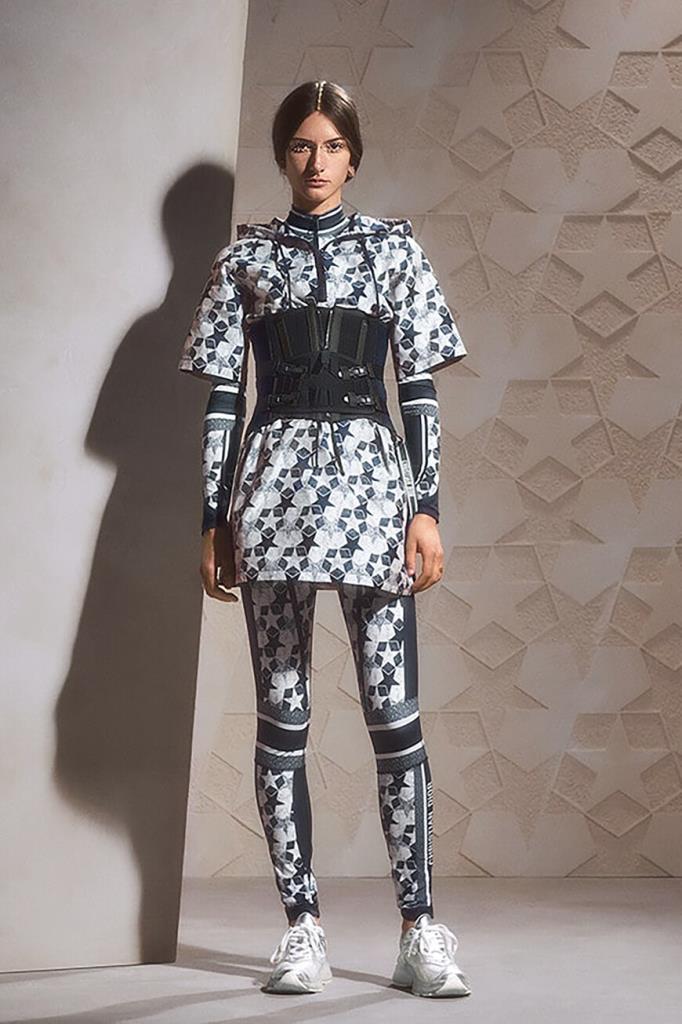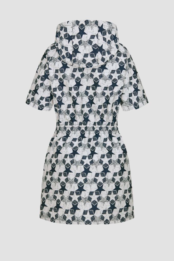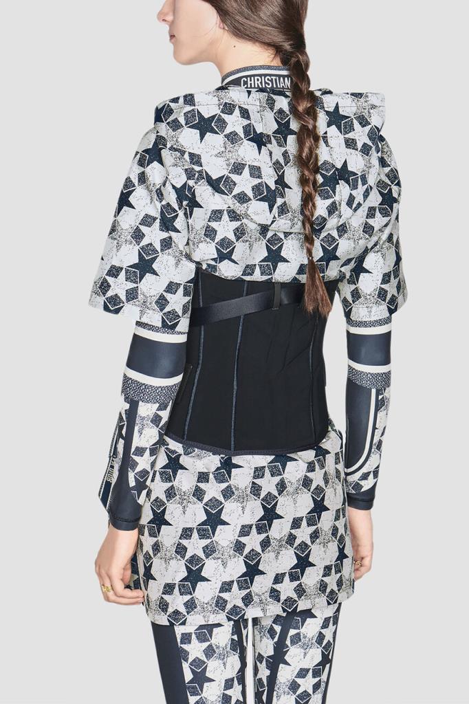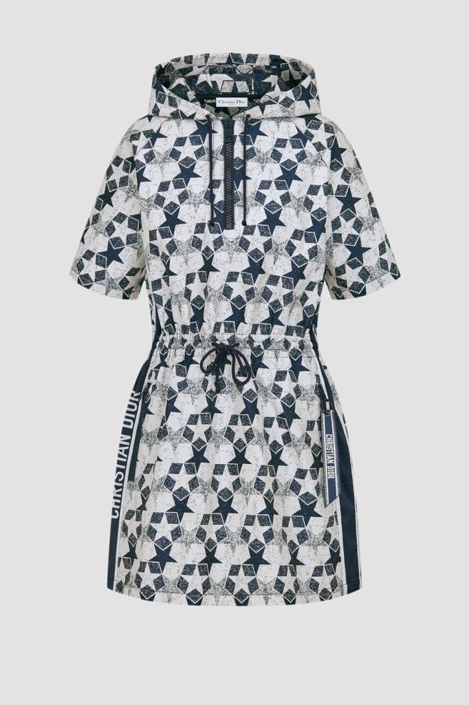 Платье в спортивном стиле от Dior. Короткая модель изготовлена из технической жаккардовой тафты и дополнена повторяющимся геометрическим принтом Dior Étoile в бело-синей гамме. Изделие с объёмным капюшоном дополнено тёмно-синими полосами по бокам и подобрано на кулиску.