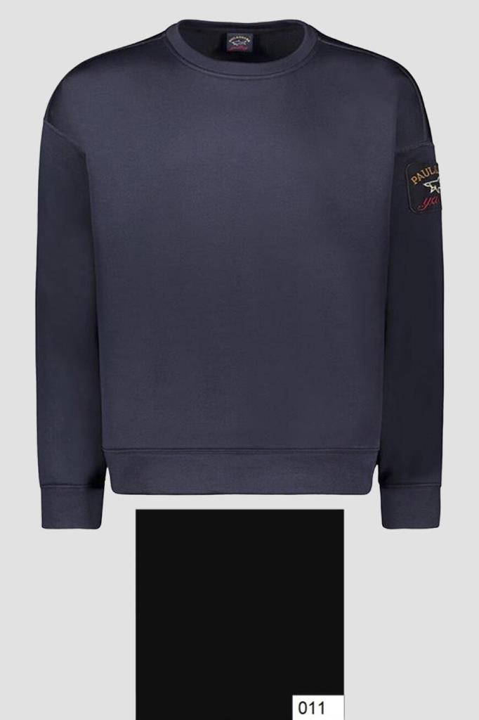 Чёрный свитшот из хлопка и полиэфира от бренда Paul&Shark. Изделие украшает крупный патч с разноцветным лого бренда на левом рукаве. Модель гармонично сочетается со спортивными брюками из той же коллекции.