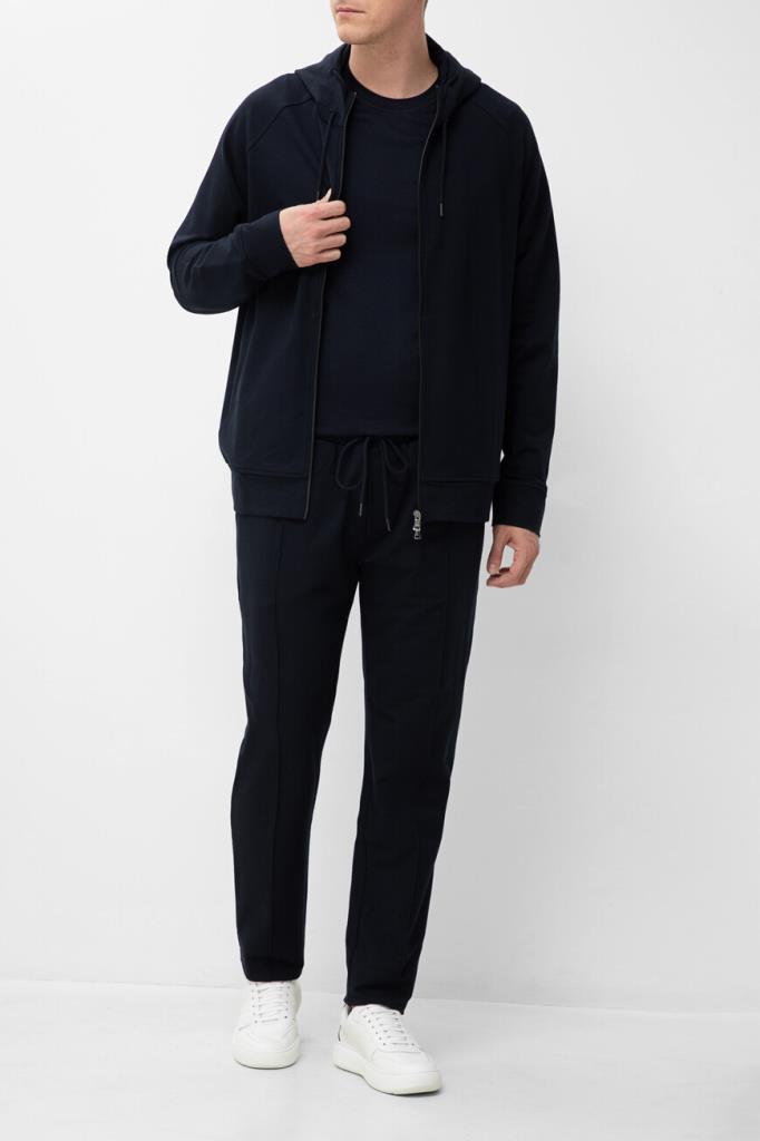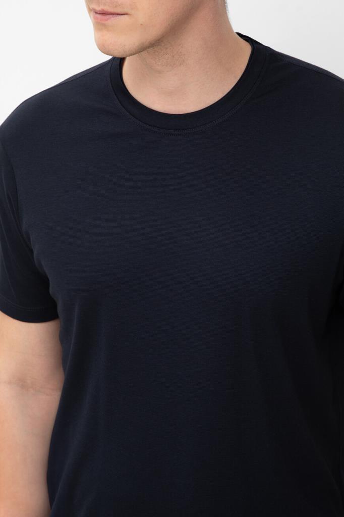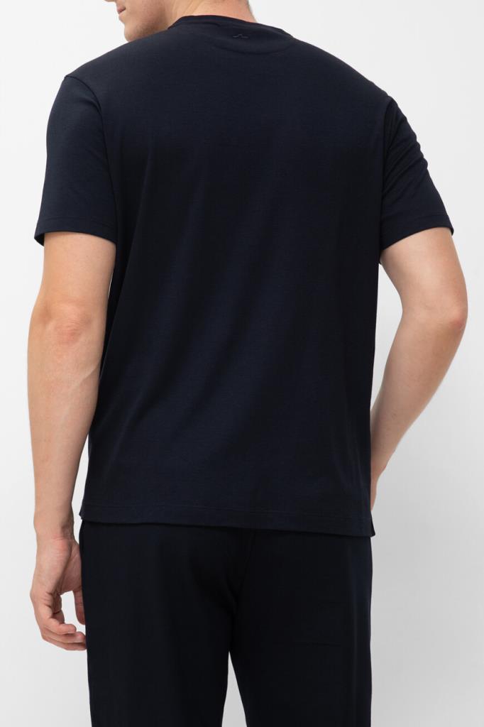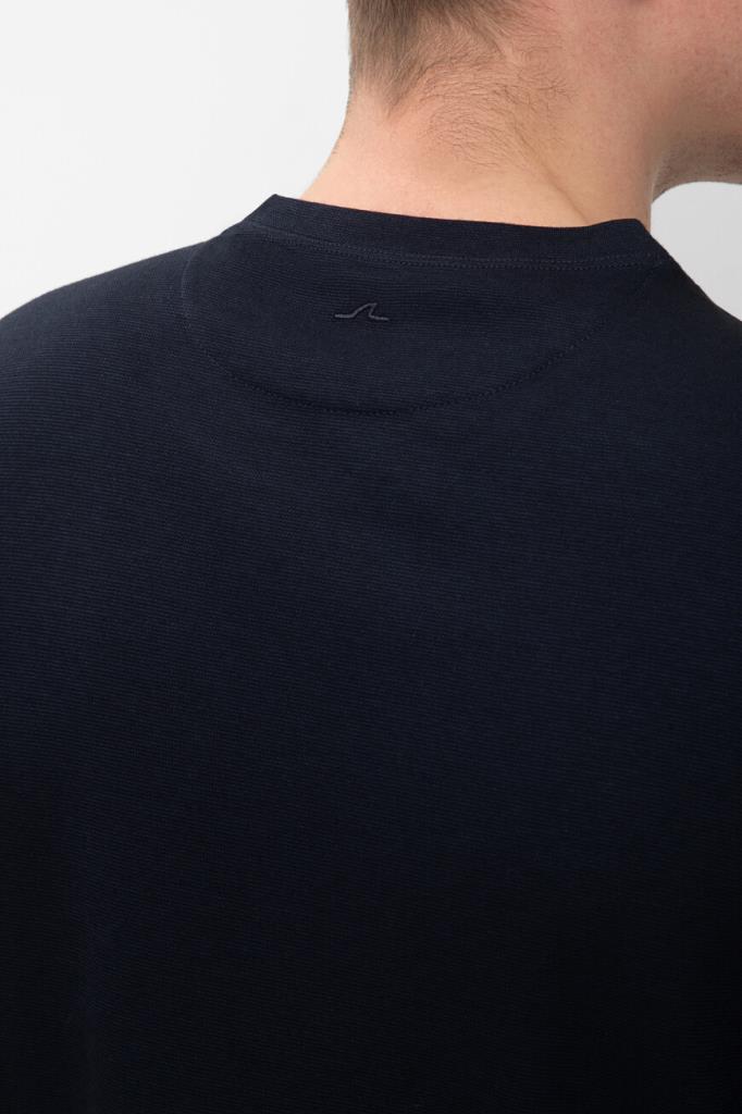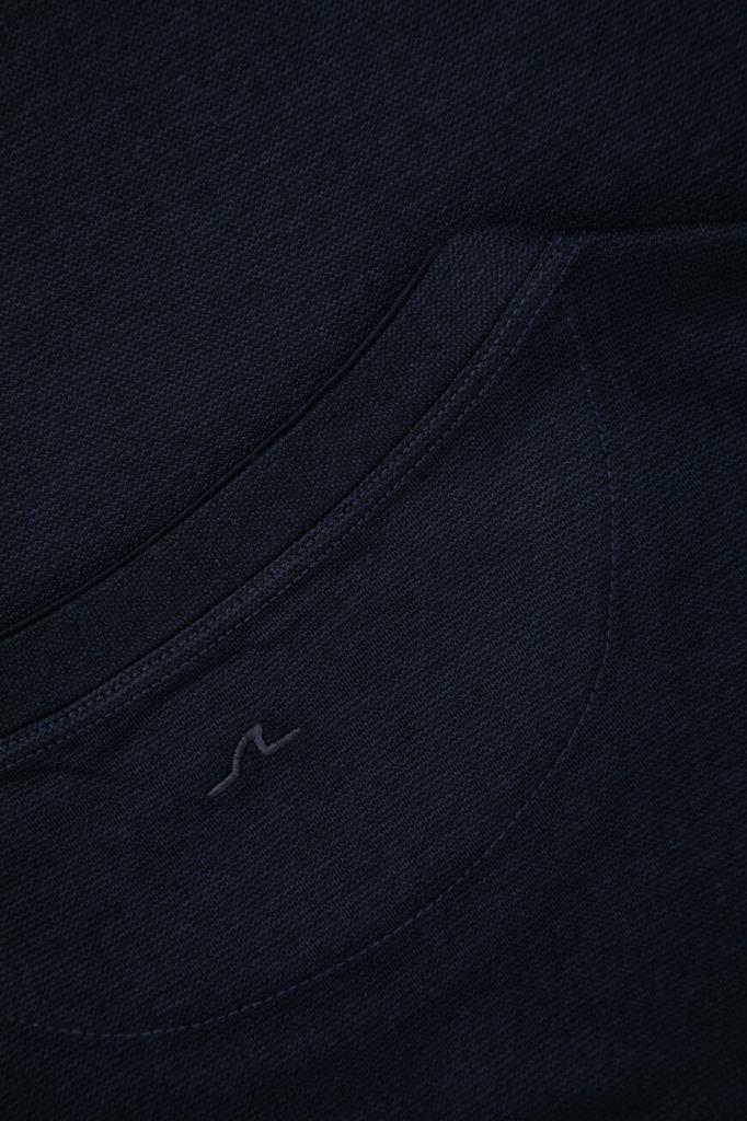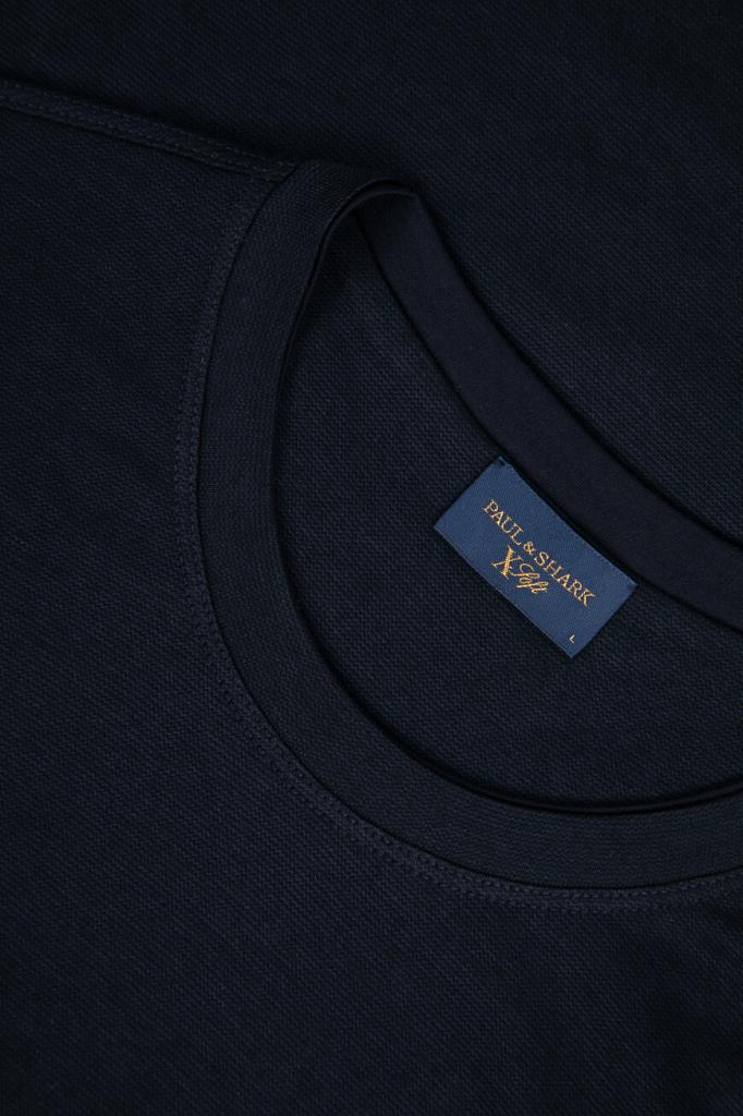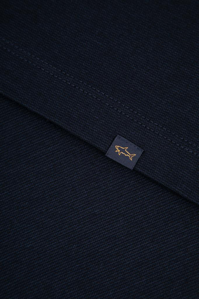 Фактурная футболка из мягкой смесовой пряжи от бренда Paul&Shark. Для изготовления меланжевой модели тёмно-синего цвета используются тонкий хлопок и шелковистый лиоцелл, обладающий антибактериальными свойствами. Этот материал хорошо пропускает воздух, не впитывает запахи и поддерживает оптимальный микроклимат даже в зной. В качестве знакового декора выступает миниатюрная вышивка в виде острого плавника акулы, расположенная на кокетке.