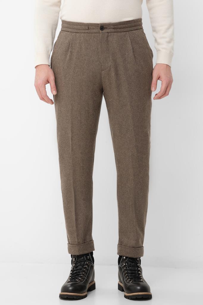 Смесовые брюки с защипами сверху от бренда Paul&Shark. Изделие коричневого оттенка, выполненное на основе мягкой шерсти, прочного полиэфира и нейлона, характеризуется слегка зауженным книзу кроем и наличием подворотов. Дополнительный комфорт и удобство в носке обеспечивает талия на потайной кулиске. Принадлежность модели с классическими стрелками Дому деликатно обозначена силуэтом острого плавника акулы над правым задним карманом. Брюки выглядят органично в повседневных образах с базовым трикотажем и стёганым жилетом.