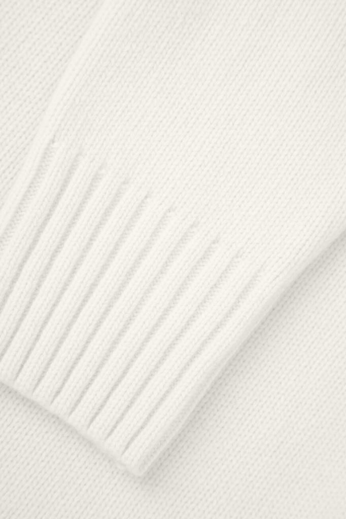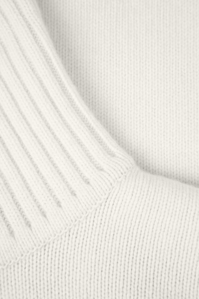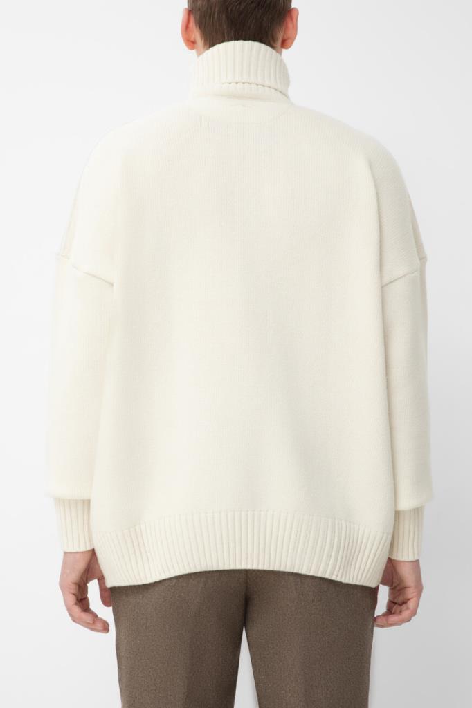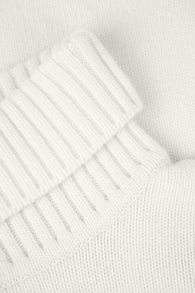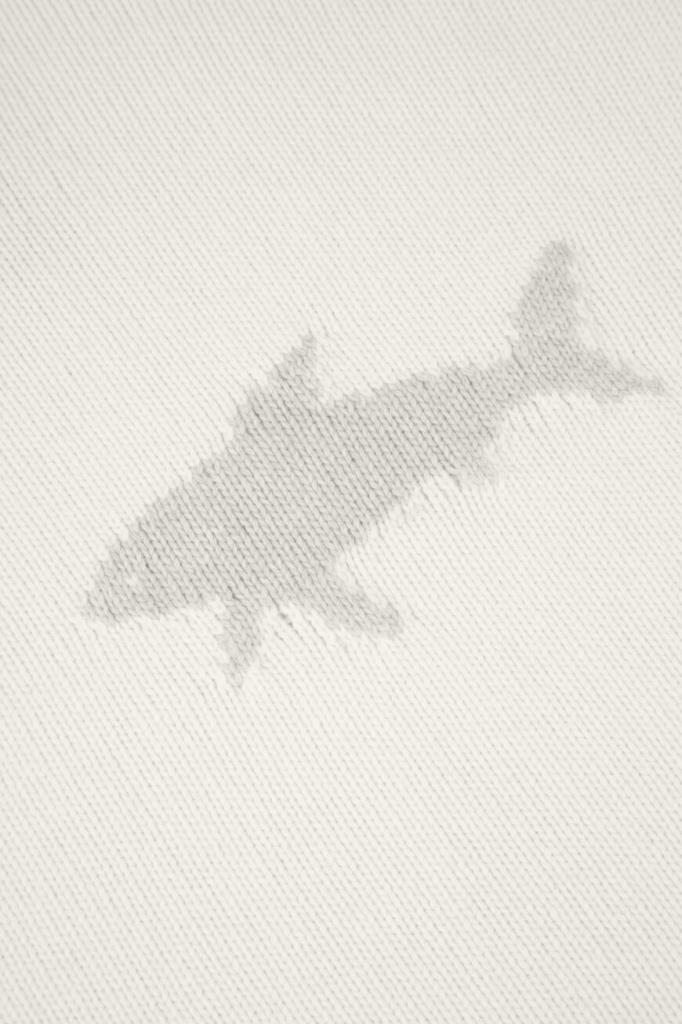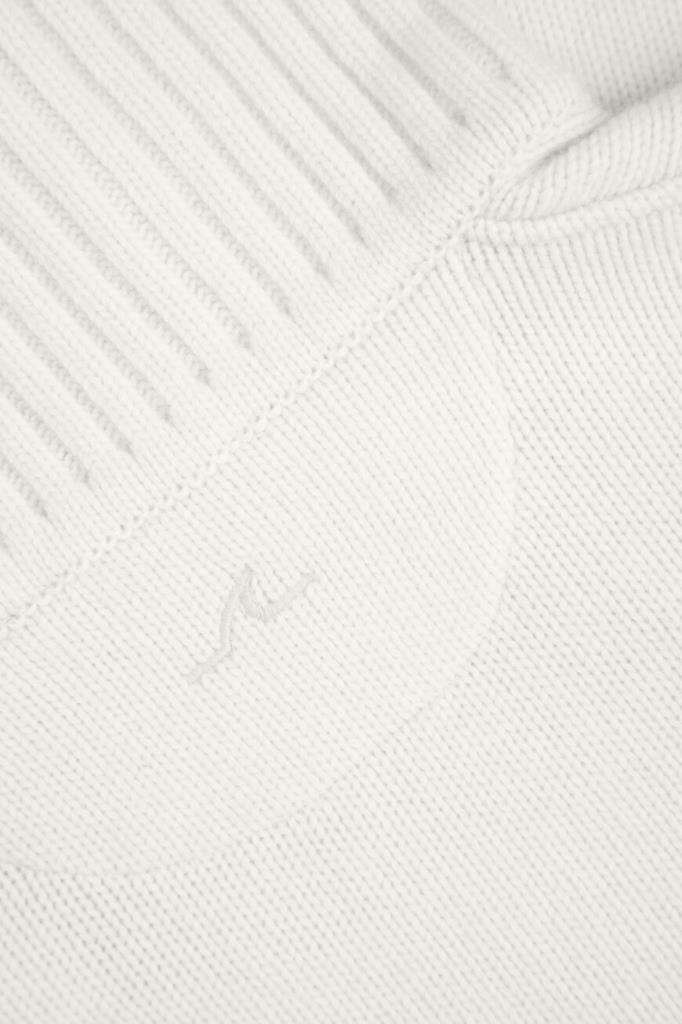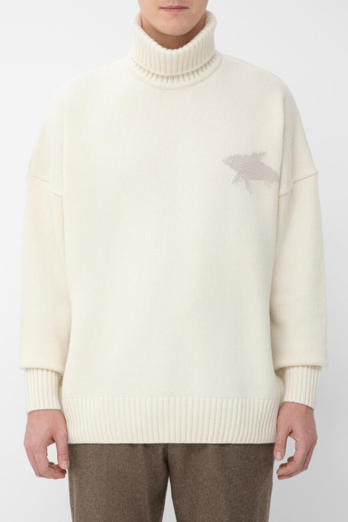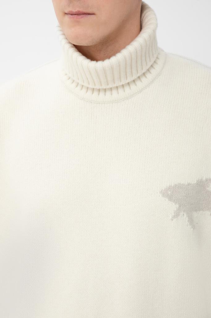 Свитер из вирджинской шерсти и прочного нейлона от бренда Paul&Shark. Изделие выполнено в белом цвете чулочной вязкой и дополнено знаковым принтом с изображением акулы слева на груди. Принадлежность модели прямого силуэта Дому также подчёркнута силуэтом острого плавника акулы на кокетке. Высокий воротник фасона "гольф", манжеты рукавов и широкий пояс оформлены резинкой. Свитер станет превосходной базой для создания образов на каждый день.