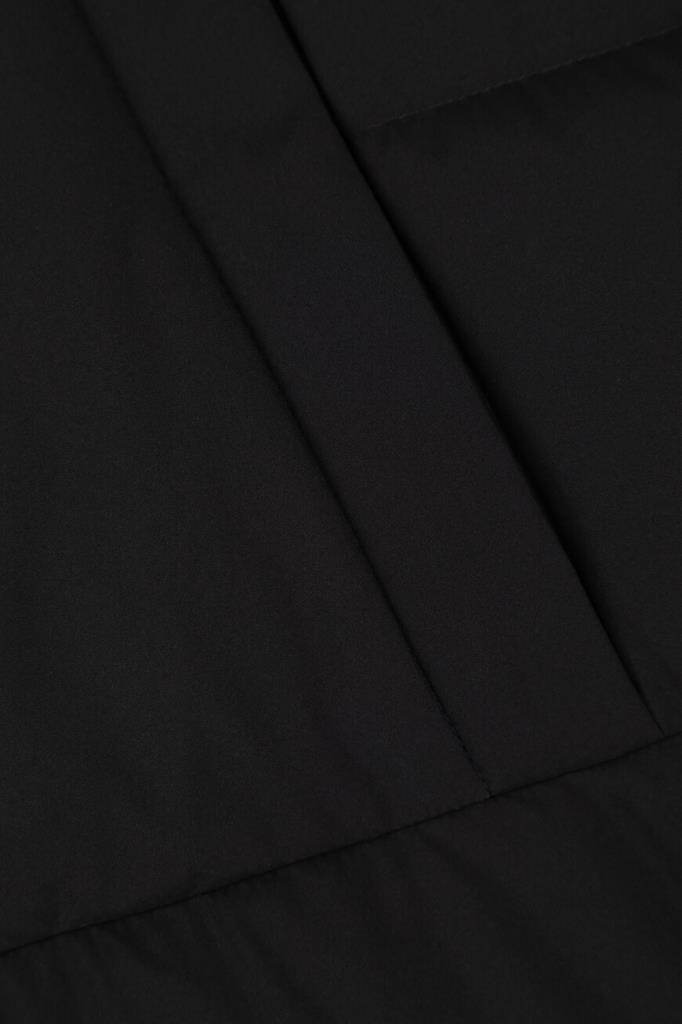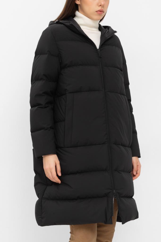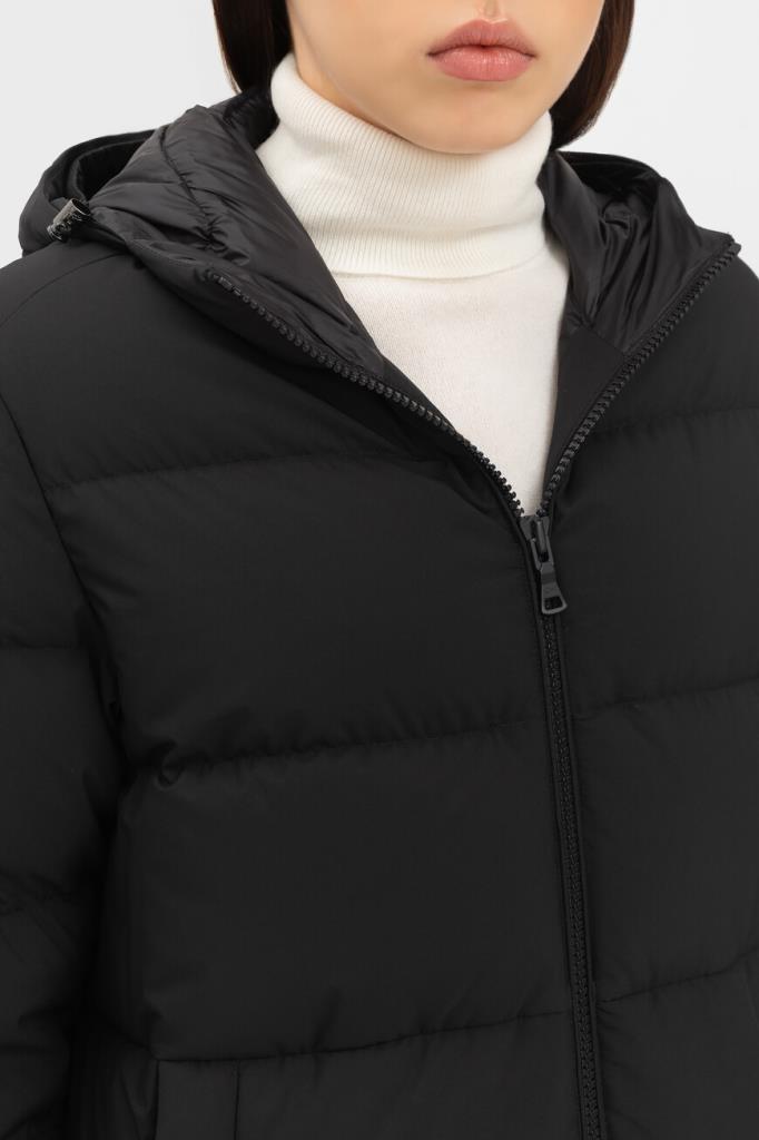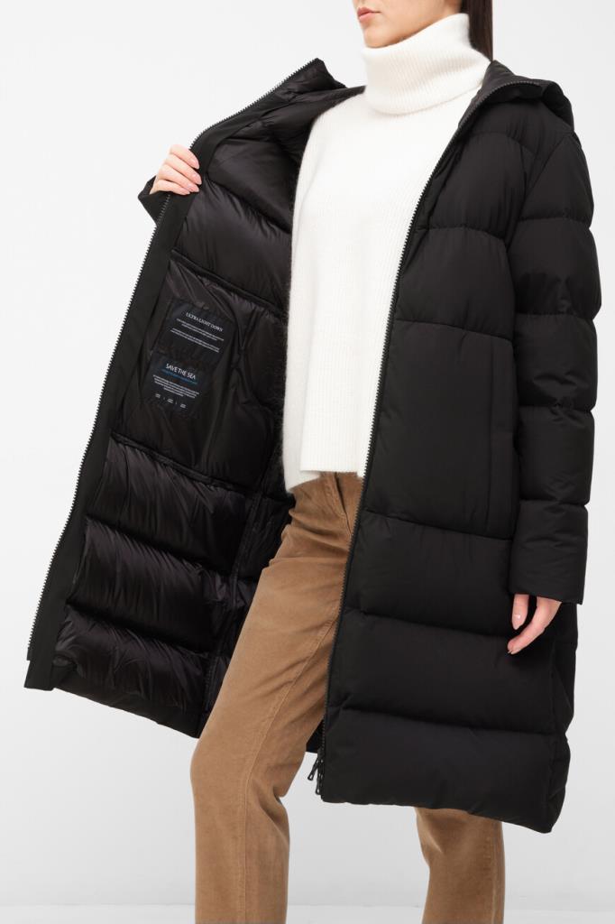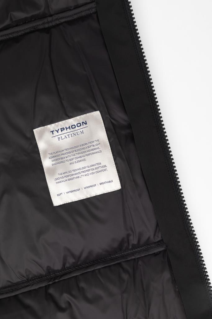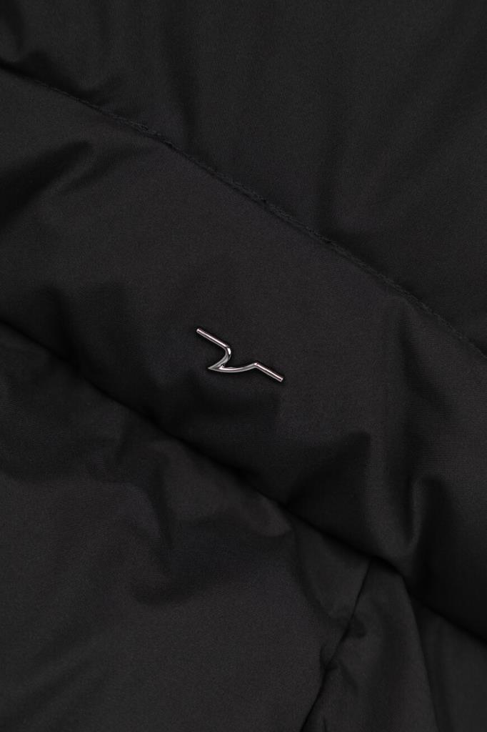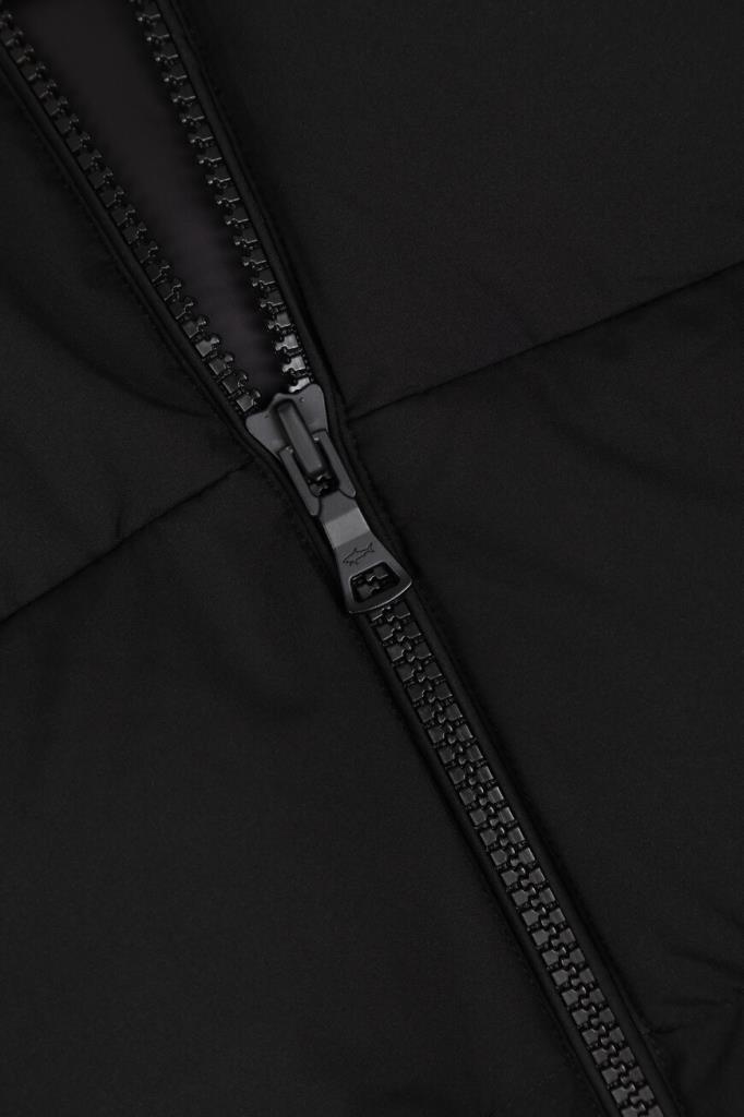 Пуховик Paul&Shark на встречной молнии с двумя брендированными пуллерами. Для создания модели свободного силуэта используется лёгкий мембранный материал Typhoon® Platinum на основе прочной микрофибры чёрного цвета, который не промокает, не продувается ветром и при этом не мешает воздуху свободно циркулировать. Отличительными деталями являются горизонтальная стёжка и металлический силуэт острого плавника акулы, расположенный на спинке. Особенностями изделия стали наличие глубокого капюшона на кулисках и наполнитель на основе натурального пуха и пера.