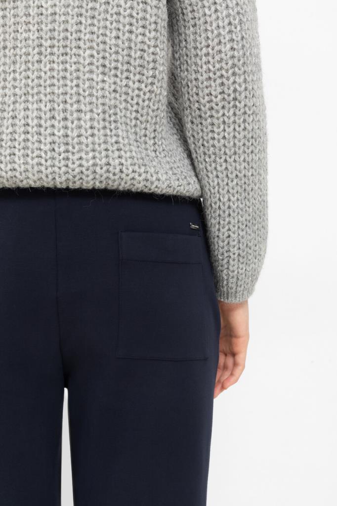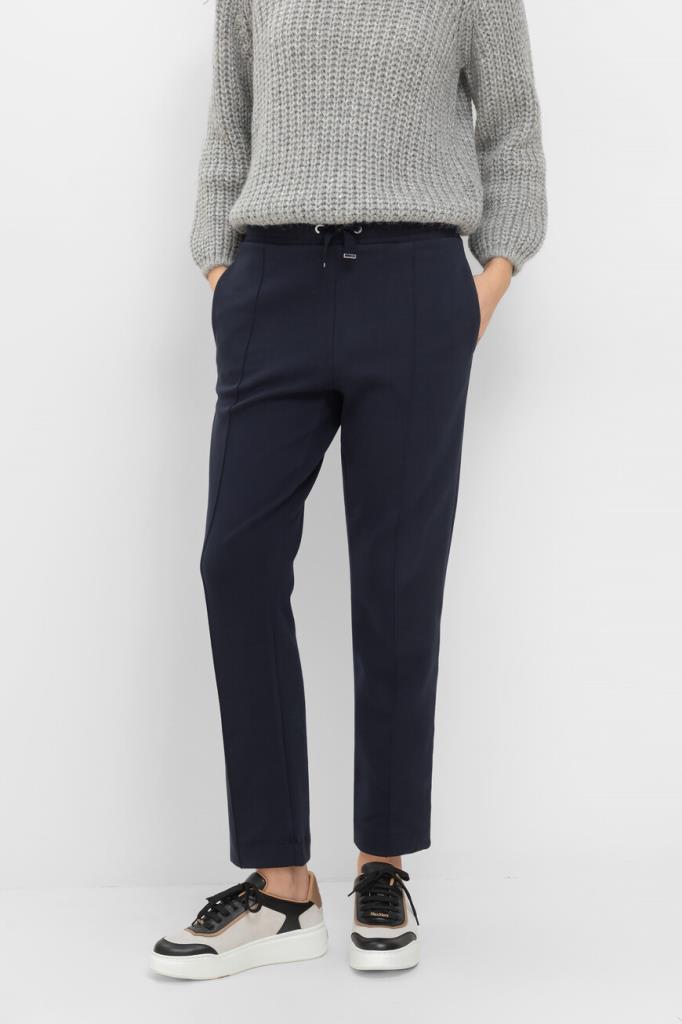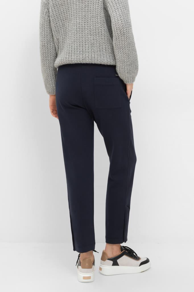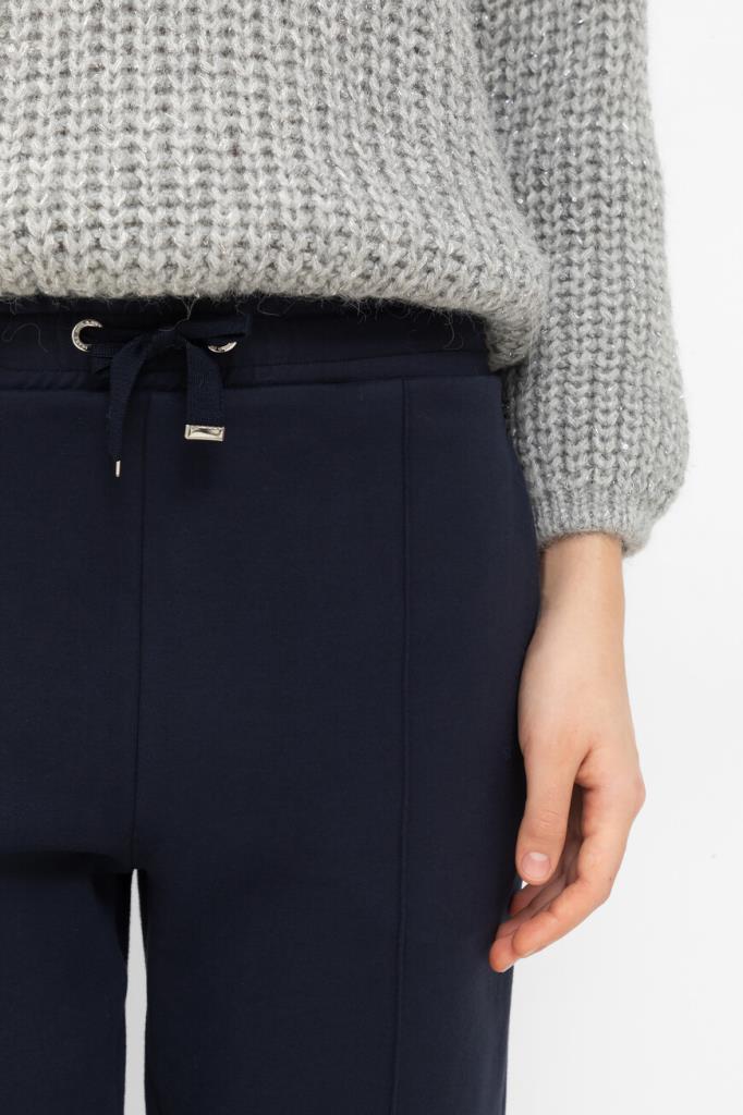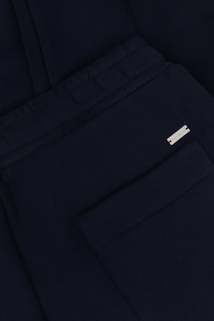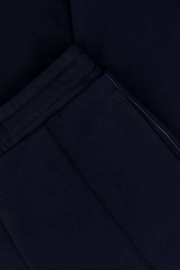 Тёмно-синие брюки с тремя карманами от бренда Paul&Shark. Для изготовления модели, выполненной в спортивном стиле, используется мягкий трикотаж на основе хлопка стрейч и прочного нейлона. Оптимальную посадку изделия по фигуре обеспечивает широкий эластичный пояс-кулиска. Декором выступают окантовка передних карманов на несколько тонов светлее основы и металлический лейбл с гравировкой, размещённый над правым задним карманом. Брюки интересны наличием отутюженных складок спереди и боковыми разрезами на потайных клёпках.