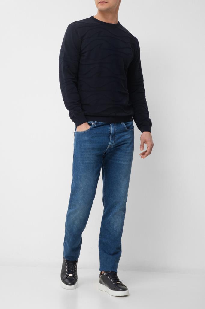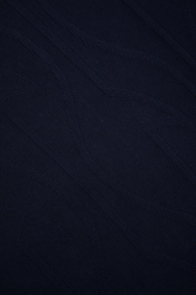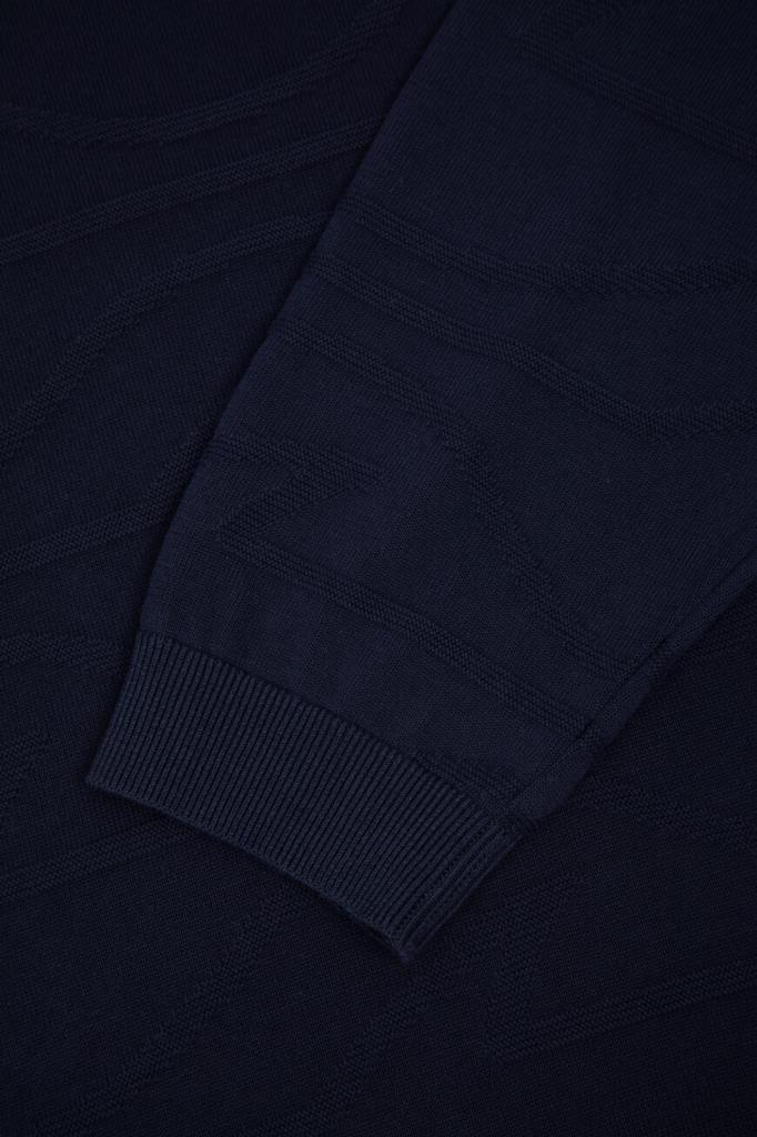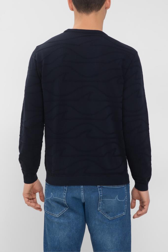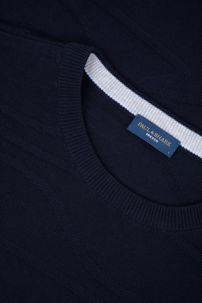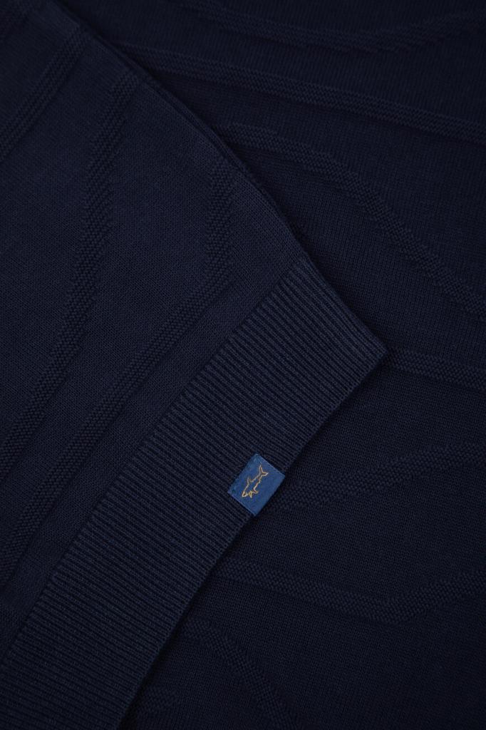 Джемпер тёмно-синего цвета от бренда Paul&Shark. На поверхности модели из тонкого хлопка вывязан рельефный узор в виде волн и силуэтов острых плавников акул в тон. Принадлежность изделия прямого силуэта Дому также подчёркнута вставкой с минималистичной символикой на широком эластичном поясе спереди. Джемпер с рифлёными круглой горловиной и манжетами рукавов легко впишется в любой повседневный комплект.