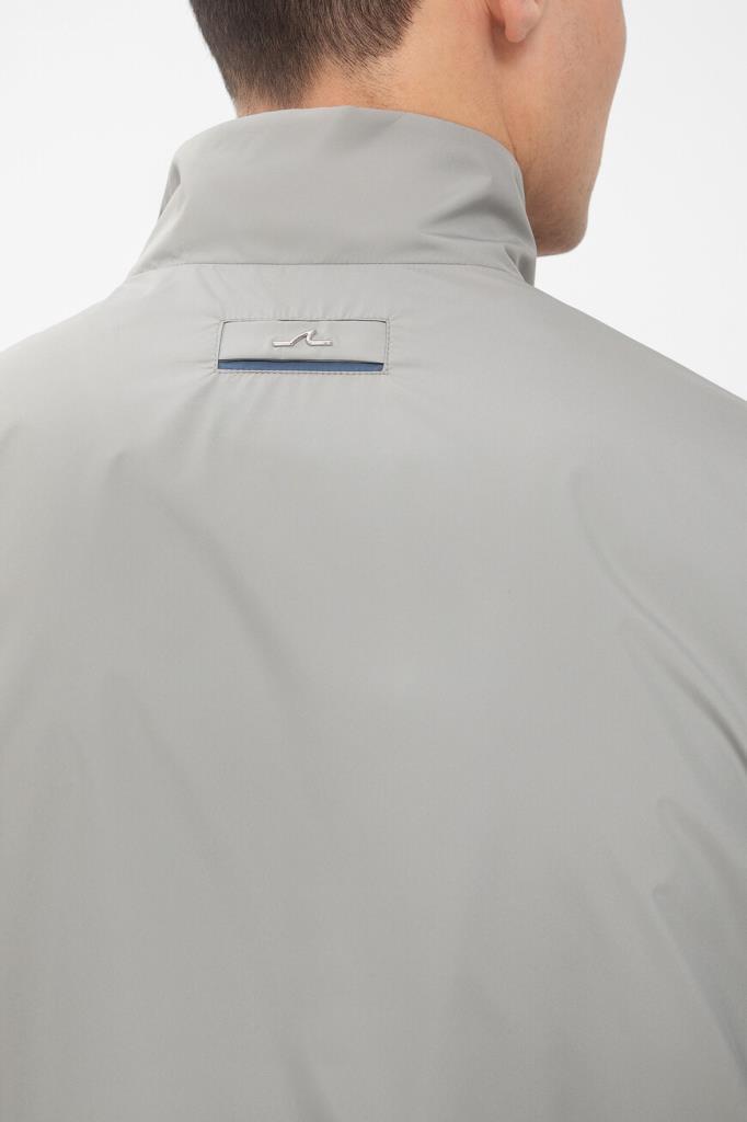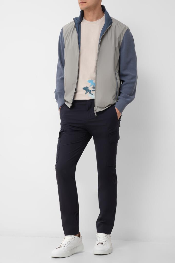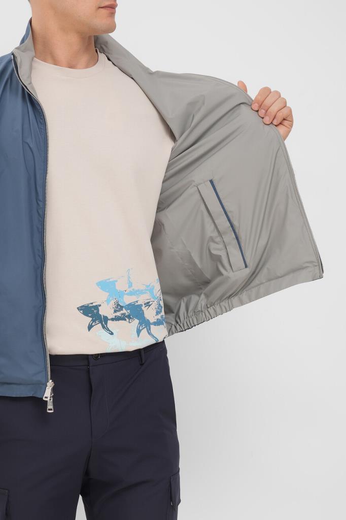 Двусторонняя комбинированная куртка в спортивном стиле от бренда Paul&Shark. Передняя сторона и спинка выполнены из полиэстера светло-серого и синего оттенков, а длинные рукава связаны из полиэфира и прочного вискозного волокна лицевой гладью. Принадлежность изделия прямого силуэта Дому обозначена вставкой с острым металлическим плавником акулы на спинке светло-серой стороны куртки и деталью со знаковой символикой на кармане синей стороны.
