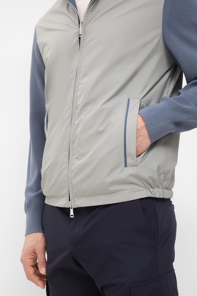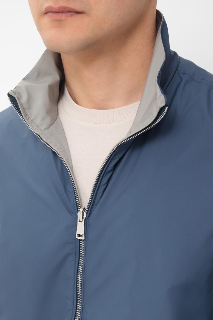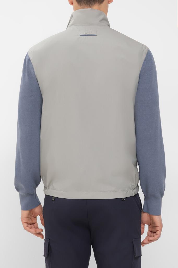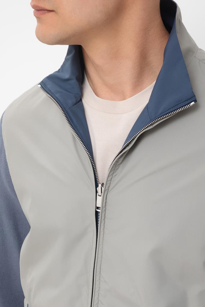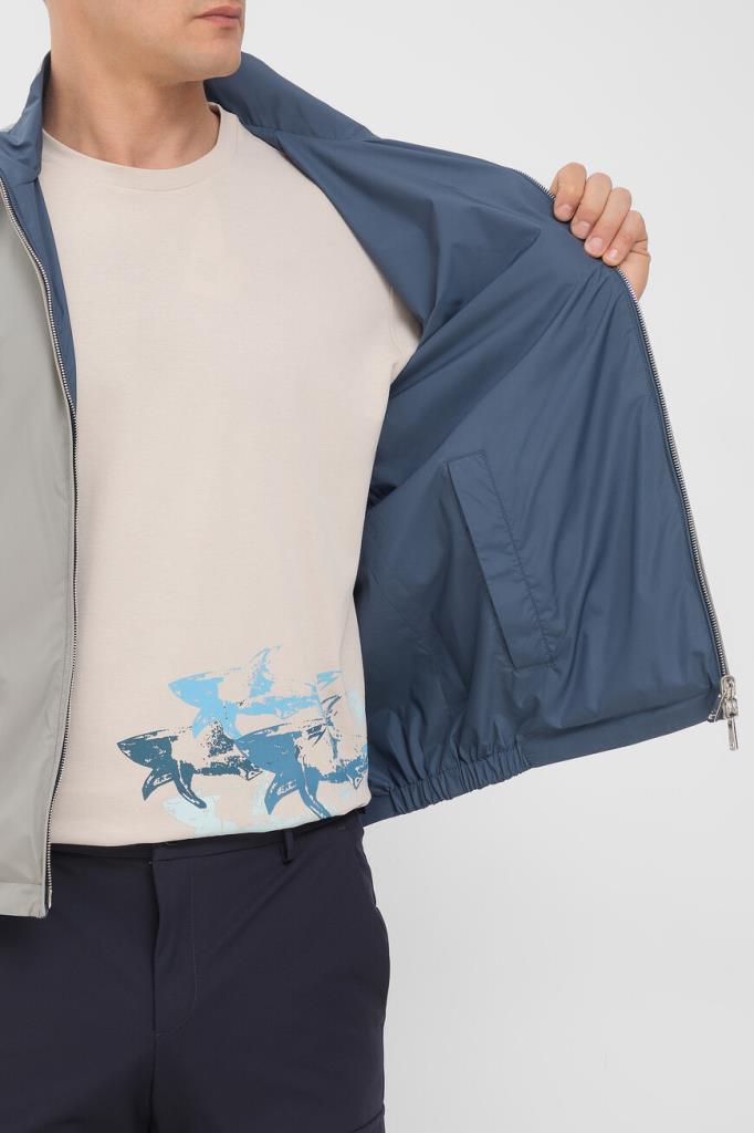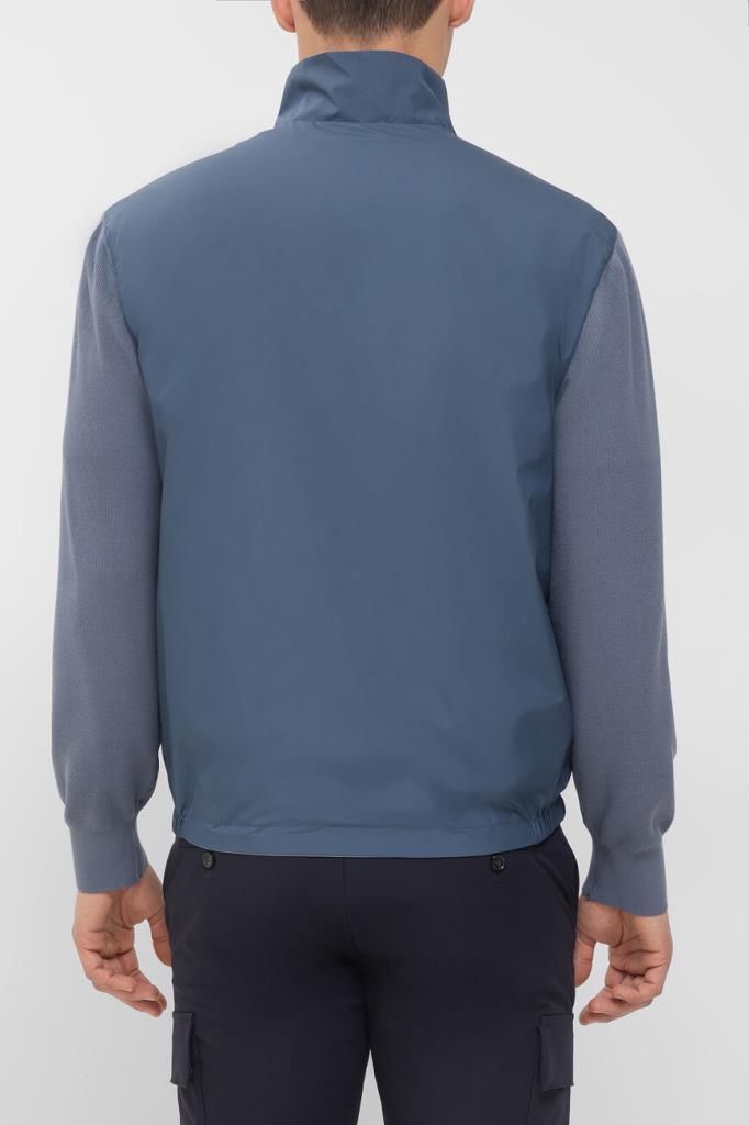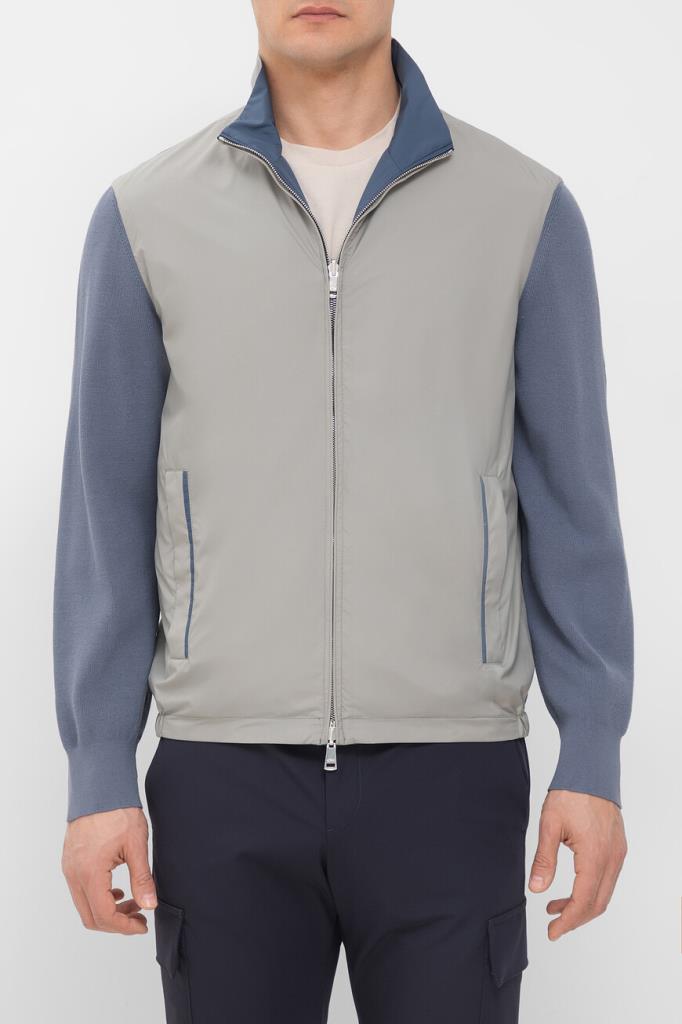 Двусторонняя комбинированная куртка в спортивном стиле от бренда Paul&Shark. Передняя сторона и спинка выполнены из полиэстера светло-серого и синего оттенков, а длинные рукава связаны из полиэфира и прочного вискозного волокна лицевой гладью. Принадлежность изделия прямого силуэта Дому обозначена вставкой с острым металлическим плавником акулы на спинке светло-серой стороны куртки и деталью со знаковой символикой на кармане синей стороны.