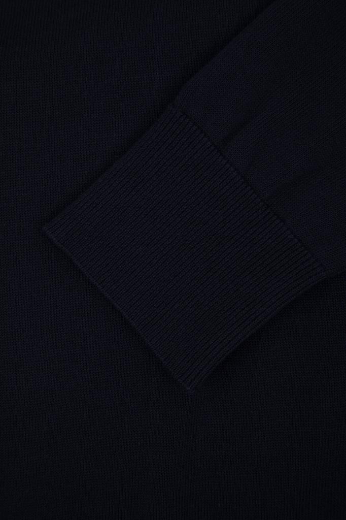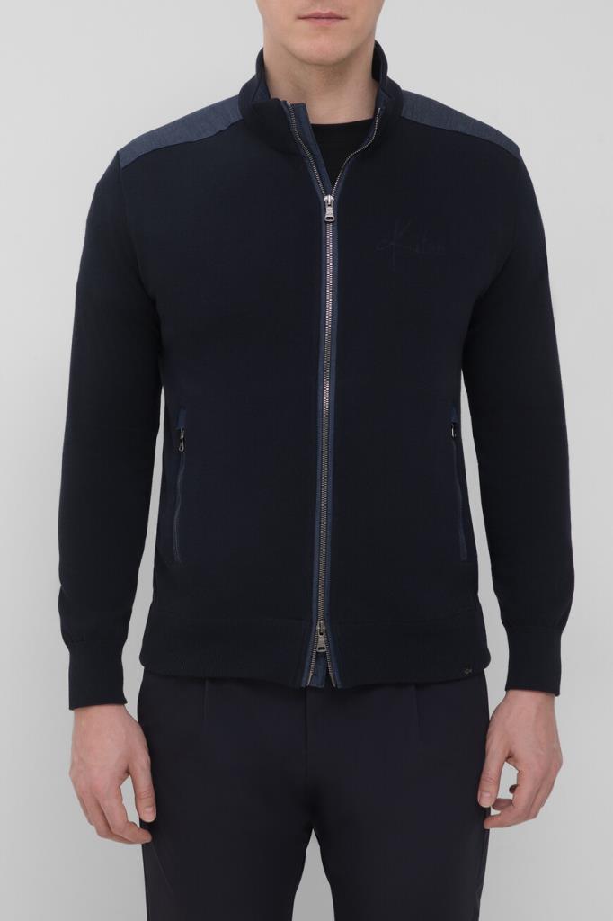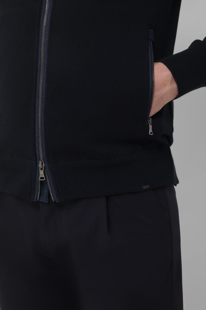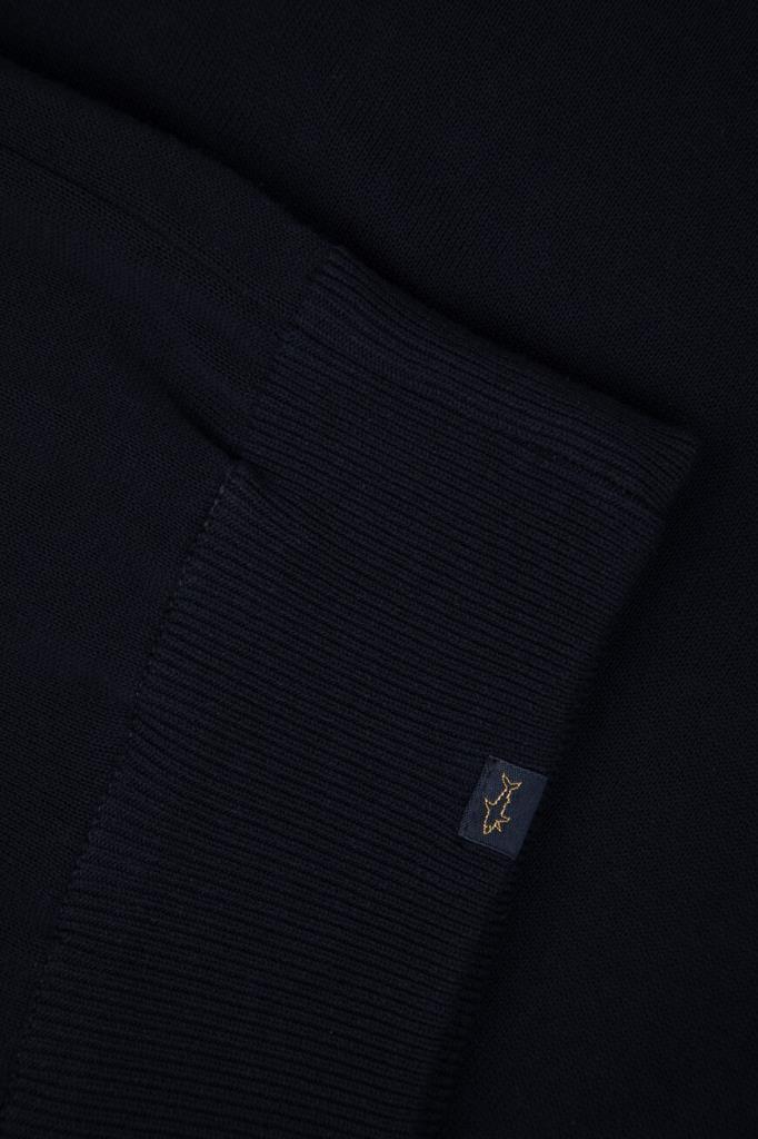 Хлопковая толстовка Paul&Shark связана лицевой гладью. Для изготовления модели тёмно-синего цвета используется тонкая, но очень прочная нить FRESCO, идеально подходящая для жаркого времени года. Особенностями изделия являются вставки из мягкого синего денима на уровне плеч, внутренней стороне невысокого воротника-стойки, сверху на спинке и в отделке молний. Толстовка выполнена в коллаборации с другим итальянским брендом Kiton, о чём свидетельствует дизайнерская надпись-логотип, размещённая слева на груди. О принадлежности модели Дому Paul&Shark деликатно напоминает вставка с изображением акулы.