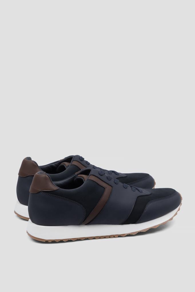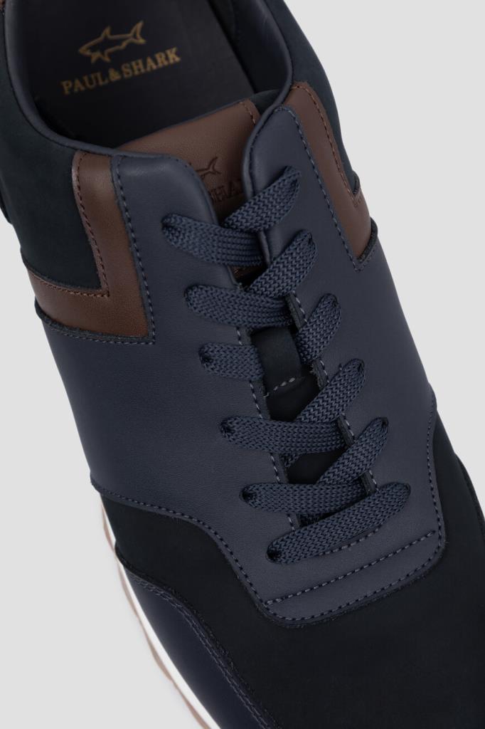 Кроссовки с закрытой перекрёстной шнуровкой от бренда Paul&Shark. Модель изготовлена из комбинации гладкой кожи быка и бархатистой замши в сине-коричневой гамме. Роль минималистичного знакового декора отдана тиснёным надписи-логотипу и изображению акулы на язычке и золотистой символике на кожаных стельках. Пара установлена на объёмную двухцветную подошву из полимера и резины с рифлением снизу для надёжного сцепления с дорогой.