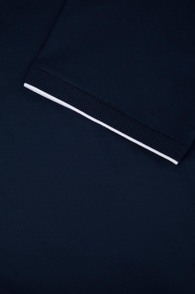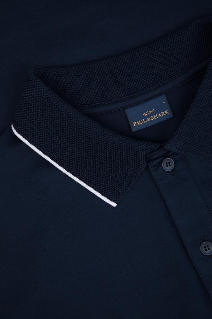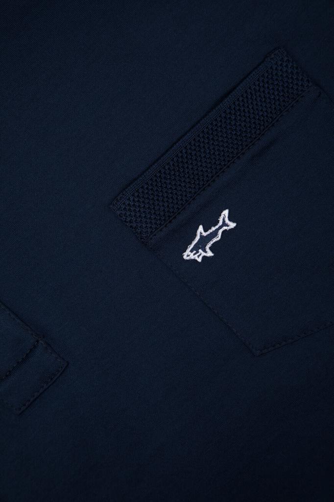 Прямое поло Paul&Shark с нагрудным накладным карманом слева. Для создания повседневной модели тёмно-синего цвета используется мягкое хлопковое джерси. Отличительными деталями стали белые полосы-окантовка на отложном воротнике и манжетах рукавов, вышитая знаковая символика Дома - белое изображение акулы на кармане и изящные неглубокие разрезы снизу по бокам. Горловина, карман и манжеты украшены фактурным геометрическим узором в тон.