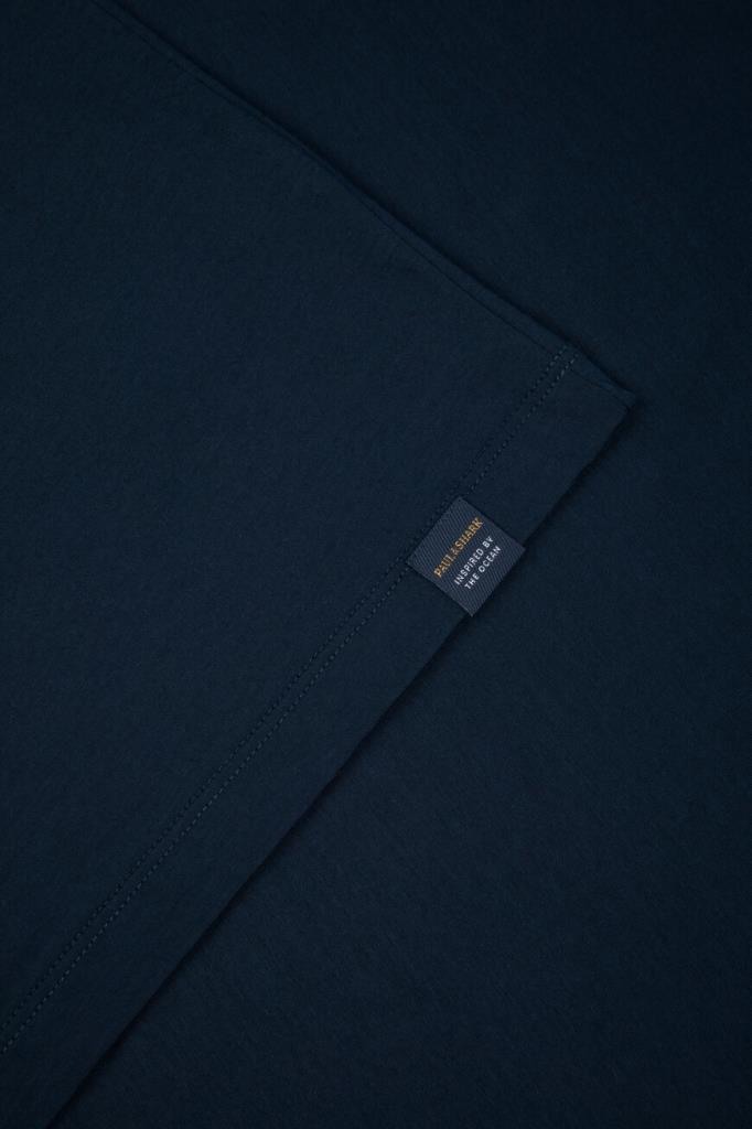 Футболка с круглым вырезом горловины на резинке от бренда Paul&Shark. Коллекция Riviera Hello Capri передаёт расслабленную сущность лета в объятиях ярких оттенков и света на итальянском острове. Изделие выполнено из тёмно-синего джерси на основе хлопка и лиоцелла с обработкой X-Soft, которая делает ткань очень мягкой на ощупь. Спереди размещён тропический принт в акварельной технике с изображением акул и дизайнерской надписью, а сзади — белая культовая вышивка.