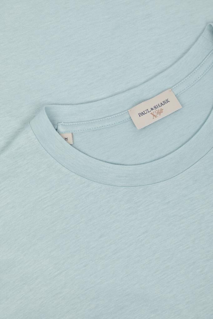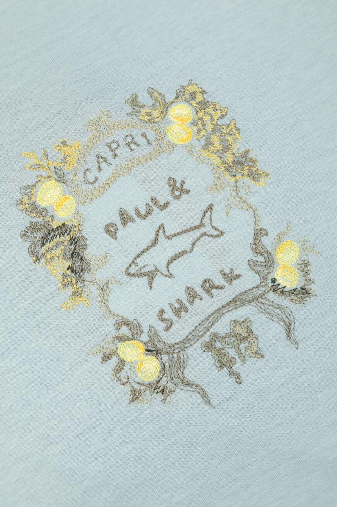 Прямая футболка Paul&Shark входит в коллекцию Riviera Hello Capri. Коллекция передаёт сущность острова, рассказывая о лёгкой атмосфере летнего сезона. Для изготовления повседневной модели выбрано гладкое джерси на основе хлопка и лиоцелла голубого оттенка с обработкой X-Soft, которая делает ткань очень мягкой на ощупь. Отличительной деталью является крупная дизайнерская вышивка с логотипом и символикой Дома, размещённая слева на груди.