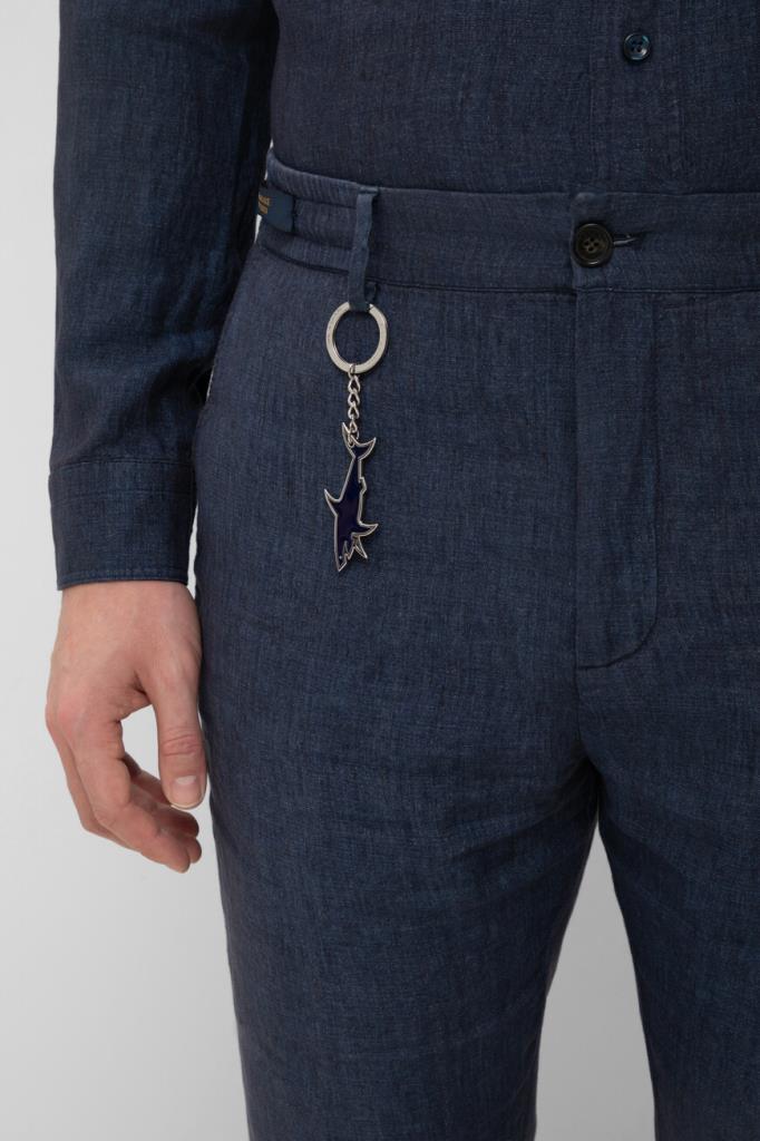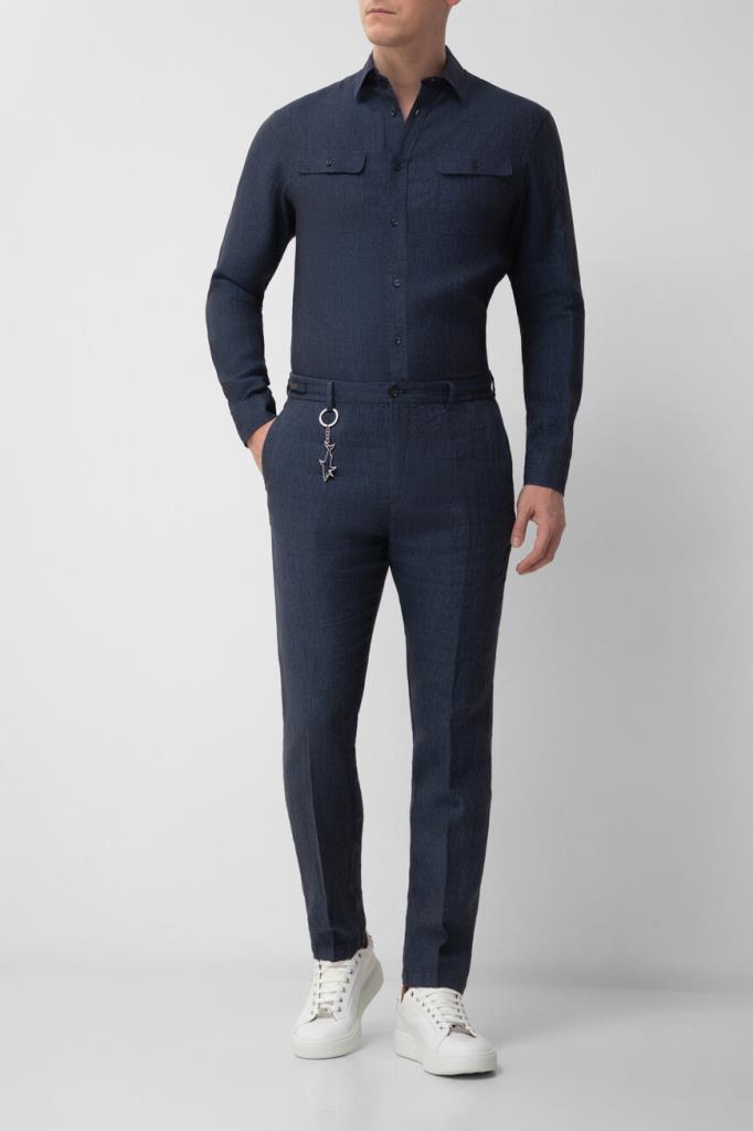 Льняные брюки Paul&Shark на потайной молнии и крупной роговой пуговице. Изделие из такого тонкого материала хорошо пропускает воздух, поддерживая оптимальный микроклимат. Модель прямого силуэта окрашена в тёмно-синий оттенок и украшена брелком с крупной эмалированной акулой, идущим в комплекте и делающим отсылку к Дому. Брюки с плотным широким поясом со шлевками под ремень и эластичной вставкой станут неотъемлемой частью мужского гардероба в стиле casual.