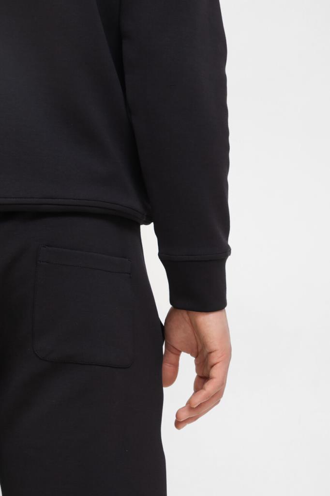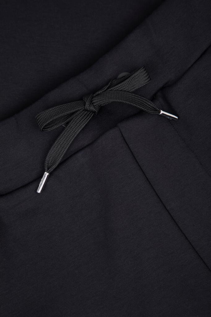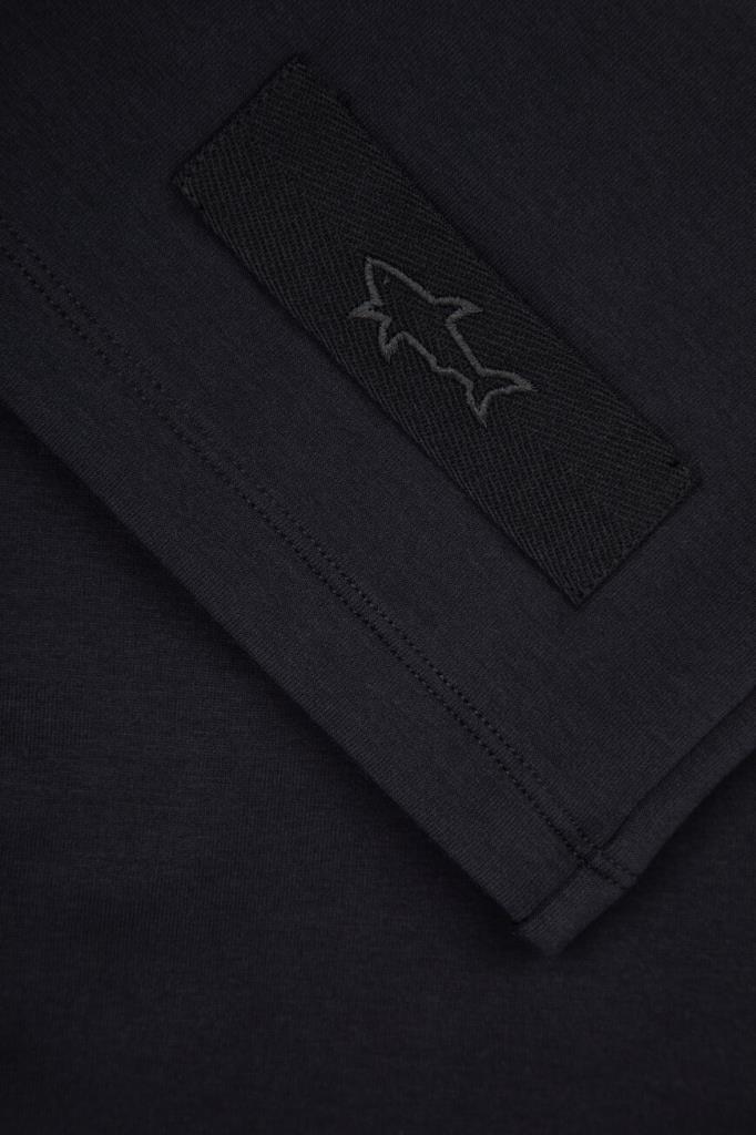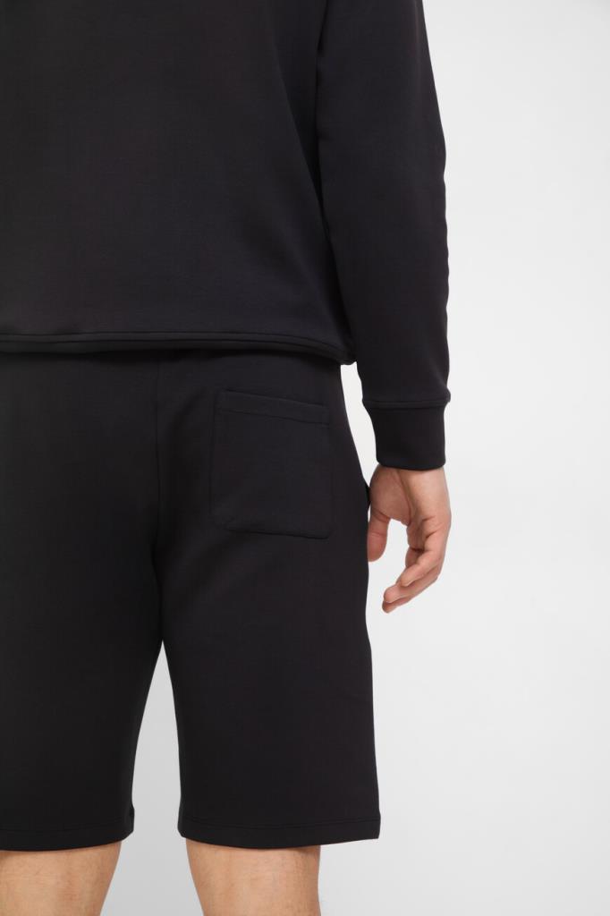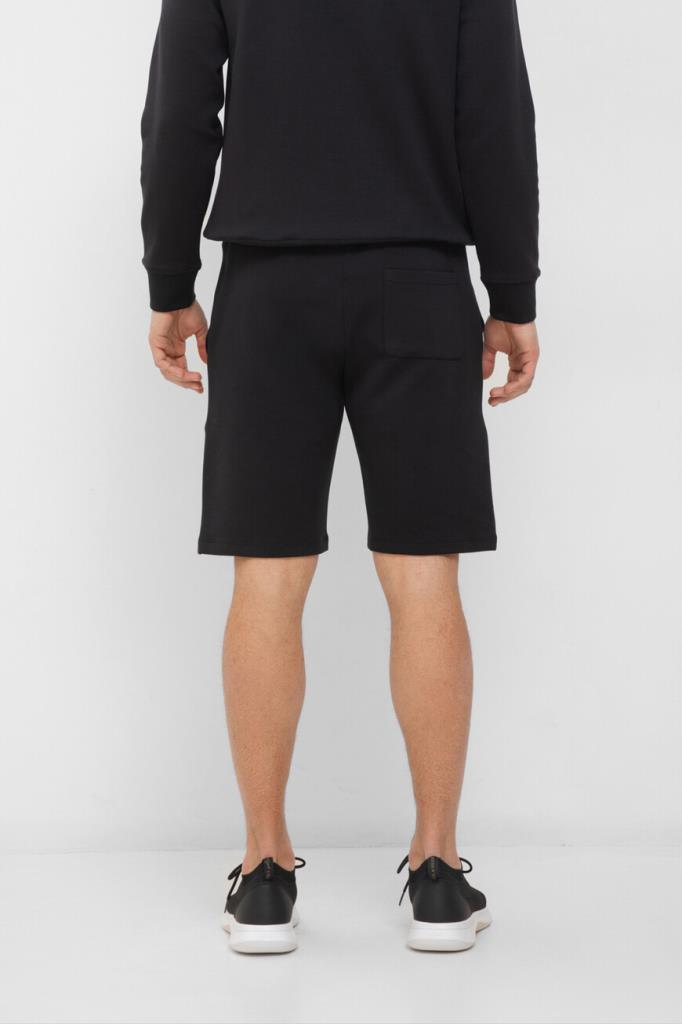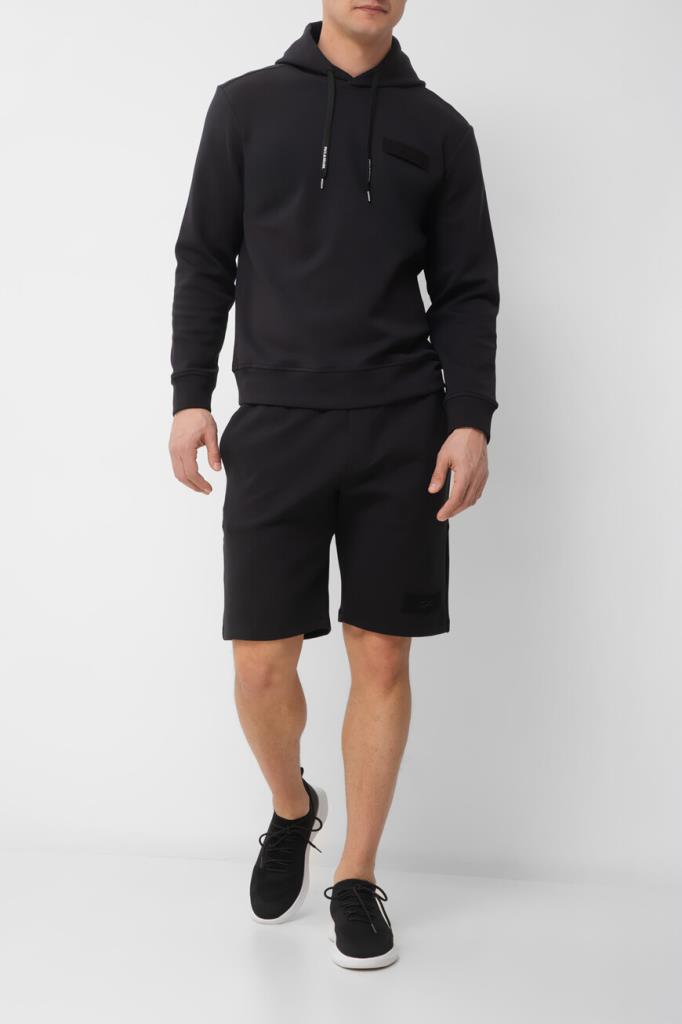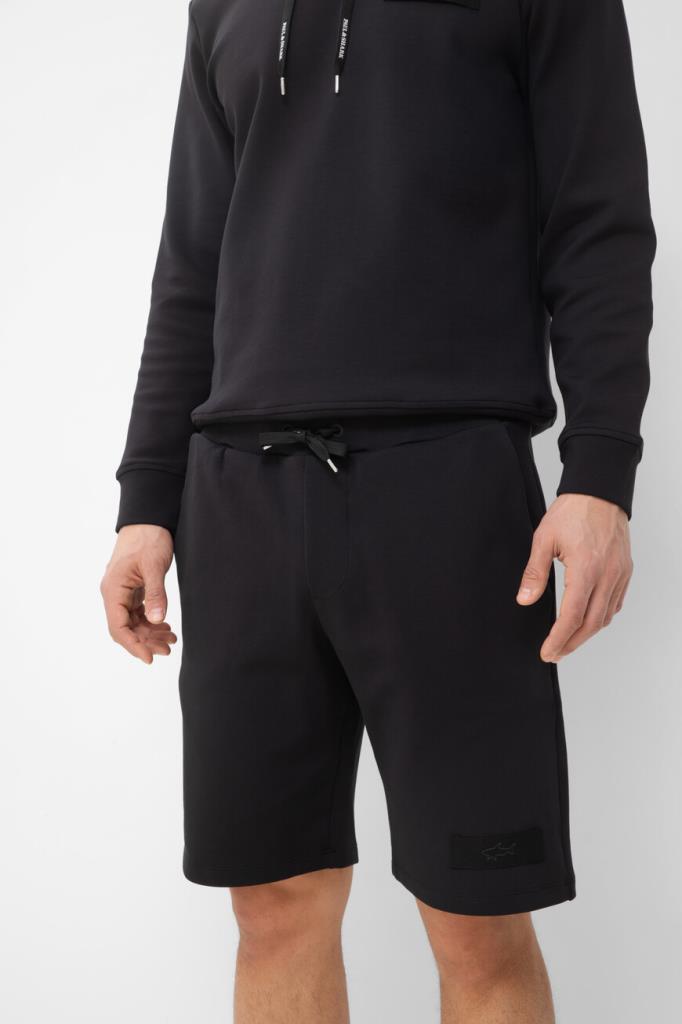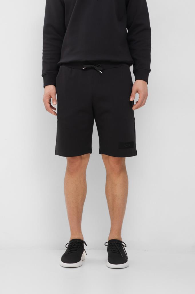 Прямые бермуды Paul&Shark поддержат образы в спортивном стиле. Модель с тремя карманами выполнена из эластичного трикотажа на основе хлопка и нейлона чёрного цвета. За удобную посадку изделия по фигуре отвечает плотный пояс на брендированных завязках-кулиске. На принадлежность бермудов Дому указывает текстильная прямоугольная вставка с вышитым изображением акулы.