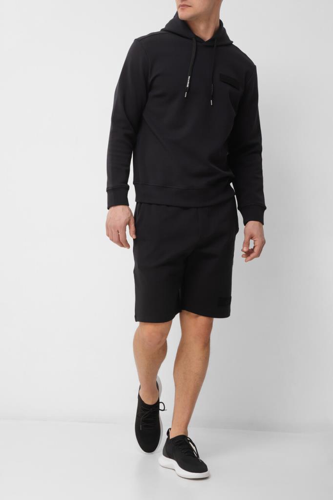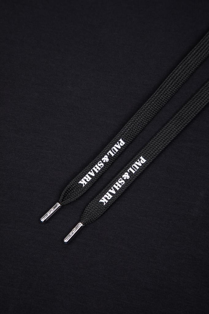Худи Paul&Shark с манжетами рукавов и широким поясом для оптимальной посадки. Модель изготовлена из мягкого трикотажа на основе хлопка стрейч и прочного нейлона чёрного цвета. Декором выступают контрастные надписи-лого на завязках глубокого капюшона и текстильная прямоугольная вставка с вышитым изображением акулы слева на груди. Образ можно завершить бермудами прямого силуэта из той же коллекции.