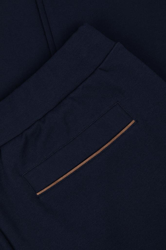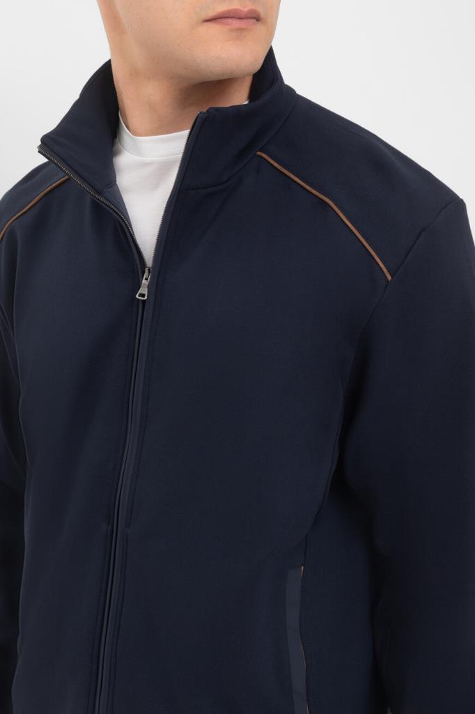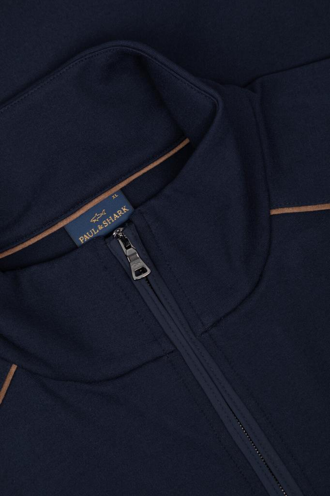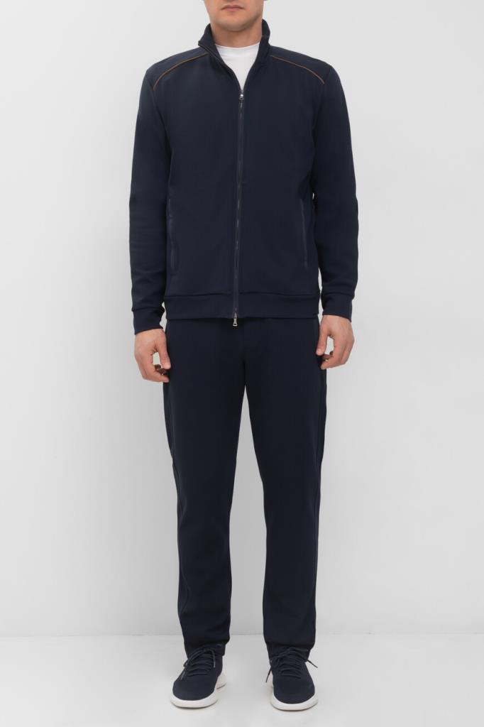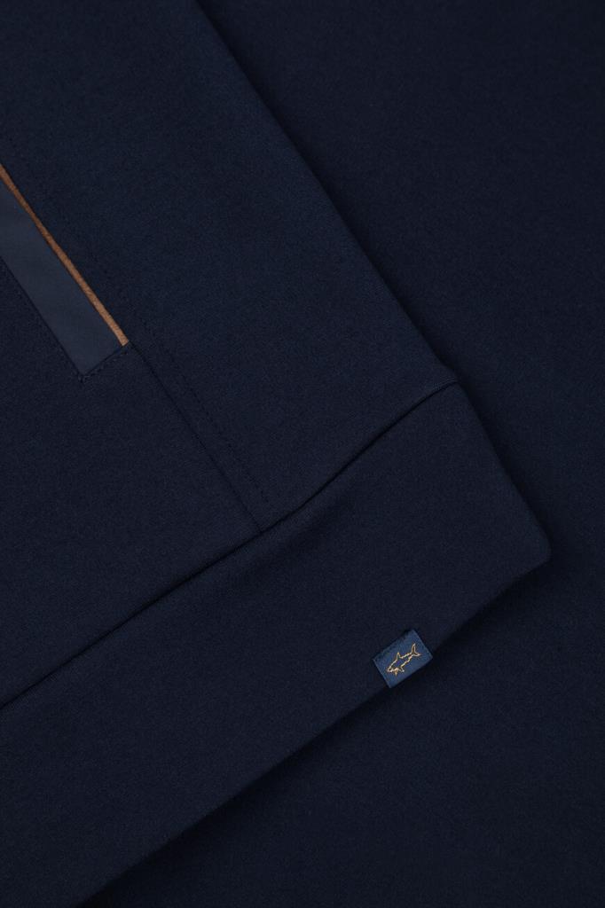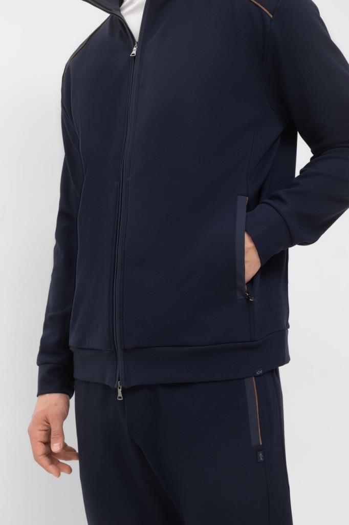 Спортивный костюм Paul&Shark выполнен в тёмно-синем цвете. Комплект состоит из толстовки прямого силуэта на встречной молнии с двумя брендированными пуллерами и брюк с тремя прорезными карманами. Отличительными деталями являются синие вставки с изображением акулы на широком плотном поясе толстовки и под левым передним карманом брюк. Изделие обрамлено узкими рельефными полосами-кантом из алькантары коричневого оттенка.