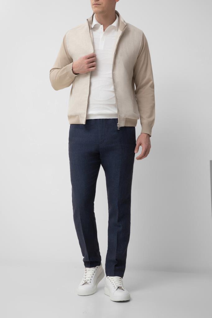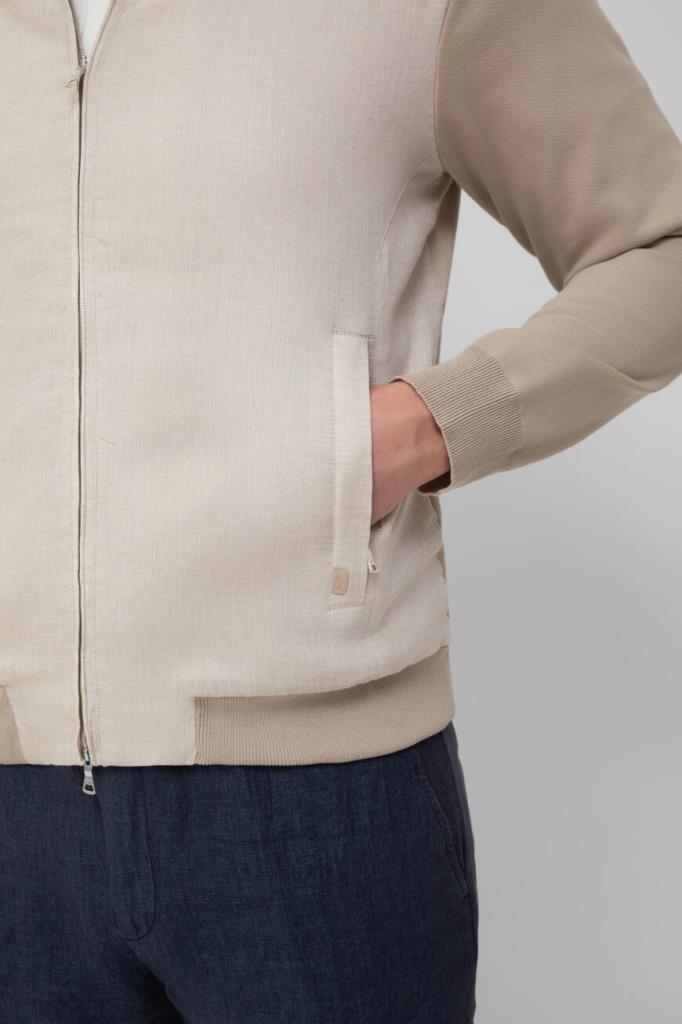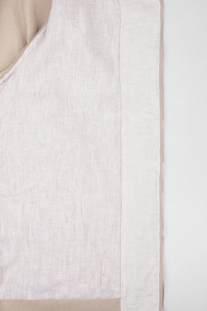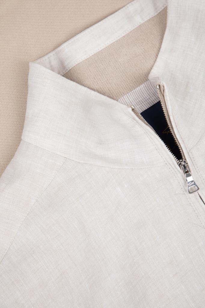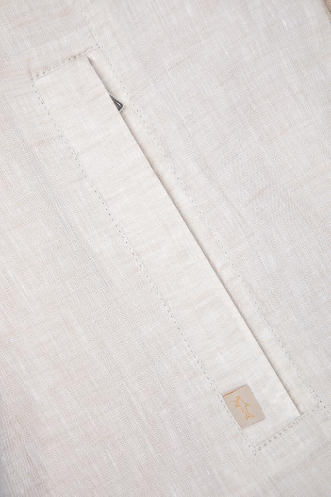Комбинированный кардиган Paul&Shark выполнен в бежевых тонах. Изделие из прочного тонкого хлопка Fresco дополнено вставками из льна спереди и на кокетке. Фасон современной модели предполагает прямой силуэт и застёжку на встречную молнию с двумя брендированными пуллерами. За надёжную защиту от порывов ветра отвечает высокий воротник-стойка. Атрибутами Дома являются минималистичная вставка с изображением акулы на левом прорезном кармане и серебристая металлическая деталь в виде острого плавника акулы сзади на воротнике.
