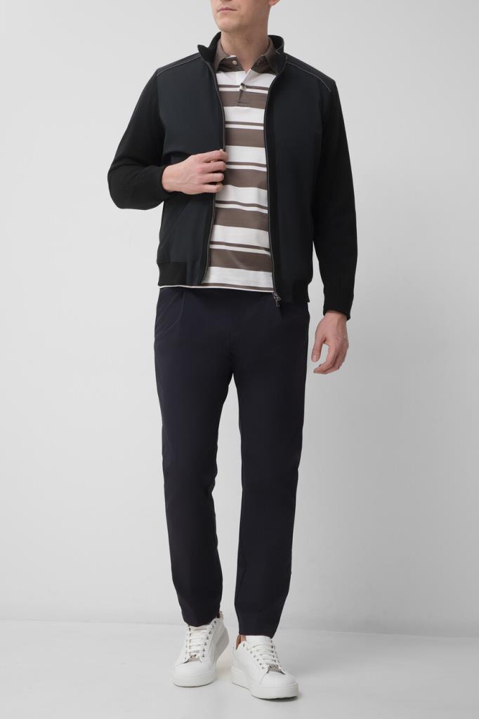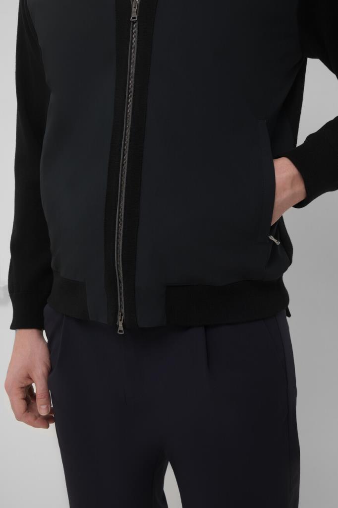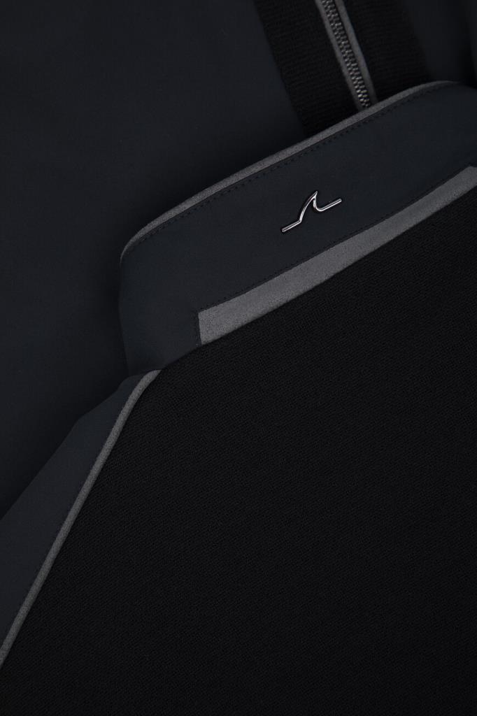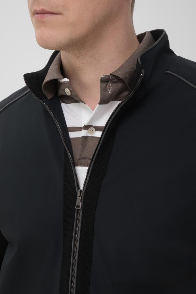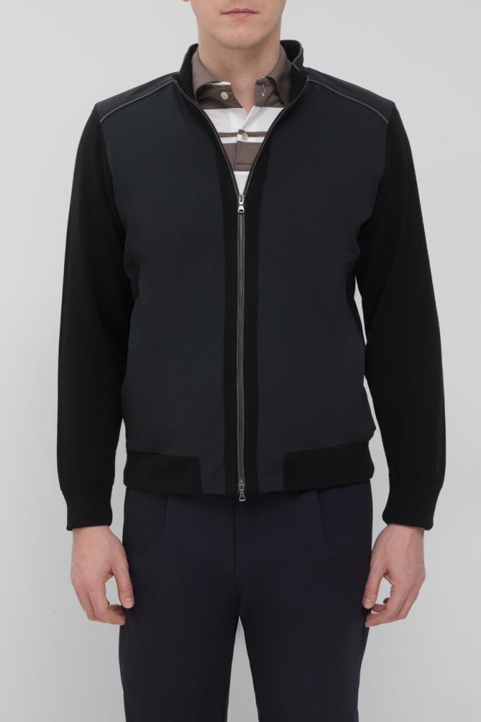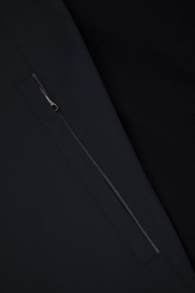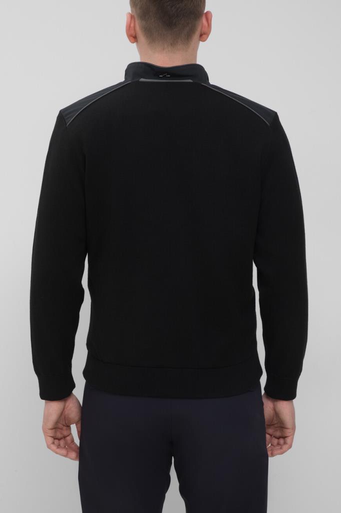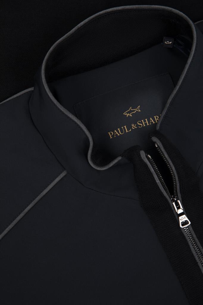 Гибридный свитер-ветровка Paul&Shark с невысоким воротником-стойкой. Изделие выполнено из комбинации мягкой чёрной шерсти первичного пострига и плотной эластичной ткани Typhoon® Re-4X4 Stretch на вставках в тон, обеспечивающей надёжную защиту от дождя и порывов ветра. Функциональный дизайн лёгкой модели, созданной по проекту Save the Sea, предполагает наличие прорезных карманов на молнии по бокам и застёжки на встречную молнию с двумя брендированными пуллерами.
