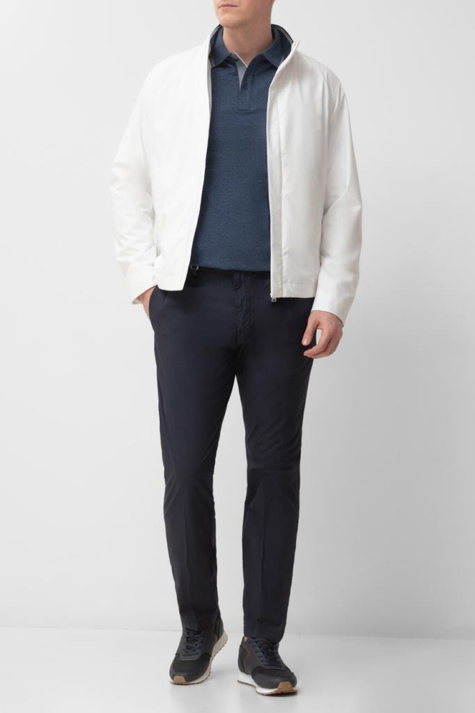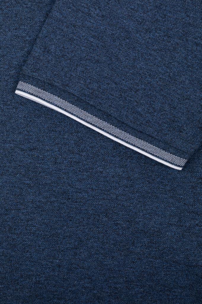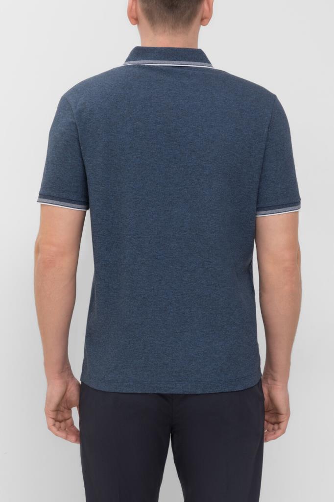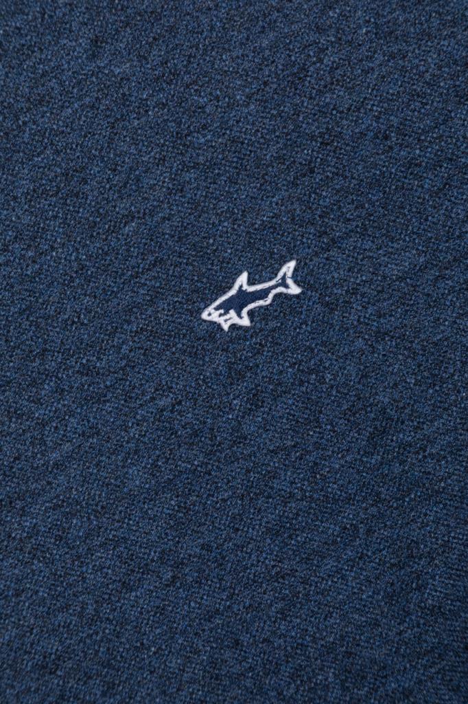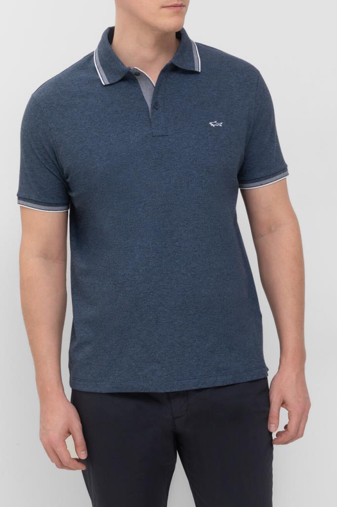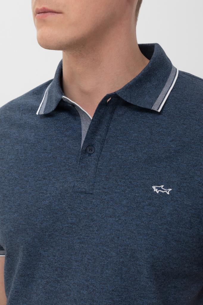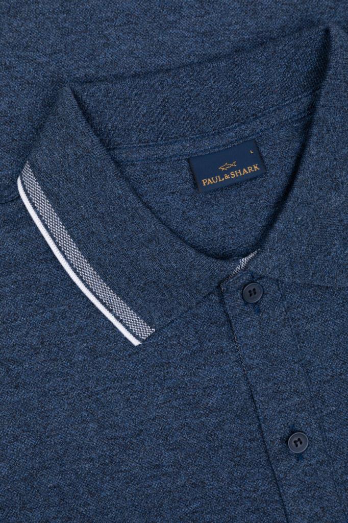 Синее поло из хлопкового трикотажа Jaspé Piqué от бренда Paul&Shark. Дышащая меланжевая модель характеризуется прямым силуэтом и наличием коротких рукавов. Отложной воротник, внутренняя сторона планки застёжки и манжеты оформлены белыми полосами-кантом. Принадлежность изделия Дому деликатно обозначена вышитым изображением акулы слева на груди.