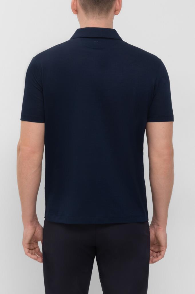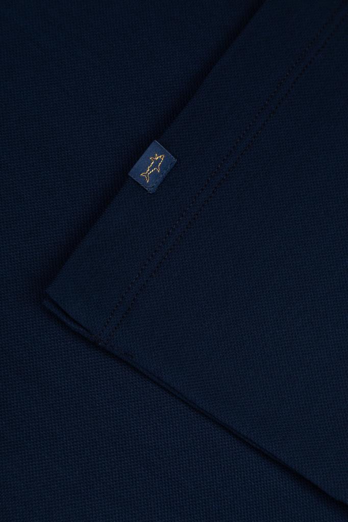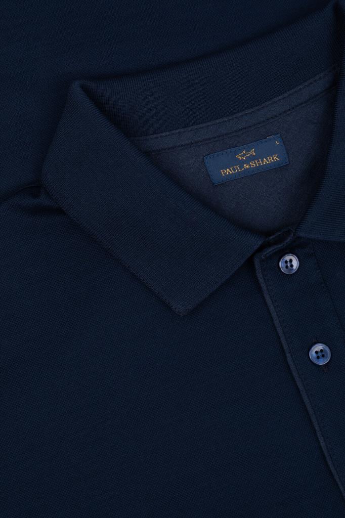 Дышащее поло с короткими рукавами от бренда Paul&Shark. Фасон изделия из тонкого хлопкового пике тёмно-синего цвета предполагает прямой силуэт и застёжку на три перламутровые пуговицы сверху. Декором выступают минималистичная вышивка в виде острого плавника акулы в тон на кокетке и вставка из лёгкого мягкого льна на изнаночной стороне под воротником.