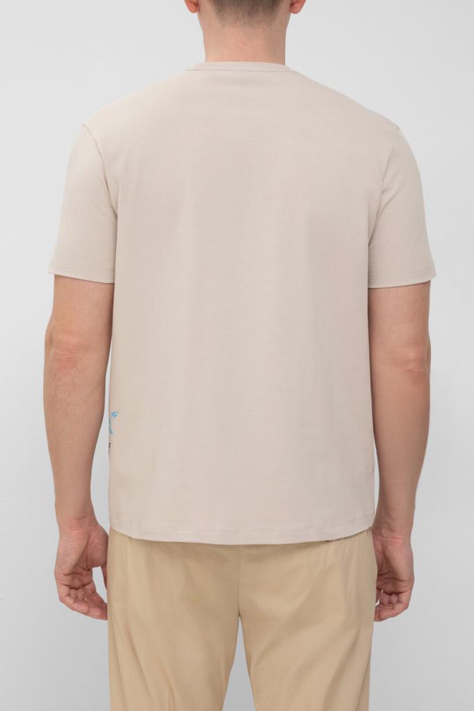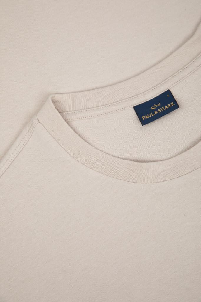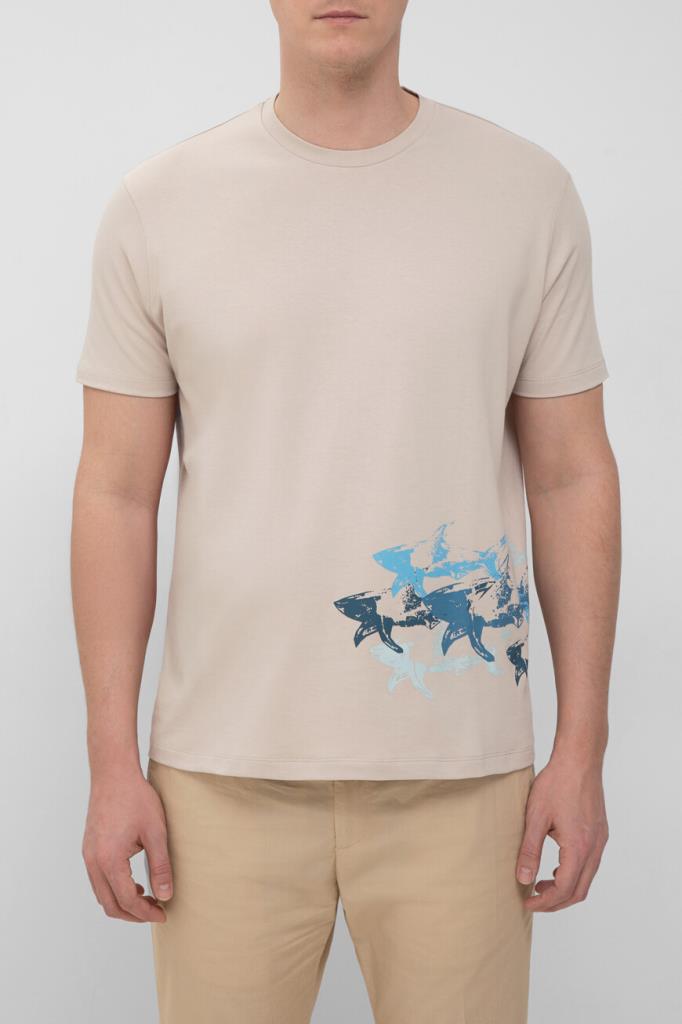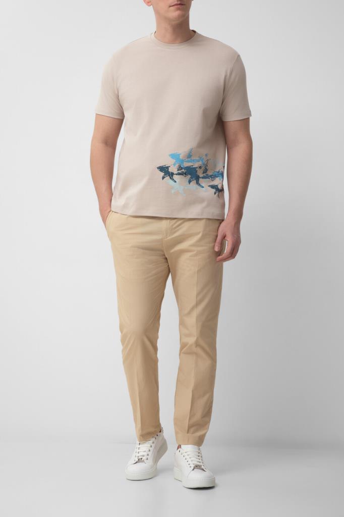 Бежевая футболка Paul&Shark с круглым вырезом горловины на резинке. Для пошива изделия прямого силуэта выбрано мягкое джерси из чистого дышащего хлопка. Модель декорирована крупным потёртым принтом в виде стаи акул, словно нарисованным масляной краской спереди от руки. Этот универсальный элемент повседневного мужского гардероба можно сочетать с брюками, джинсами или шортами из той же коллекции.