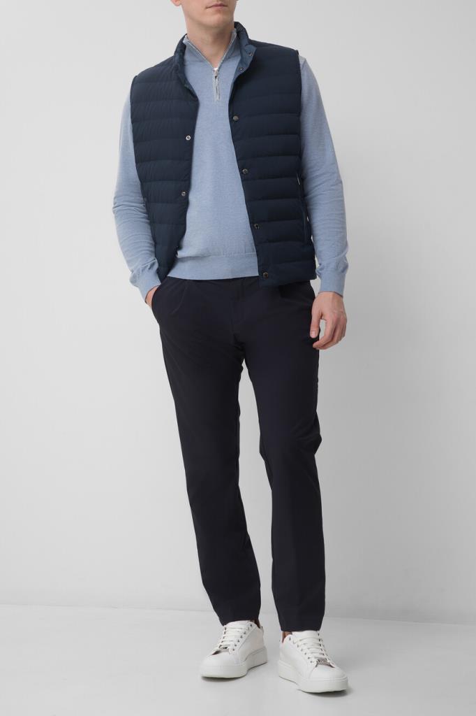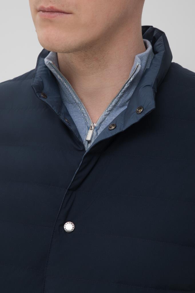 Тёмно-синий жилет Paul&Shark на брендированных металлических клёпках. Для производства модели выбрана прочная мембранная ткань Typhoon® Platinum, которая надёжно защищает от сильного ветра и влаги. Отличительными особенностями изделия стали горизонтальная стёжка и минималистичный декор в виде петли с острым металлическим плавником акулы на спинке. Жилет прямого силуэта утеплён натуральными пухом и пером.