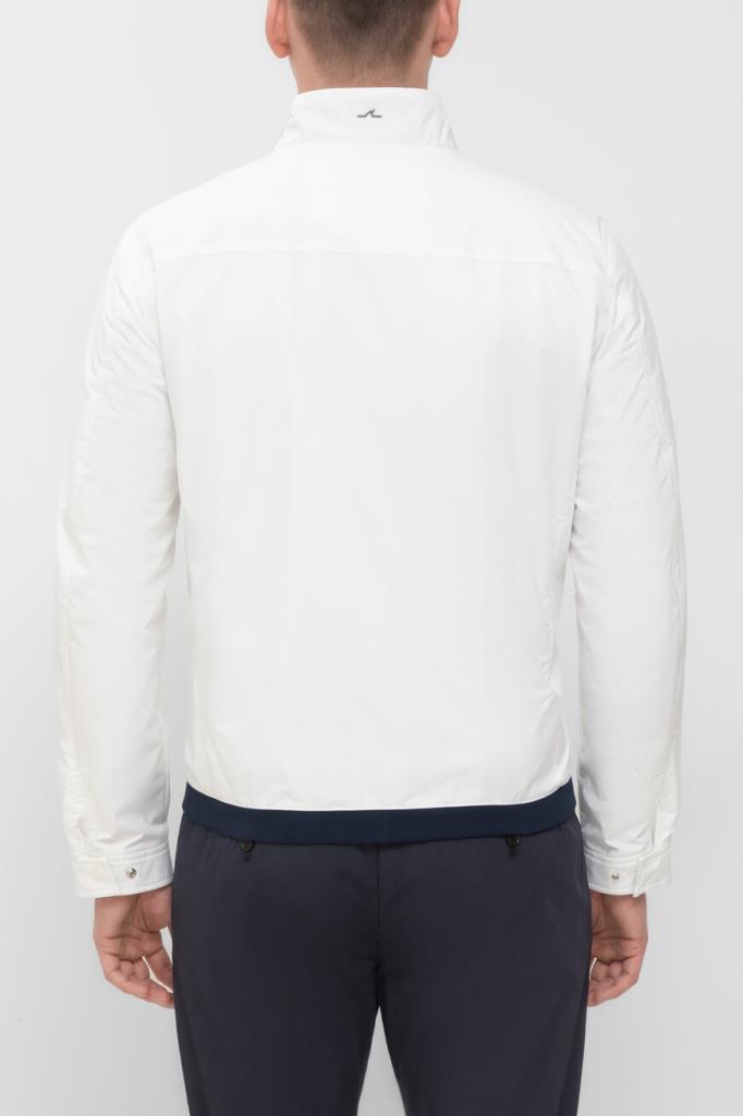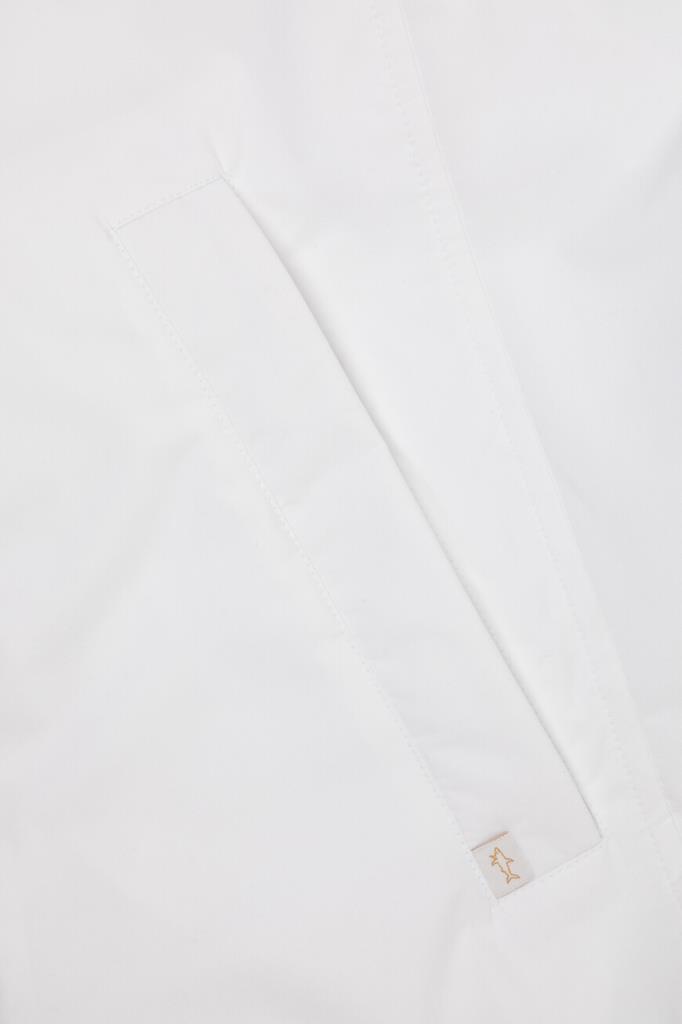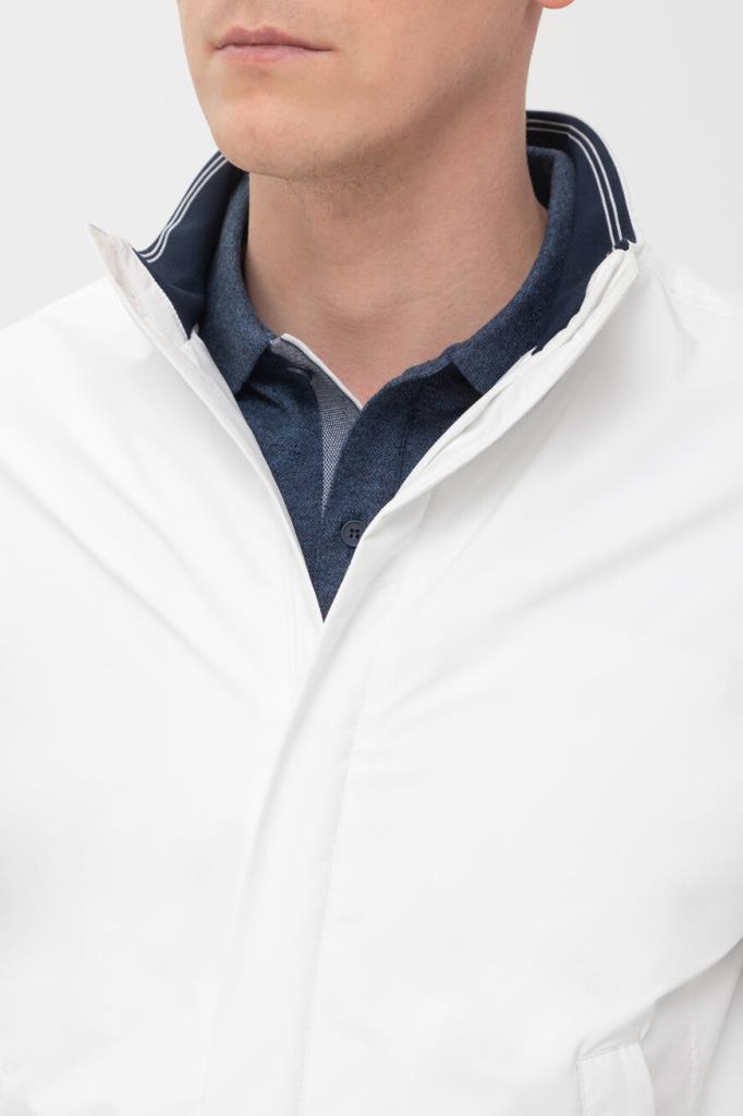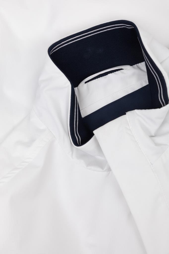 Белая куртка прямого силуэта от бренда Paul&Shark. Функциональная модель изготовлена из прочного полиэфира - ткани Typhoon® Pertex® Shield Revolve, покрытой уникальной водоотталкивающей пропиткой, благодаря которой капли воды не впитываются, а собираются на поверхности, легко скатываясь вниз. Лёгкое и дышащее изделие разработано для максимального комфорта во время активного отдыха на свежем воздухе. Фасон куртки, являющейся частью проекта Save the Sea, характеризуется наличием воротника-стойки и застёжкой на потайную молнию с двумя брендированными пуллерами и планкой. О принадлежности модели Дому деликатно напоминает металлический символ - острый плавник акулы Shark fin сзади на воротнике.