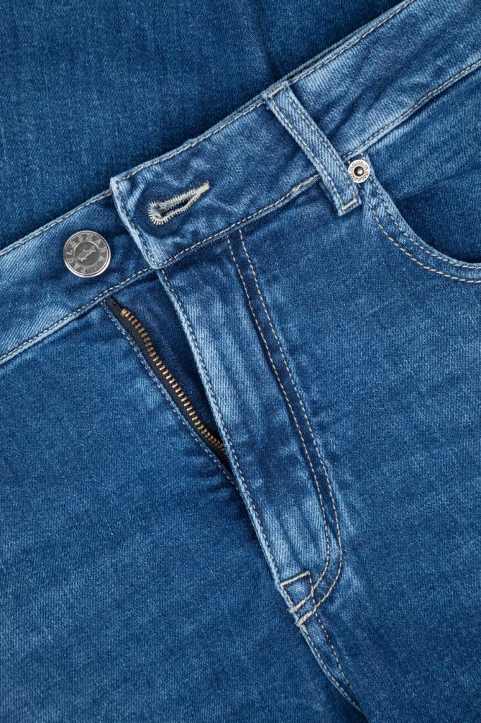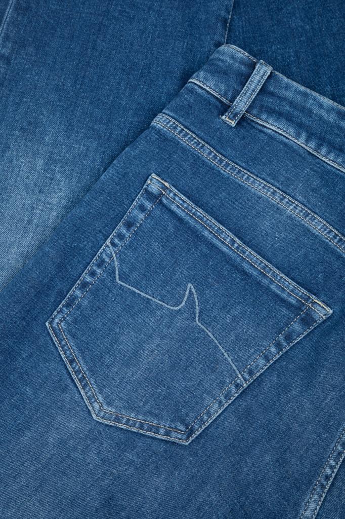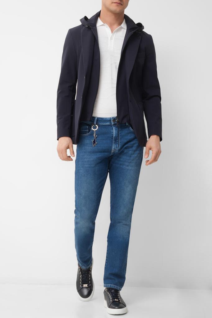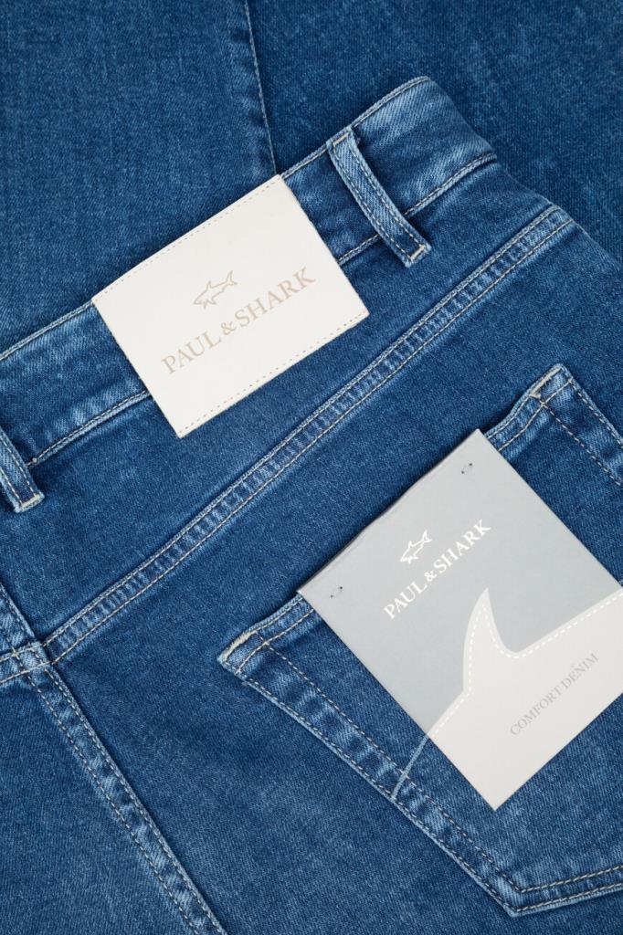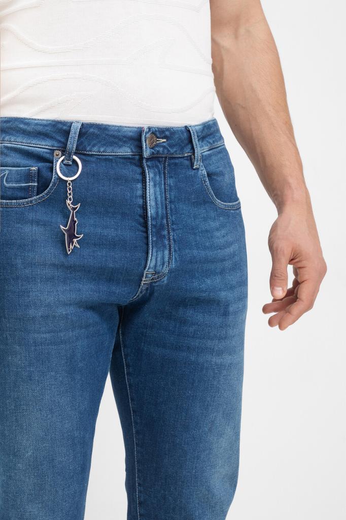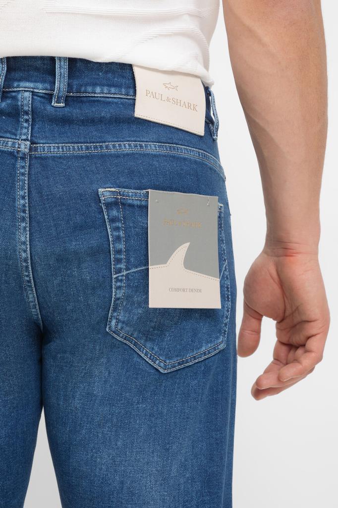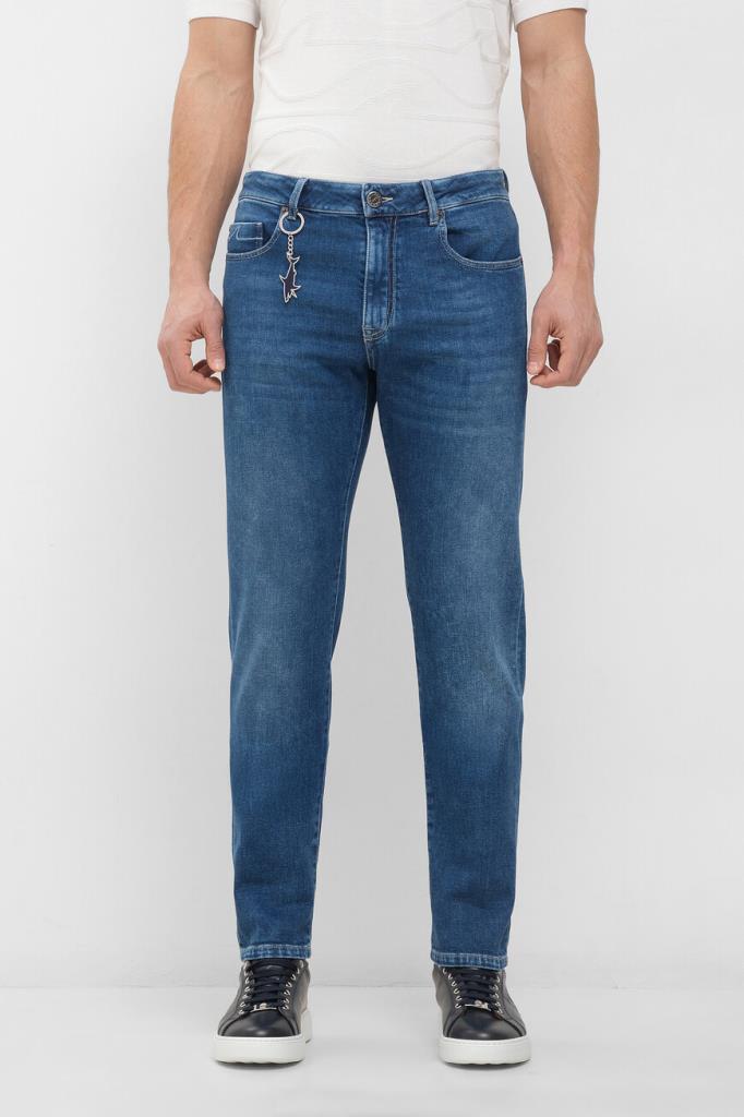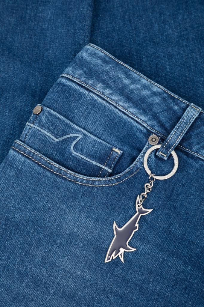 Джинсы из эластичного хлопкового денима Comfort Stretch от бренда Paul&Shark. Модель, окрашенная в синий оттенок с финишной обработкой ферментами, отличается наличием дизайнерских потёртостей и прострочкой на швах. О принадлежности изделия с классическим пятикарманным дизайном Дому напоминают прямоугольная накладка с эмблемой и надписью-лого на поясе сзади, вывязанные голубые силуэты острого плавника акулы на маленьком кармане спереди и задних карманах и тёмно-синий эмалированный брелок.