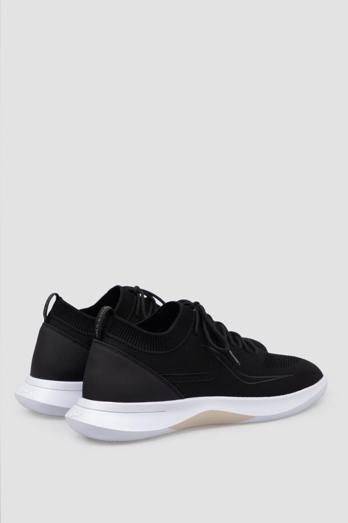 Чёрные сникеры Shark-Wave от бренда Paul&Shark. Для создания модели с закрытой перекрёстной шнуровкой выбран водоотталкивающий спортивный текстиль на основе лёгкого полиэфира стрейч с разными текстурами. Конструкция изделия предполагает наличие резинки для комфортной посадки на ноге в верхней части и укреплённого гладкой воловьей кожей в тон задника. Гибкая амортизирующая подошва из ЭВА контрастного оттенка дополнена светло-коричневыми вставками по бокам и тиснёной полосой сзади.
