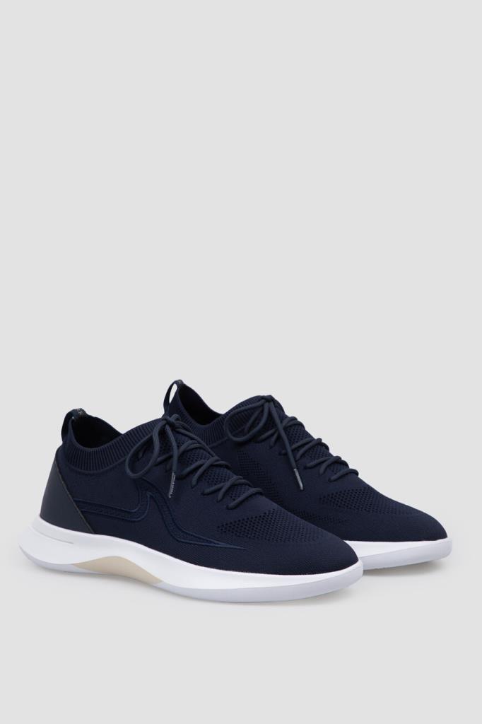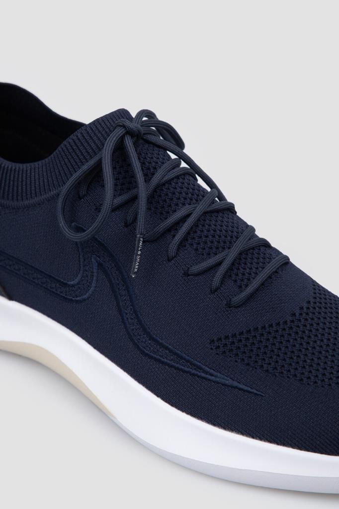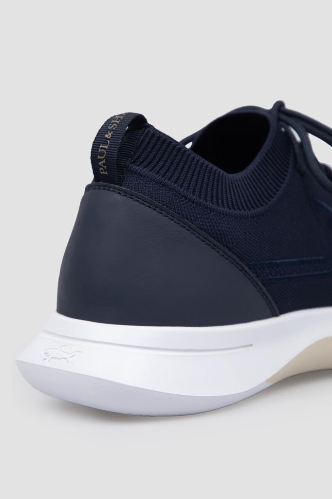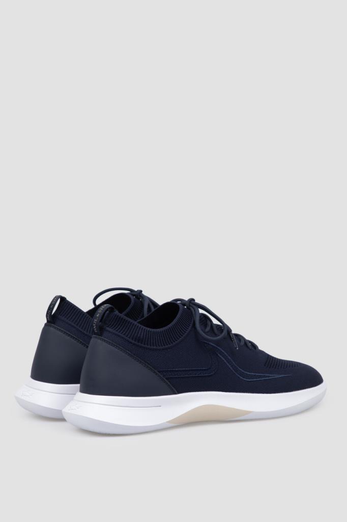 Сникеры на гибкой подошве из ЭВА белого цвета от бренда Paul&Shark. Изделие выполнено из водоотталкивающего спортивного текстиля на основе лёгкого полиэфира стрейч синего цвета с разными текстурами. Задник укреплён вставкой из гладкой воловьей кожи в тон, а боковины декорированы рельефной вышивкой в виде острого плавника акулы в технике интарсия. Верх удобной пары оснащён резинкой для комфортной посадки на ноге.