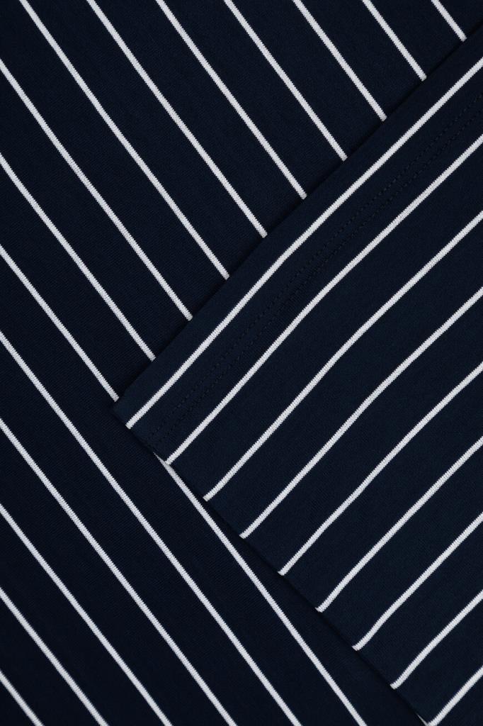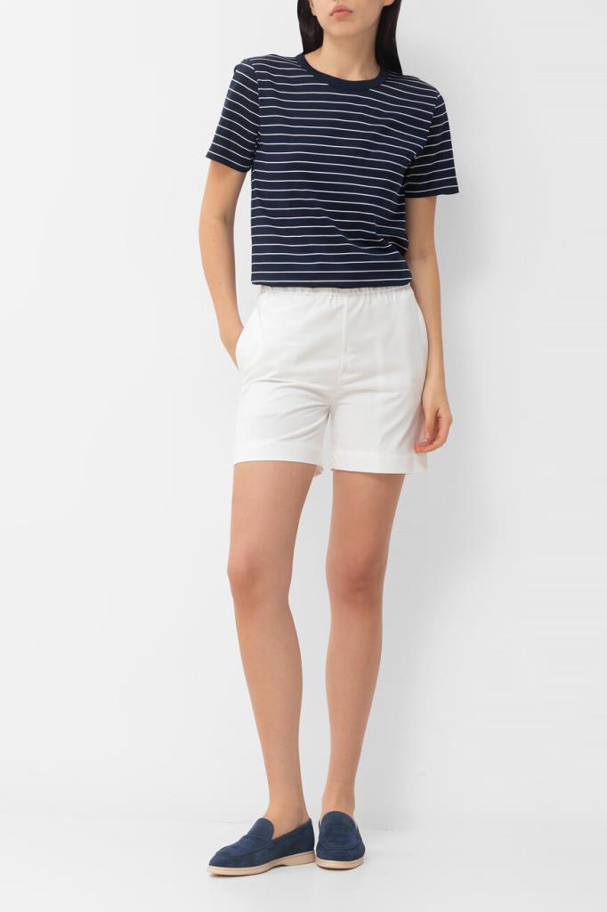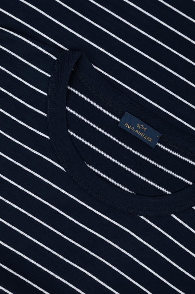 Хлопковая футболка Paul&Shark выполнена в тёмно-синем и белом тонах. Поверхность изделия покрыта геометрическим мотивом в виде тонких горизонтальных полос. На принадлежность модели прямого силуэта Дому указывает серебристый прямоугольный лейбл с гравировкой. Футболка будет смотреться выигрышно в комплекте с белыми бермудами из той же коллекции.
