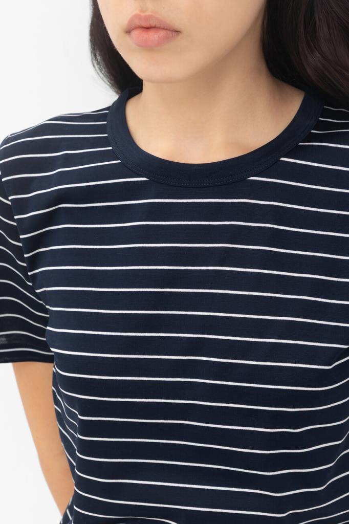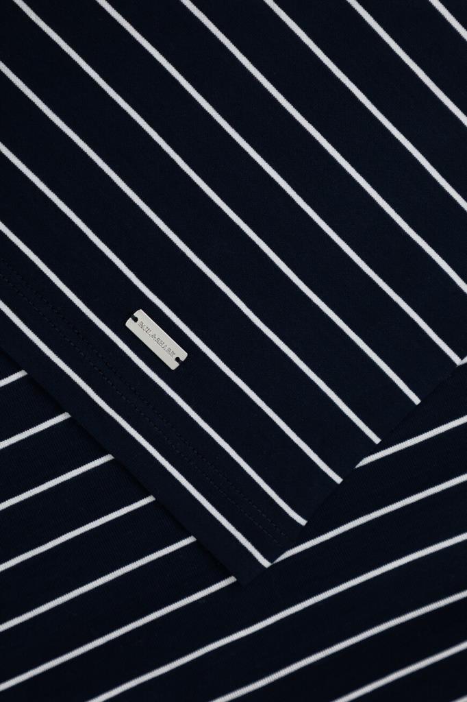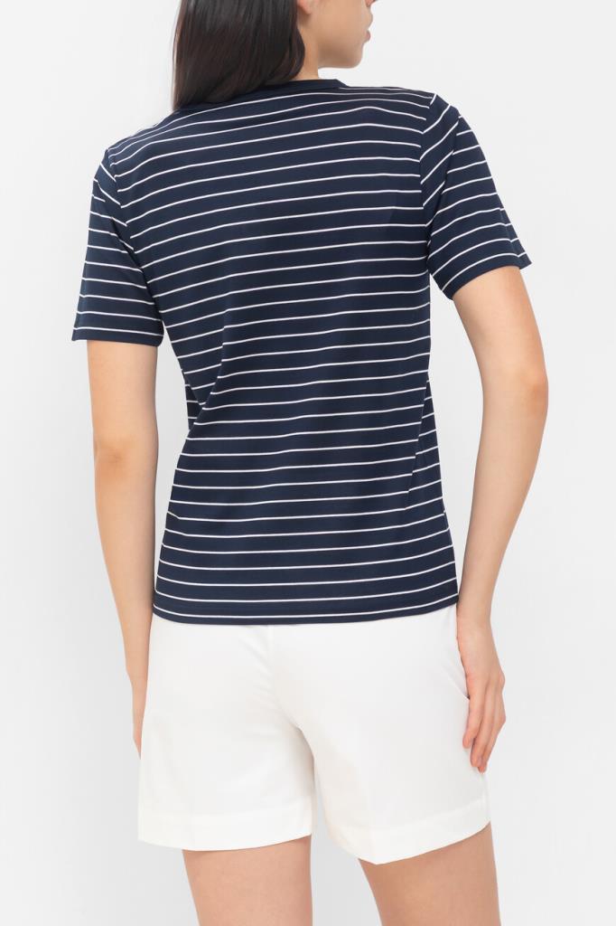Хлопковая футболка Paul&Shark выполнена в тёмно-синем и белом тонах. Поверхность изделия покрыта геометрическим мотивом в виде тонких горизонтальных полос. На принадлежность модели прямого силуэта Дому указывает серебристый прямоугольный лейбл с гравировкой. Футболка будет смотреться выигрышно в комплекте с белыми бермудами из той же коллекции.