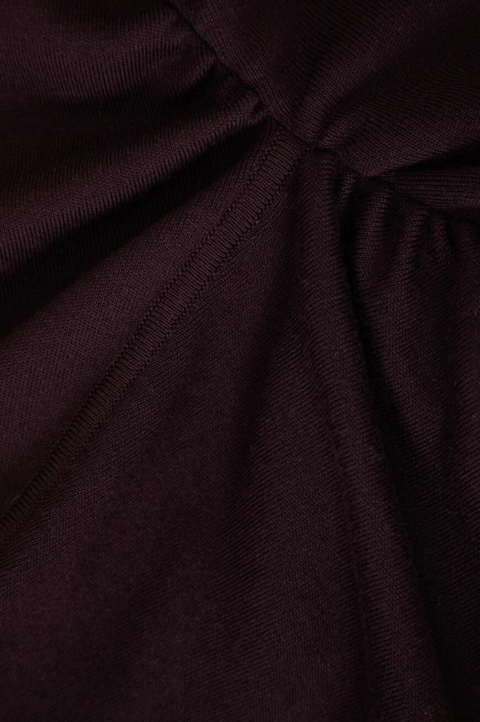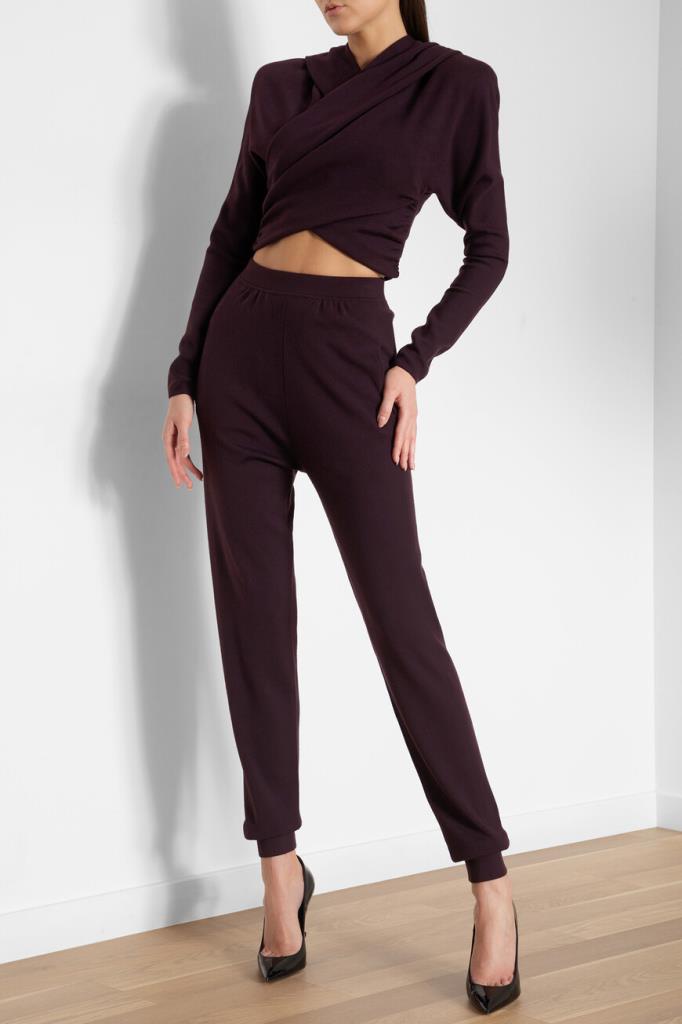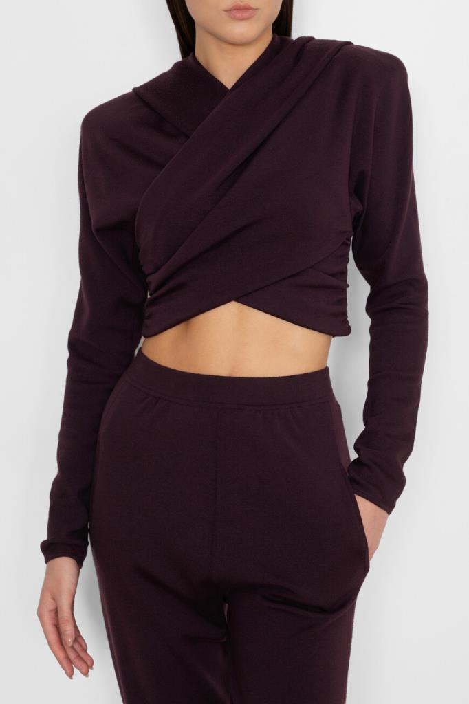 Укороченный топ бордового оттенка от бренда Saint Laurent. Модель с объёмным капюшоном сшита из мягкой натуральной шерсти. Фасон изделия предполагает облегающий крой и длинные рукава с мягкими плечами. Дополните образ брюками в спортивном стиле из той же коллекции.