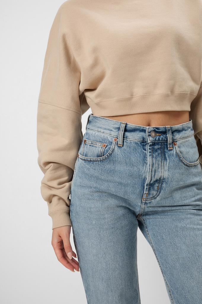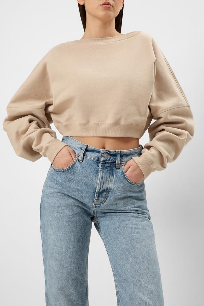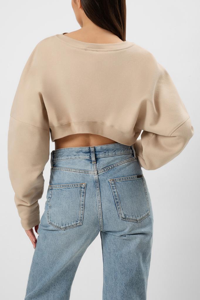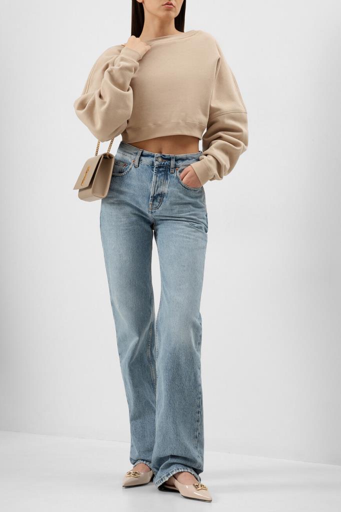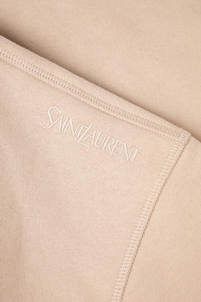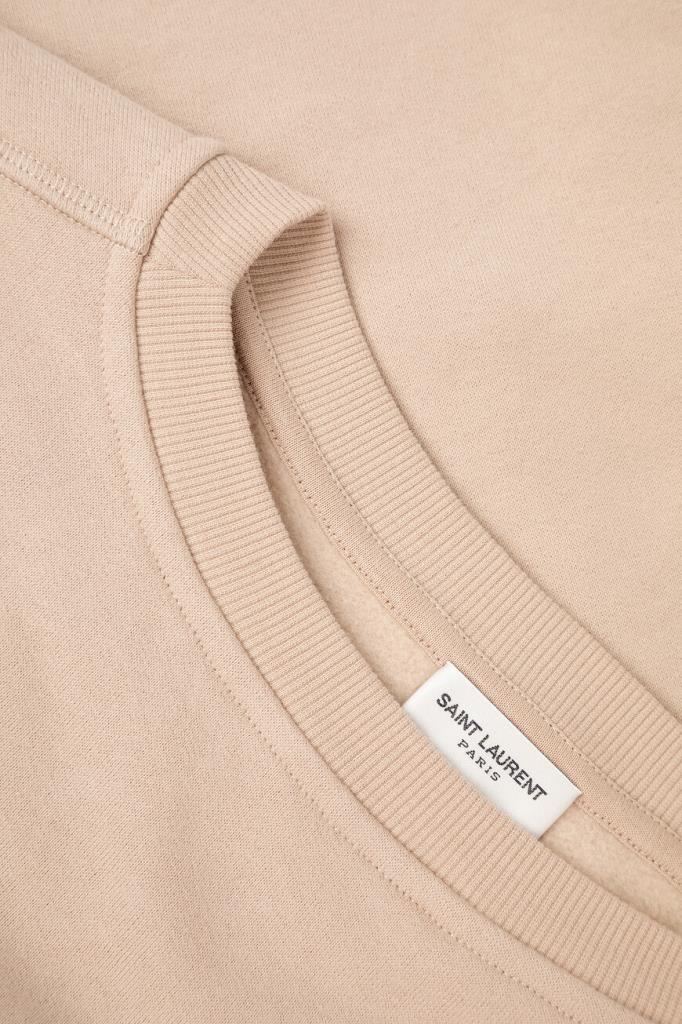 Хлопковый свитшот с широкой горловиной от бренда Saint Laurent. Органический хлопок сертифицирован GOTS и выращивается в окружающей среде без использования каких-либо пестицидов и химических веществ. Укороченную модель пудрового оттенка украшает крупный вышитый логотип, расположенный на рукаве. Отличительной особенностью изделия стал ассиметричный низ: задняя сторона свитшота короче передней и дополнена изящным округлым вырезом.